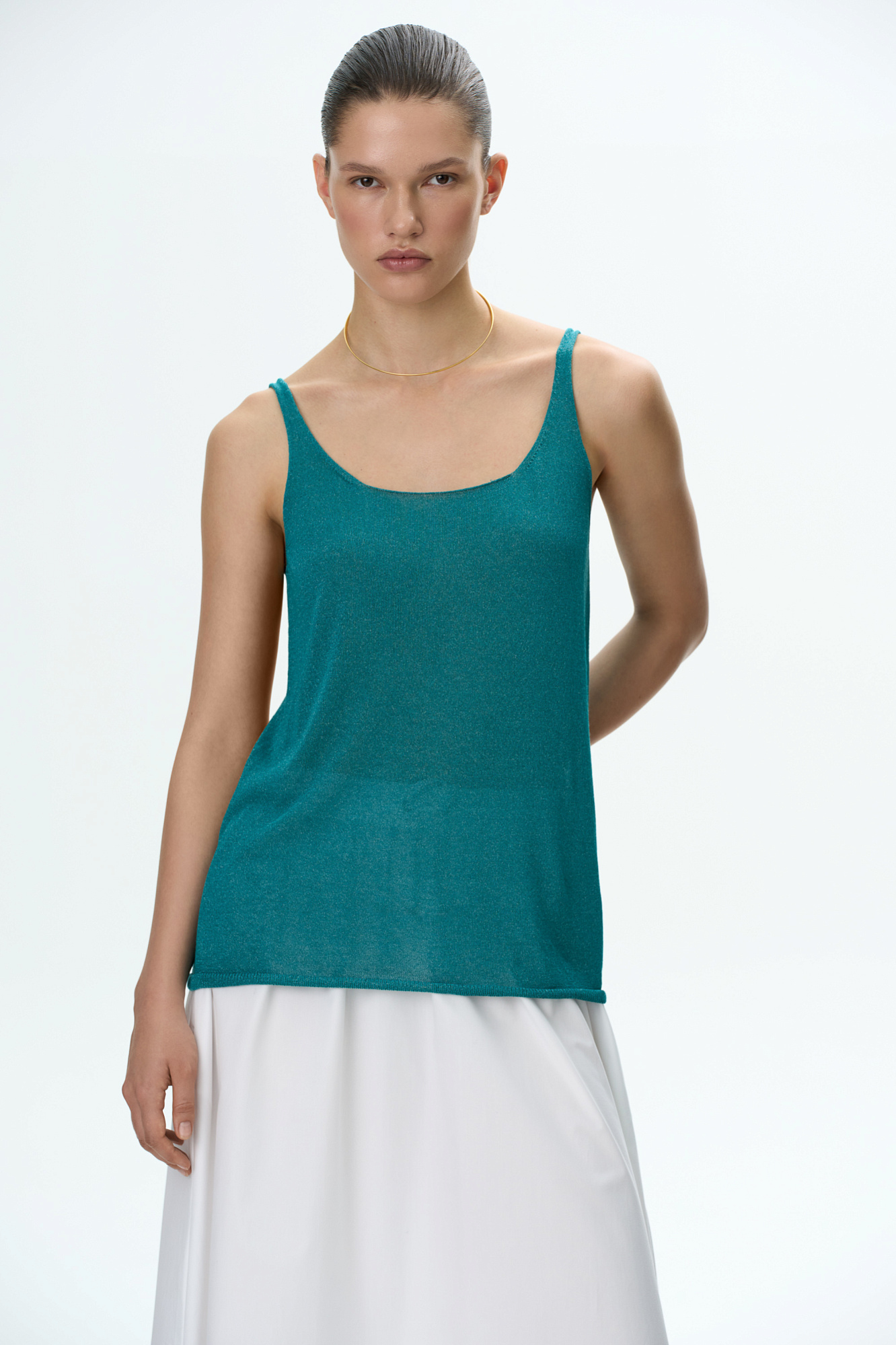 Цельновязаная полупрозрачная майка из вискозы. Круглый вырез и тонкие бретели.