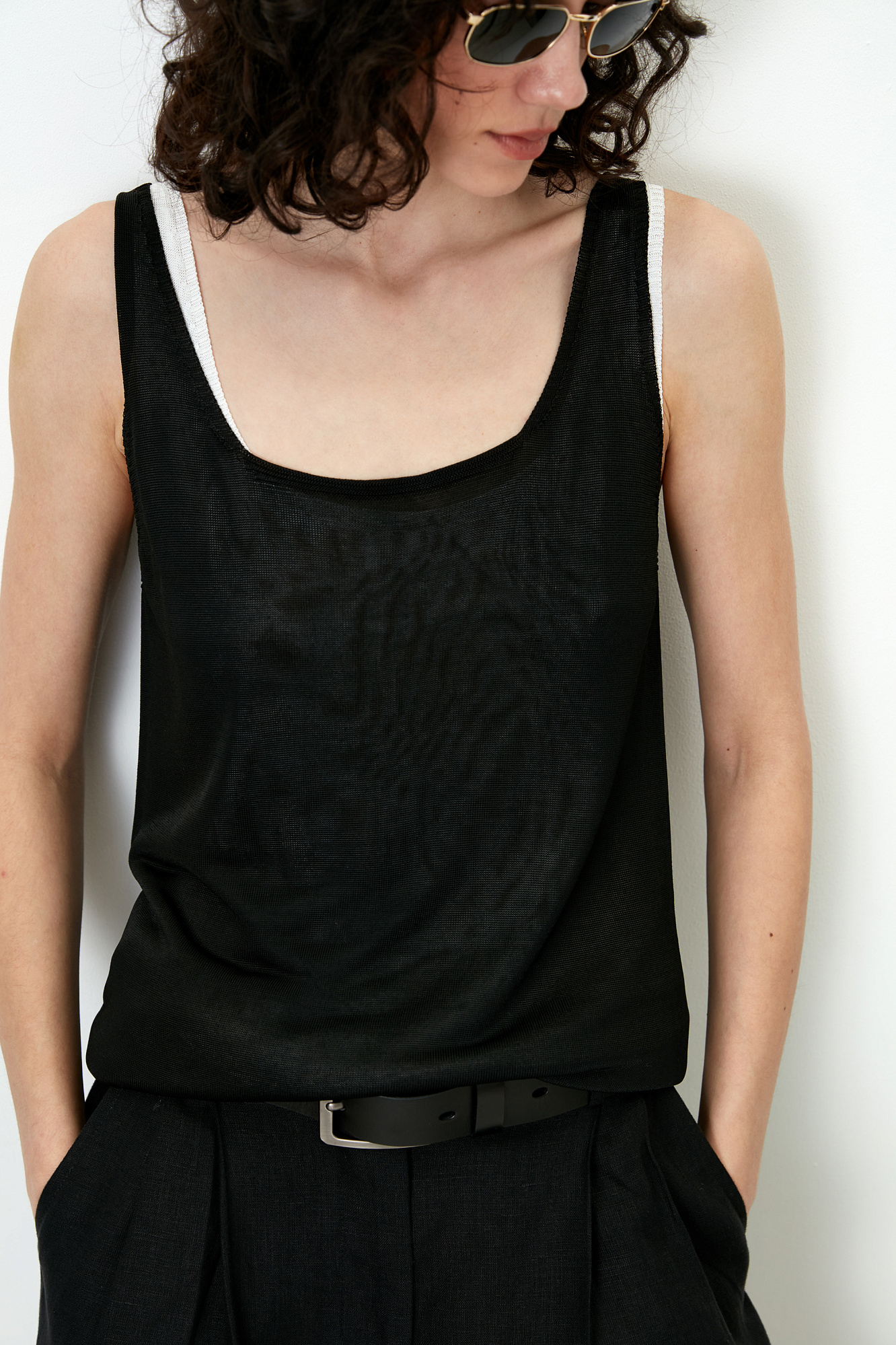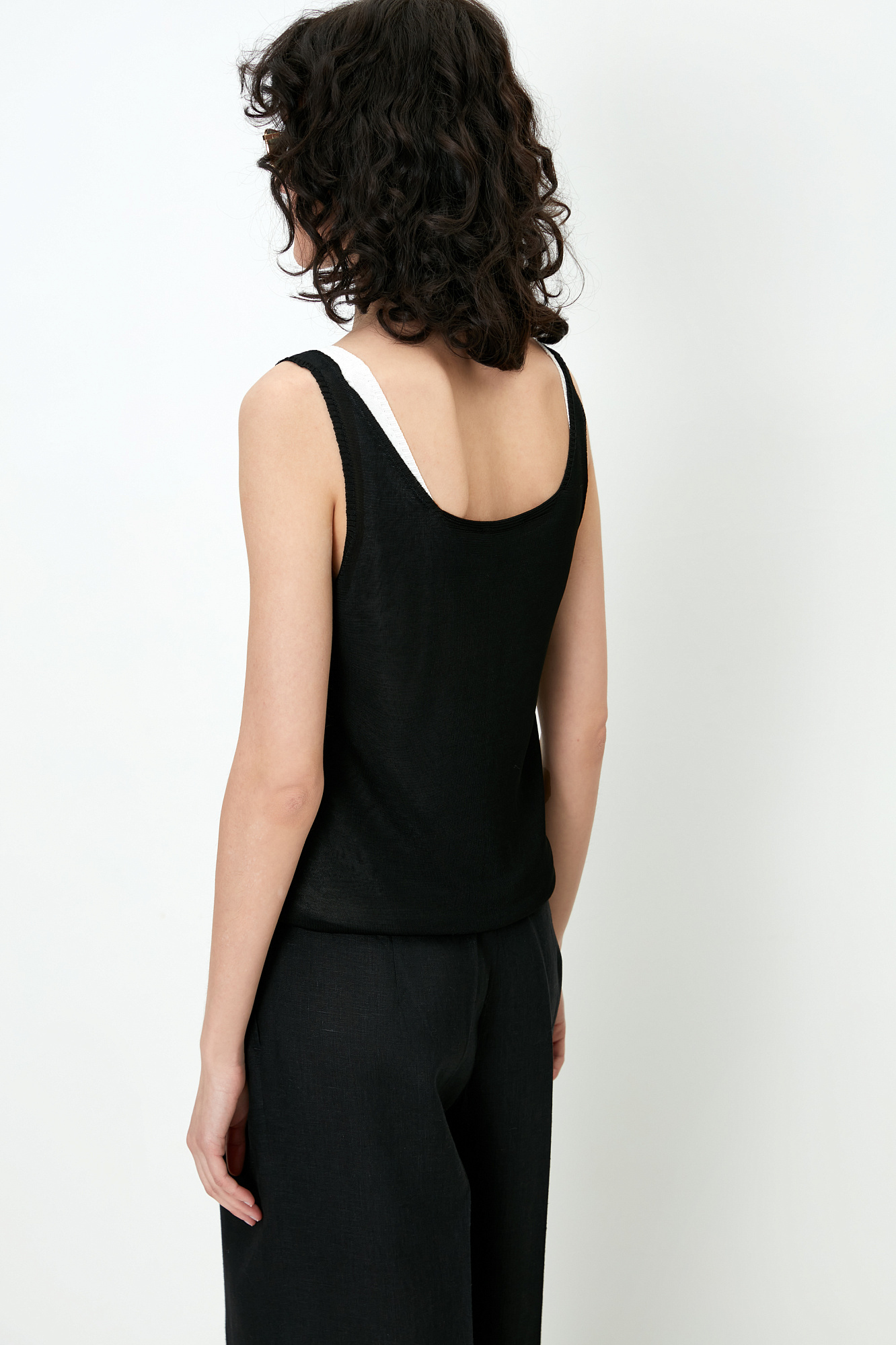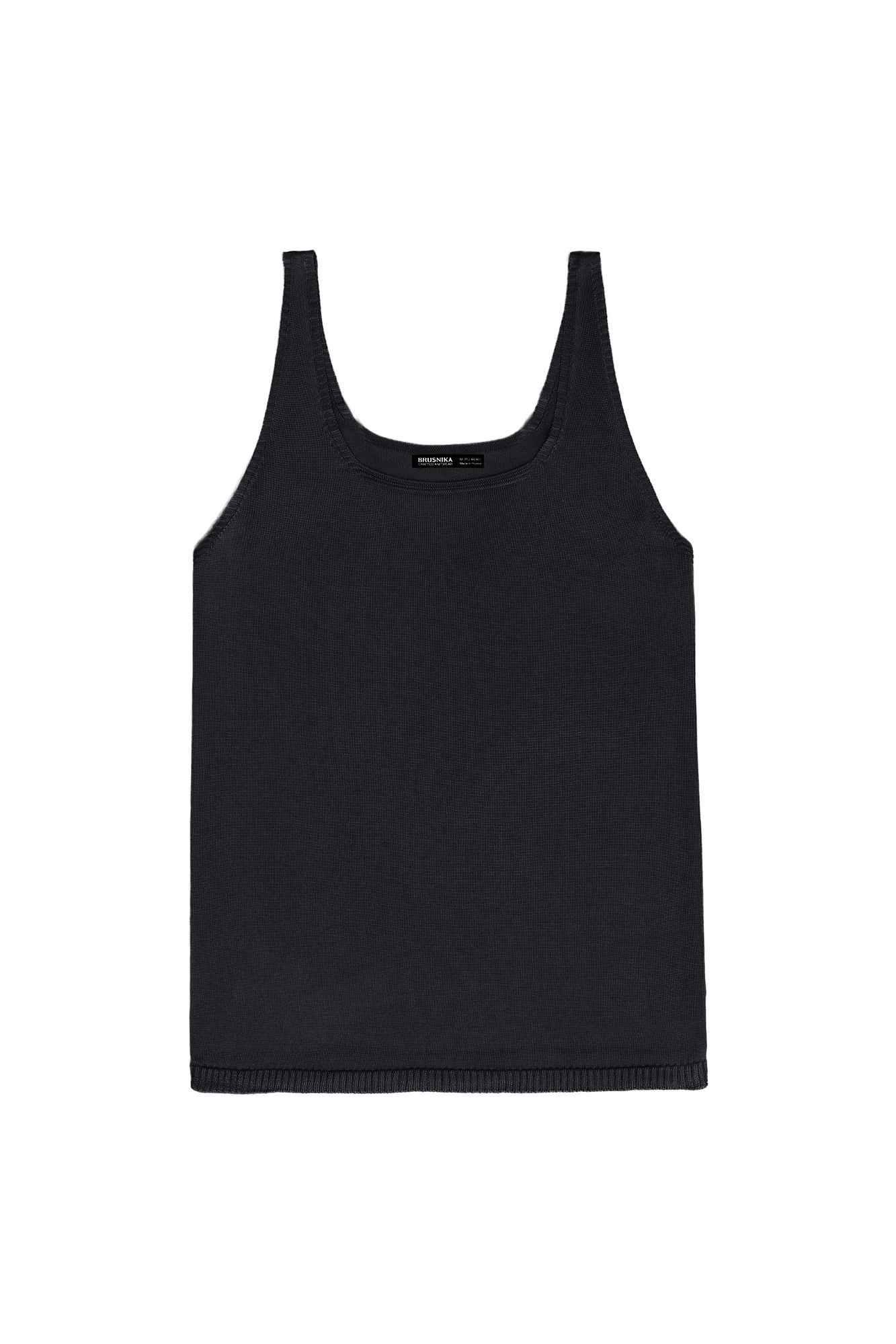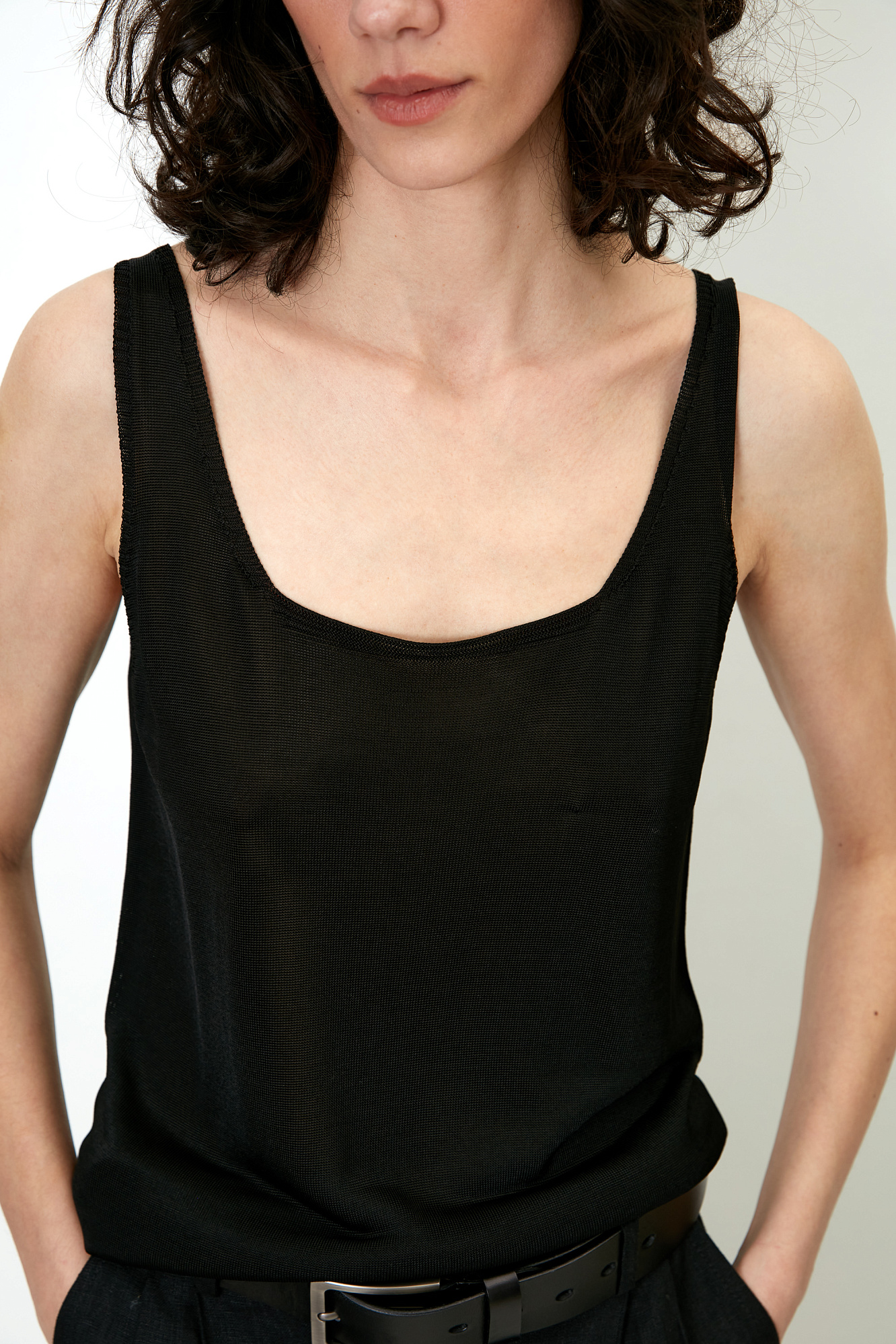 Цельновязаная майка из 100% вискозы на тонких бретелях.