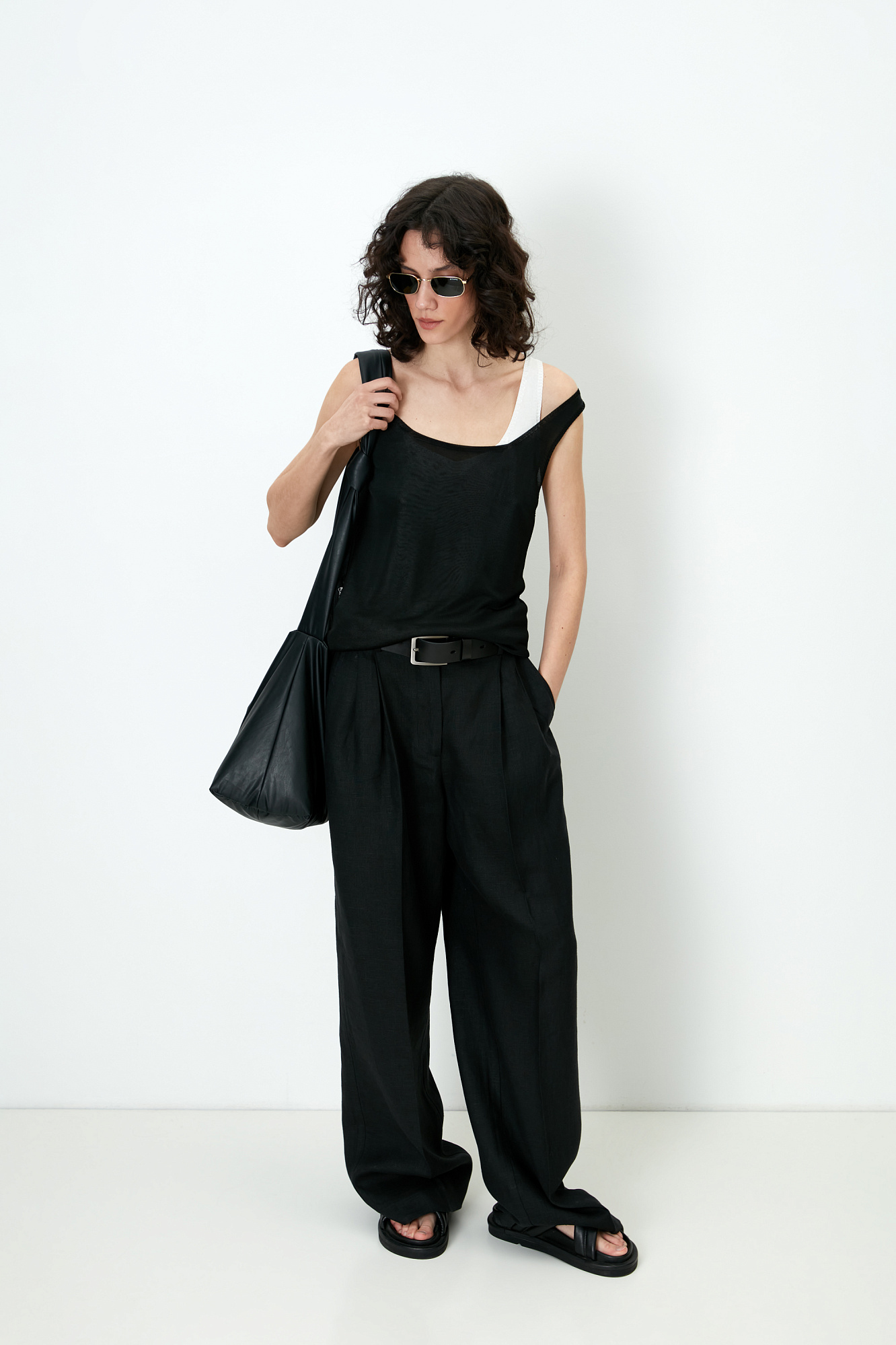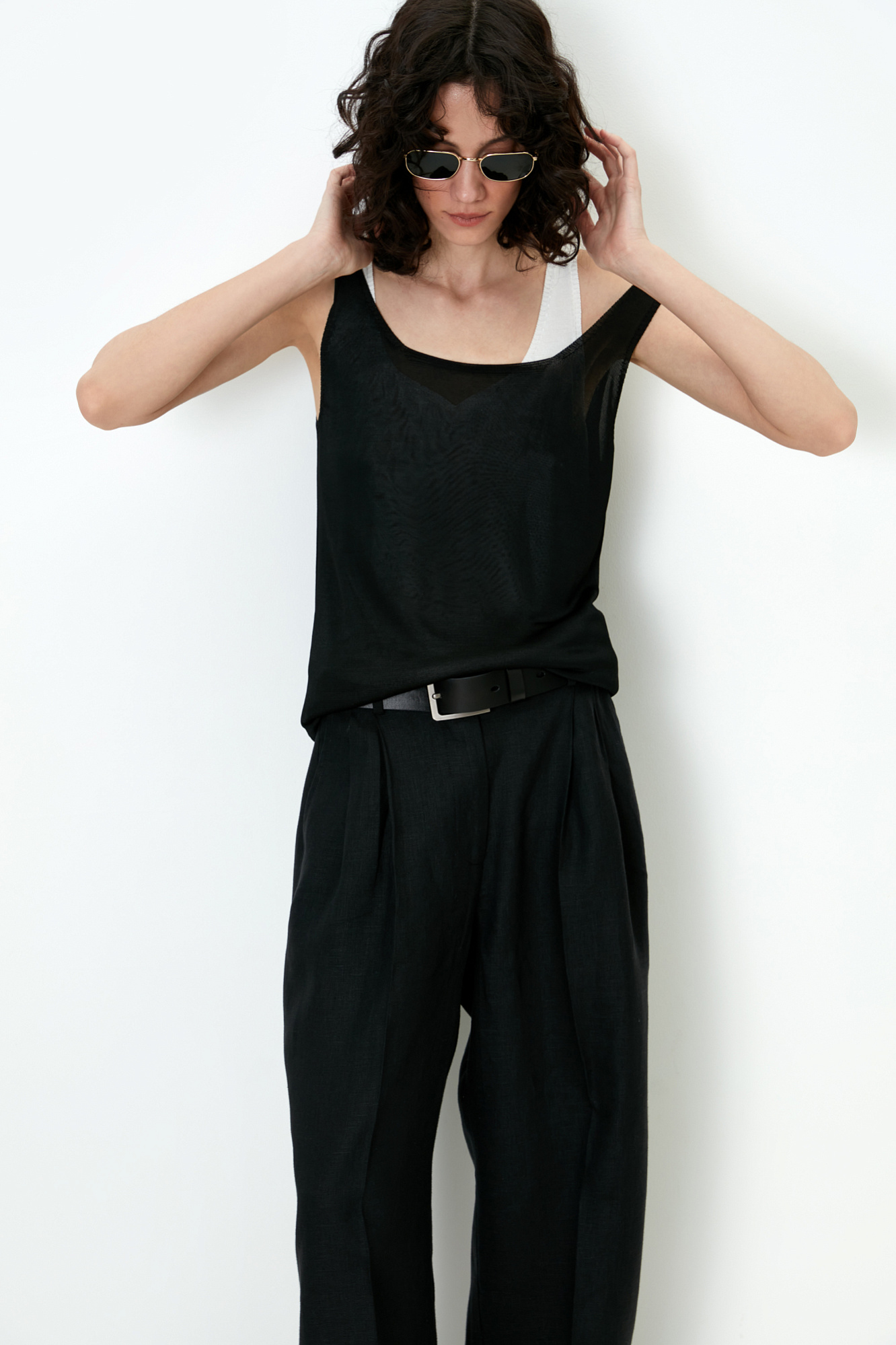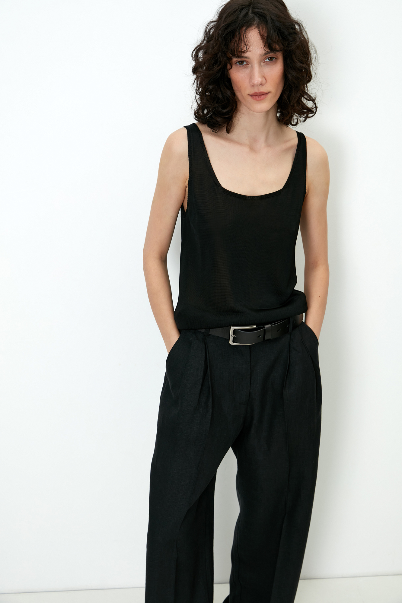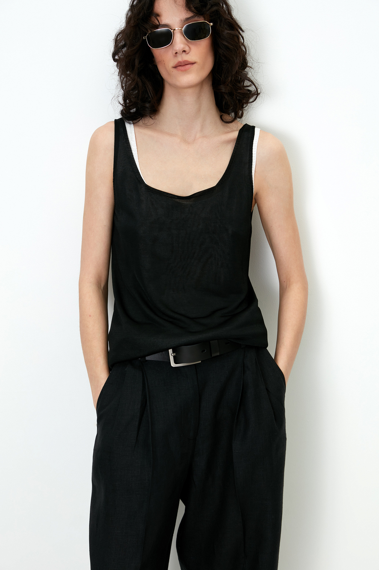Цельновязаная майка из 100% вискозы на тонких бретелях.