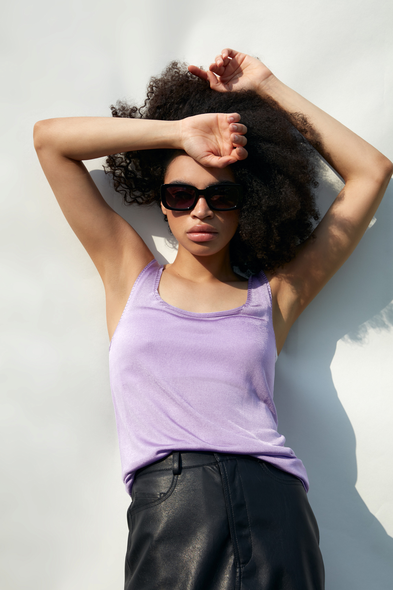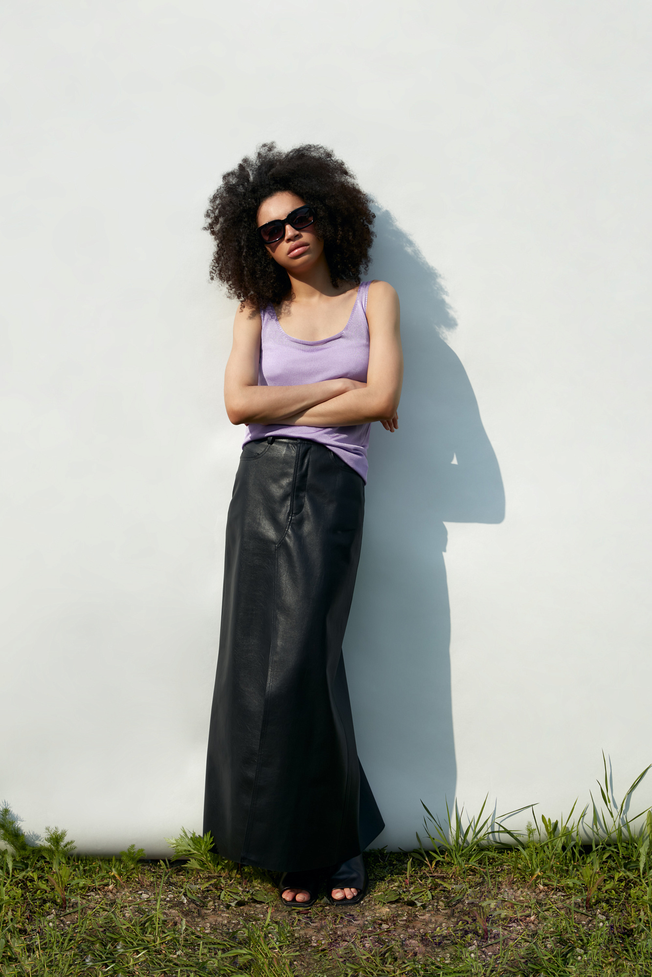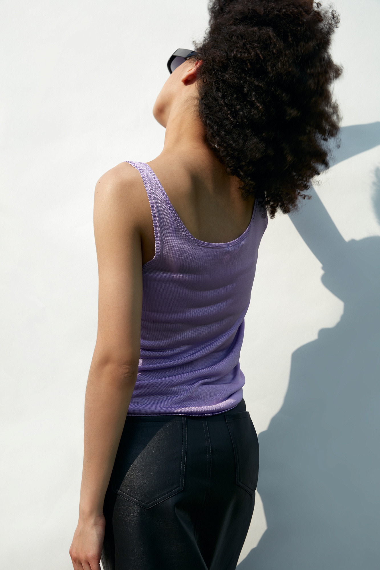 Цельновязаная майка из 100% вискозы на тонких бретелях.