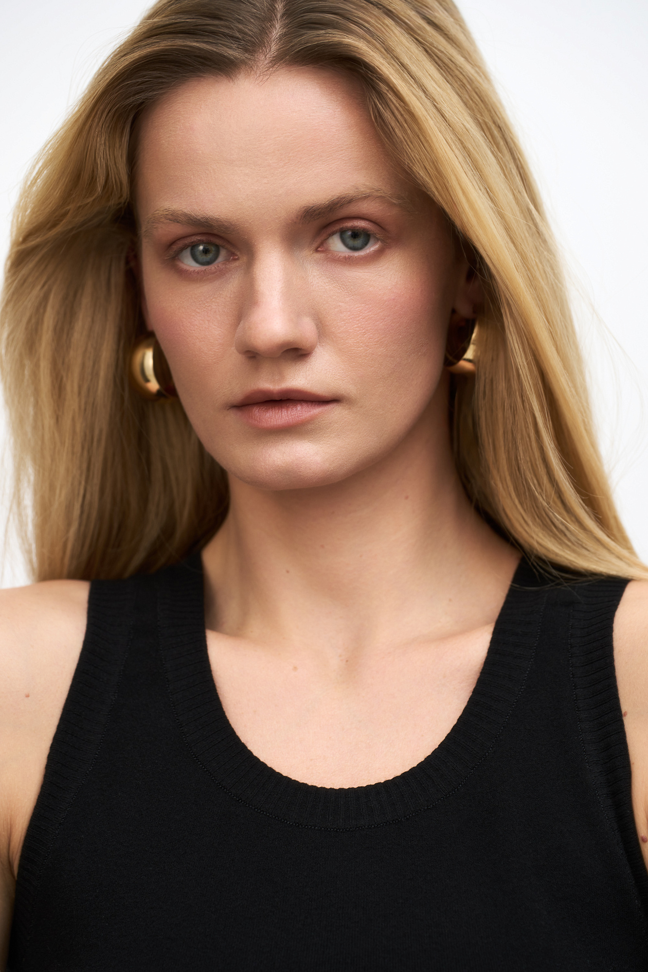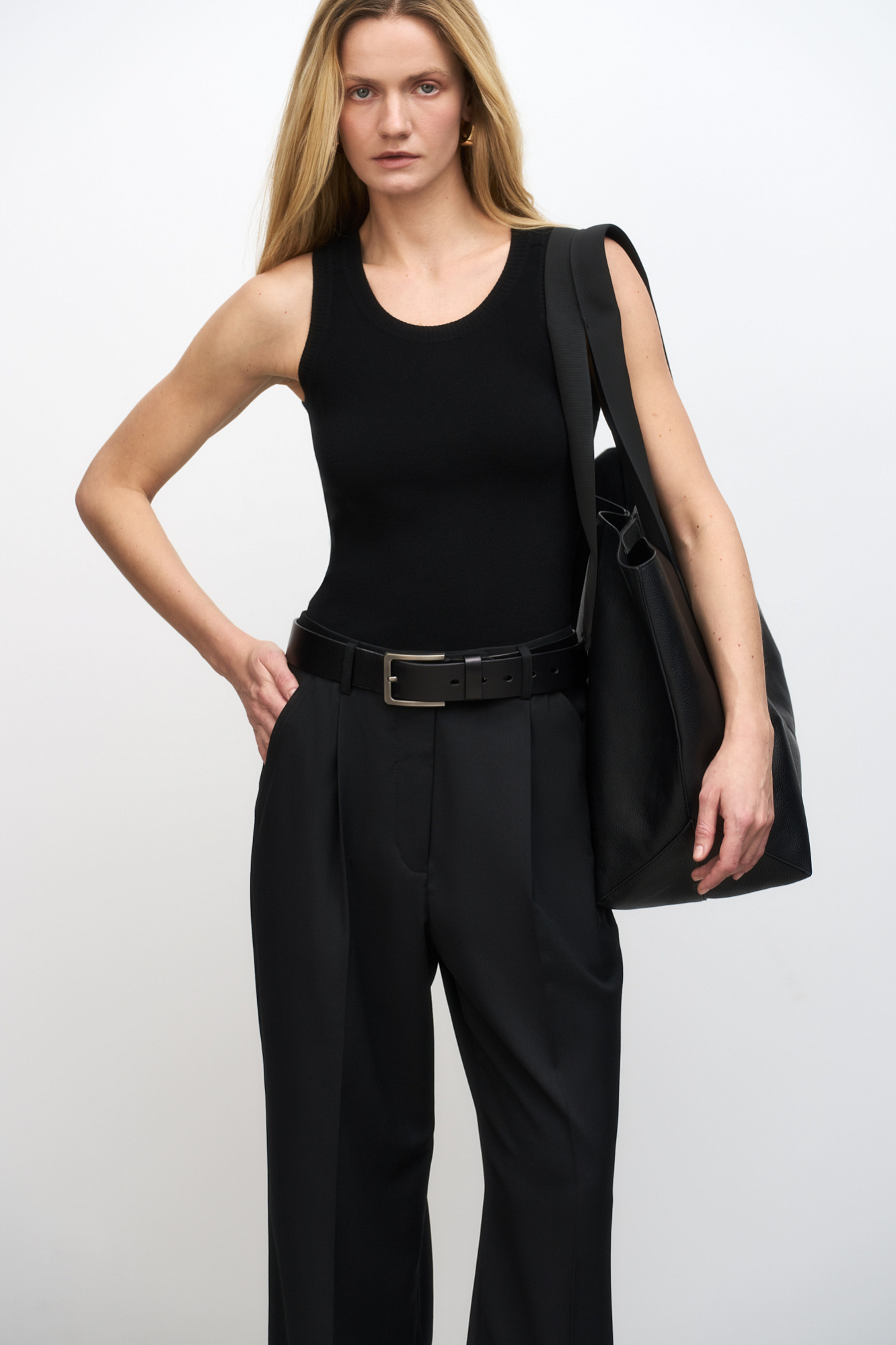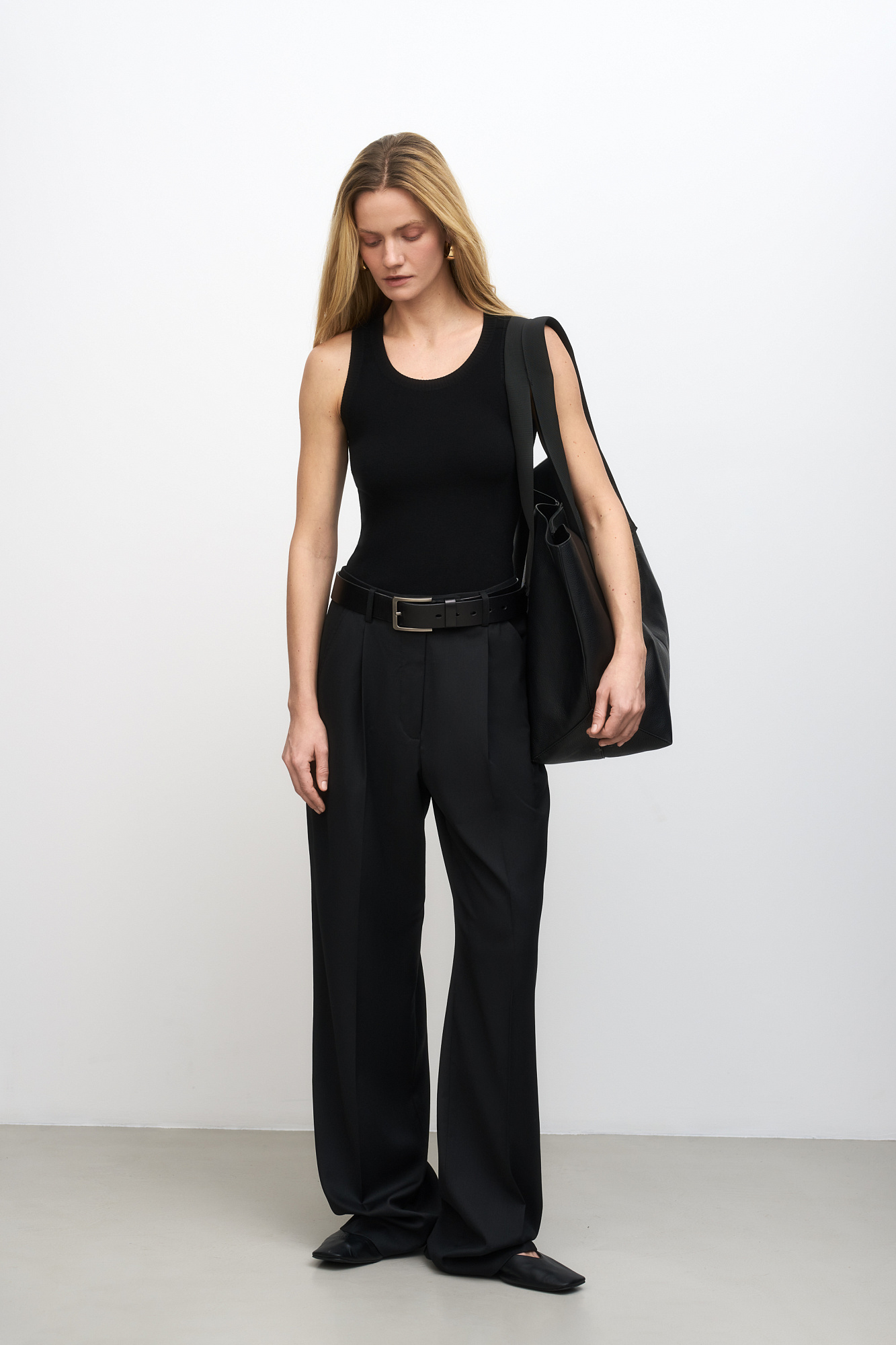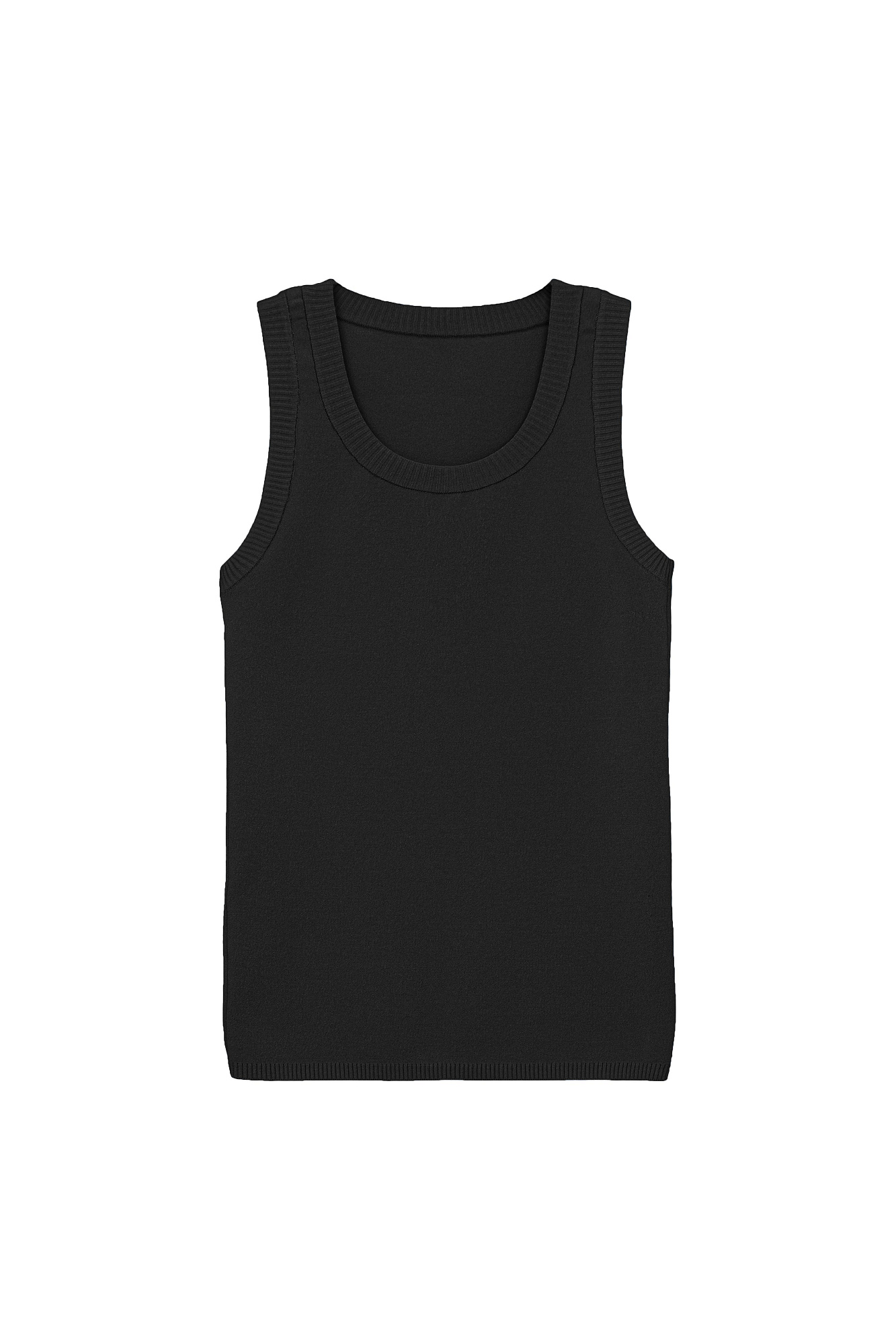 Удлиненная трикотажная майка из вискозы. Модель c круглым вырезом горловины, приталенным силуэтом, на широких бретельках, без рукавов.