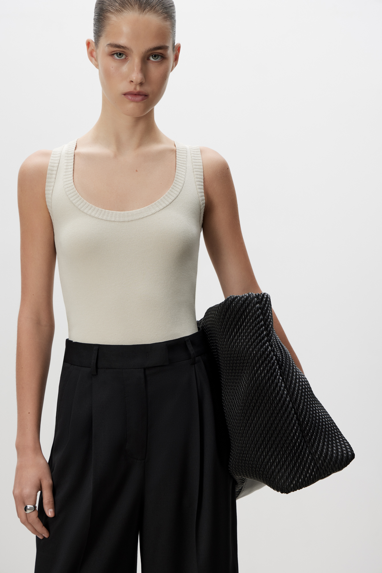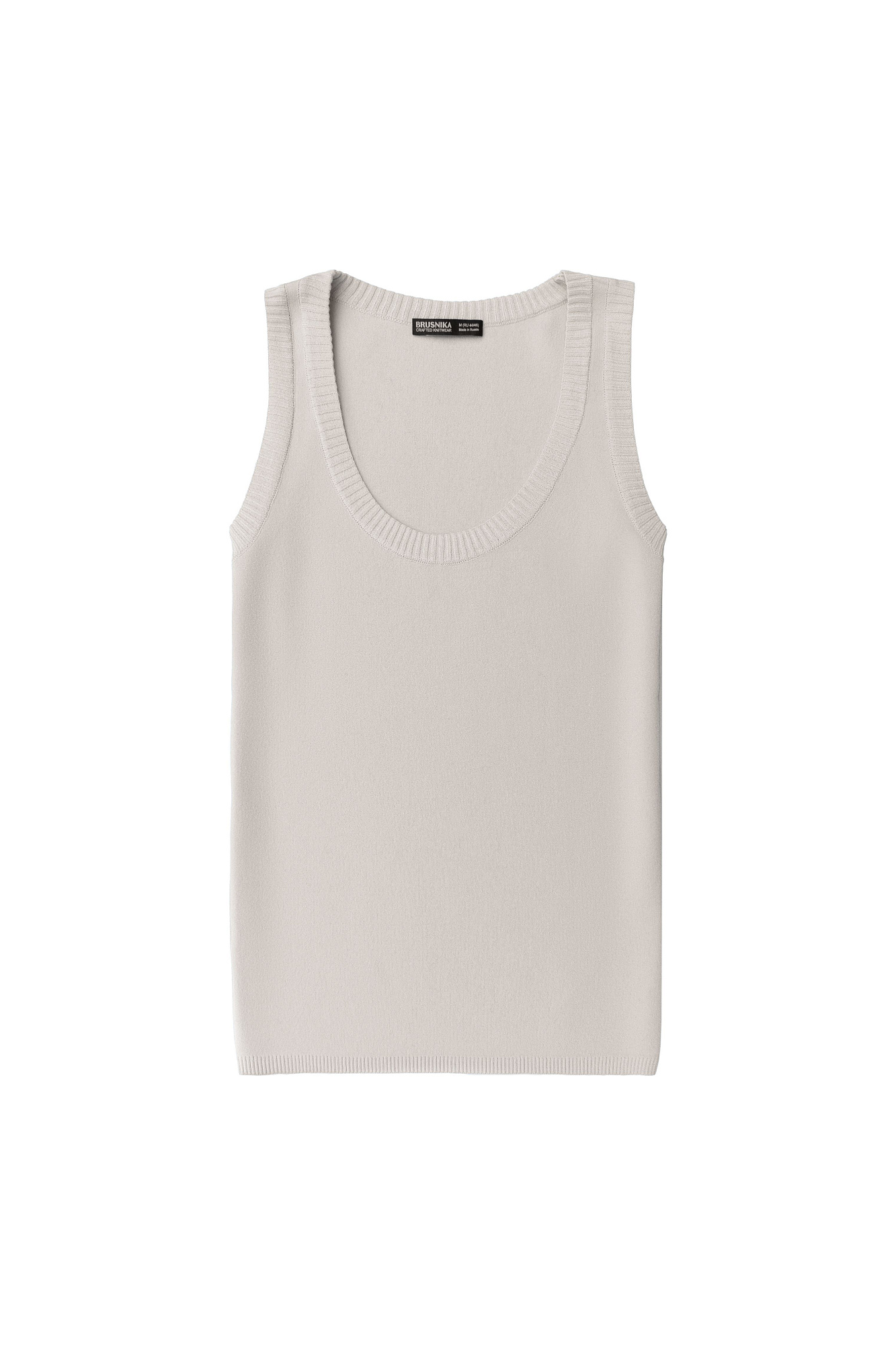 Удлиненная трикотажная майка из вискозы c круглым вырезом и открытыми плечами.