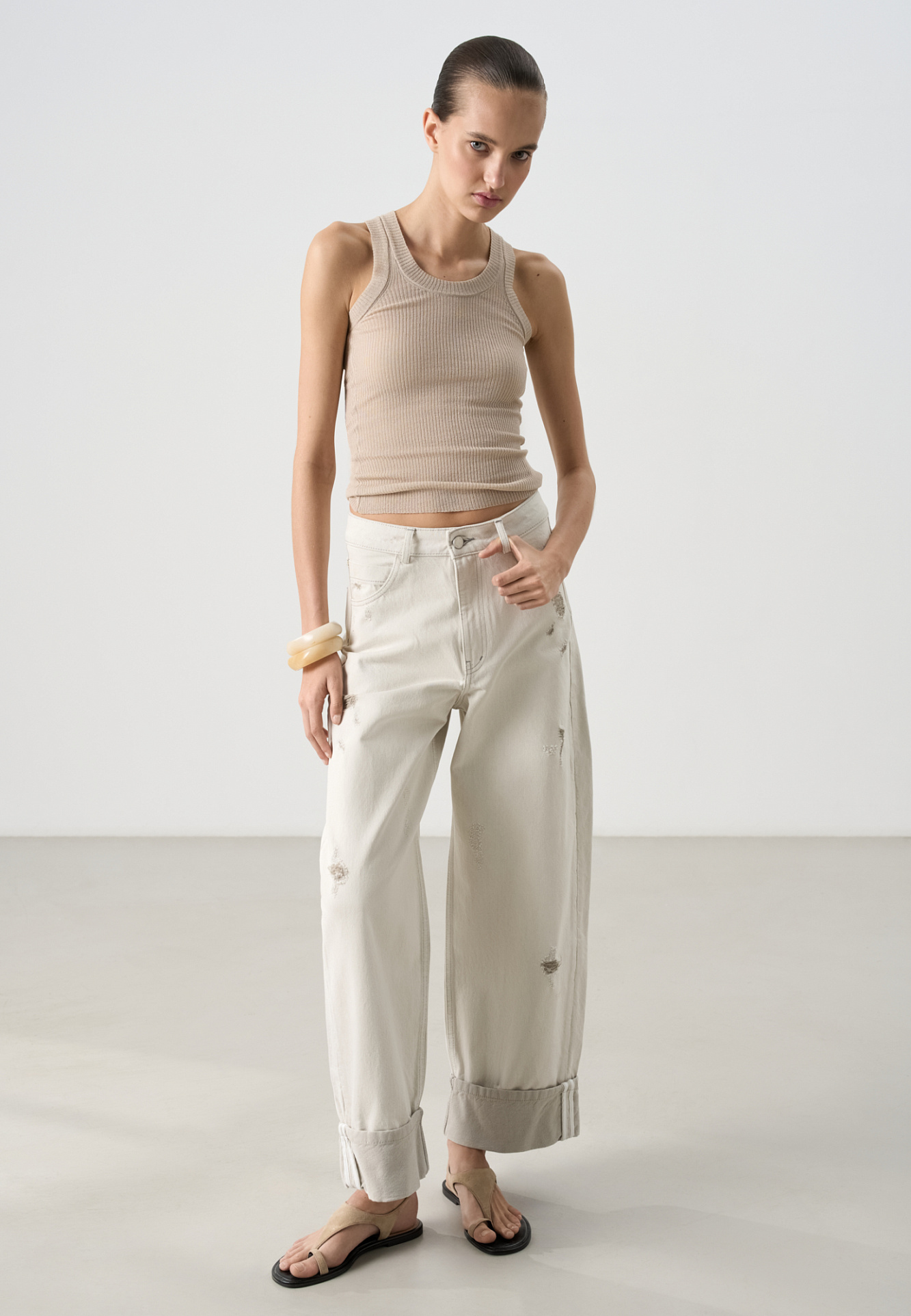 Трикотажный полупрозрачный топ из 100% хлопка. Модель приталенного силуэта, с глубокой проймой и круглым вырезом горловины. Изделие выполнено в рубчик.
