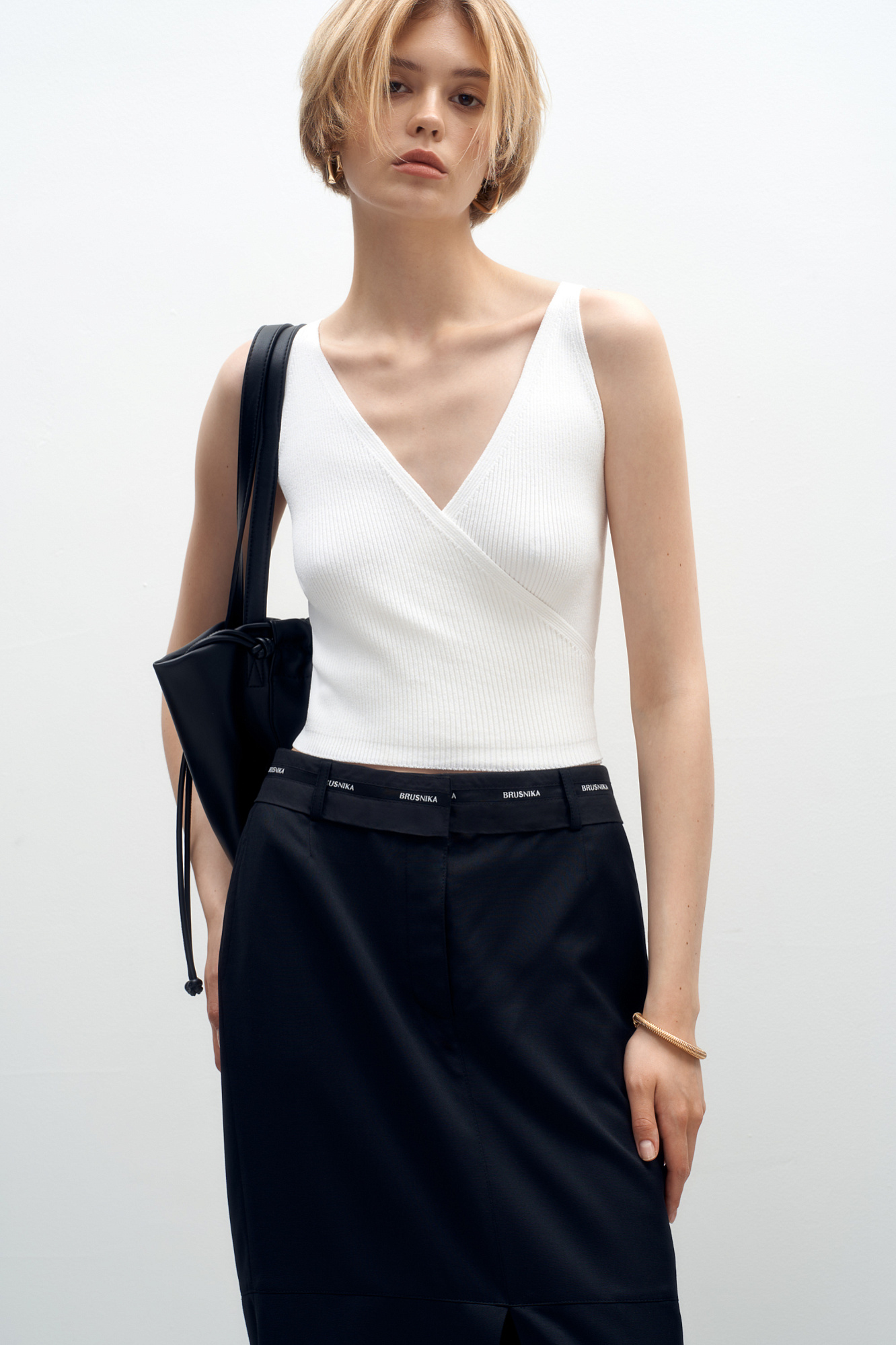 Трикотажный топ из вискозы. Модель приталенного силуэта с имитацией запаха. Изделие выполнено в рубчик.