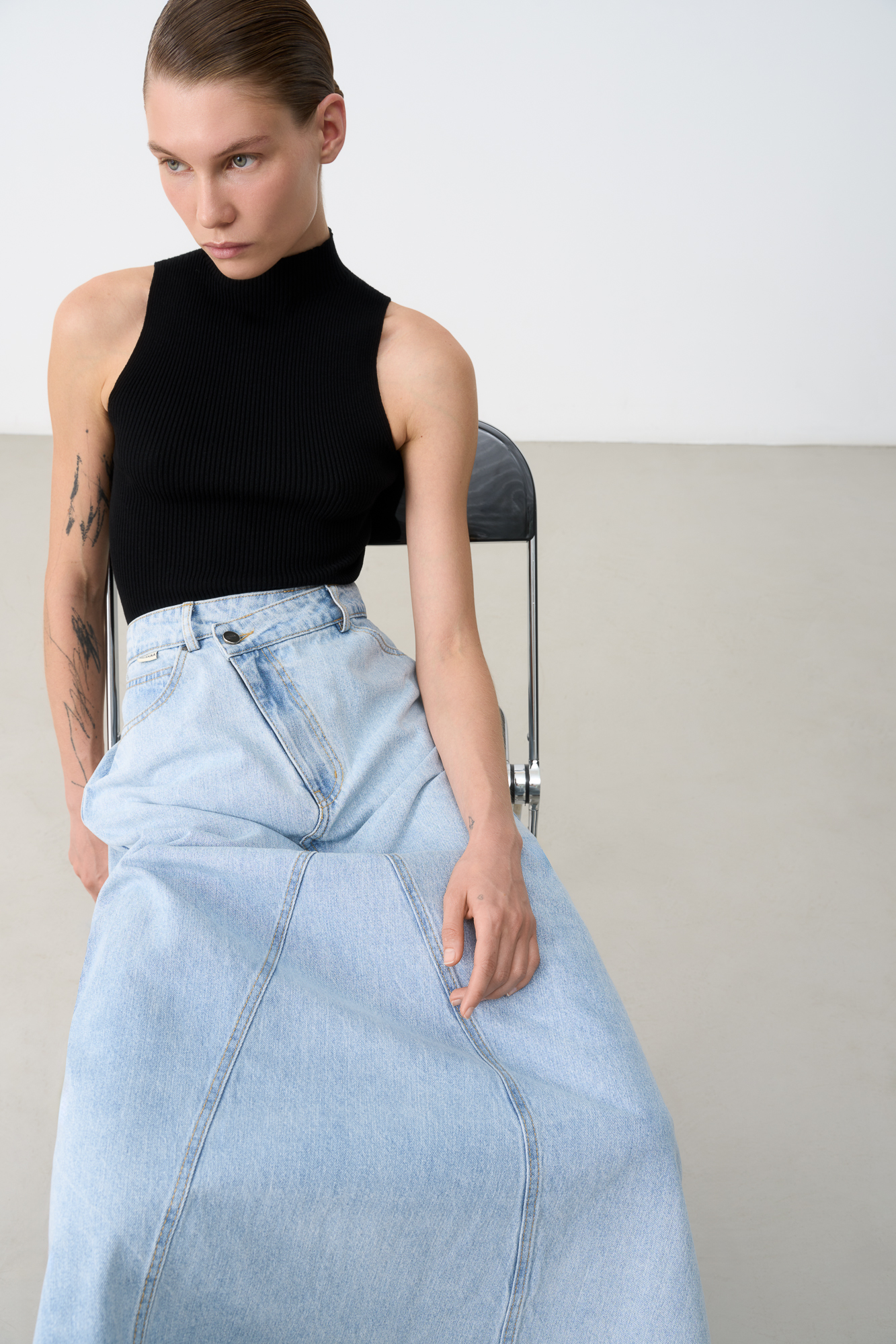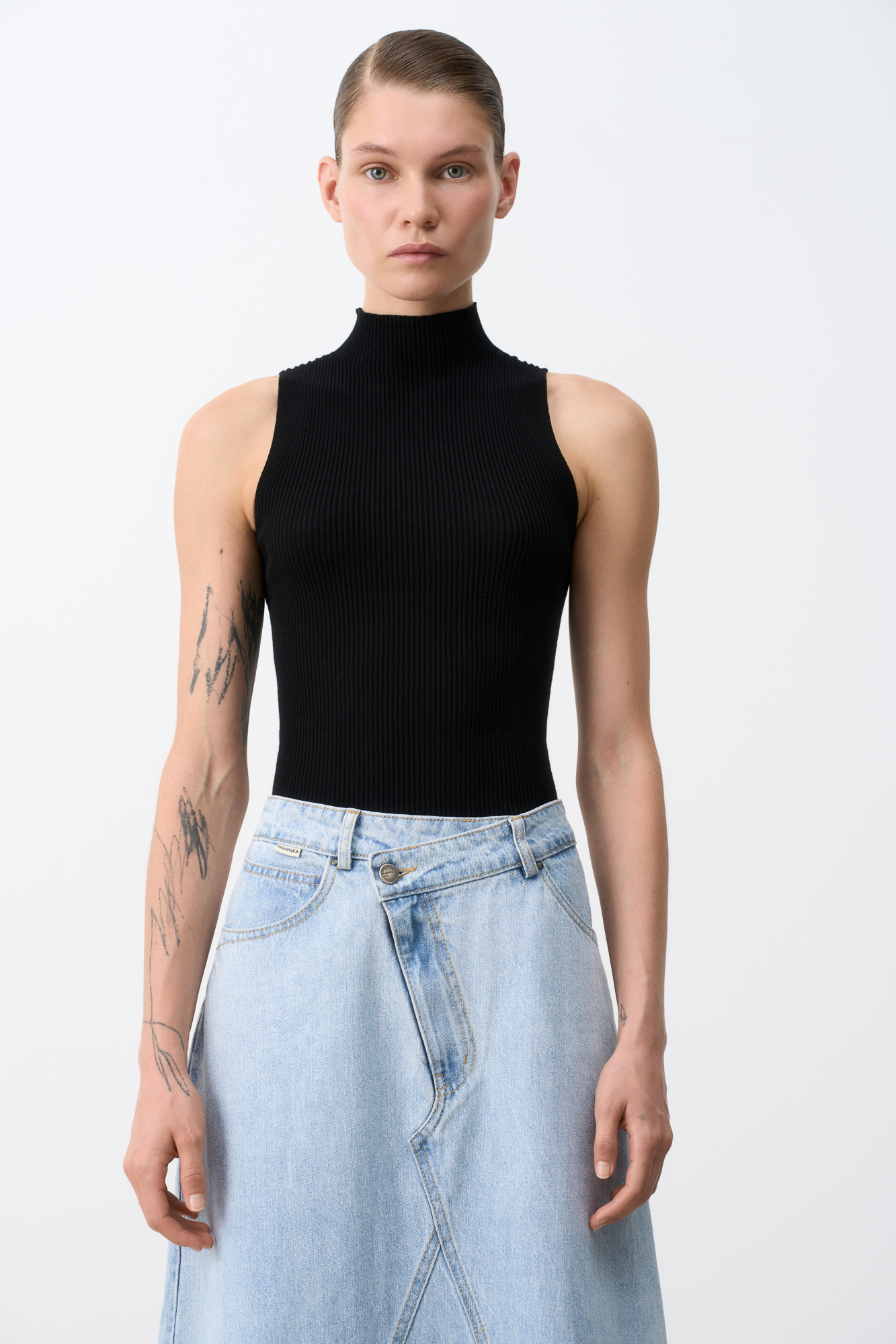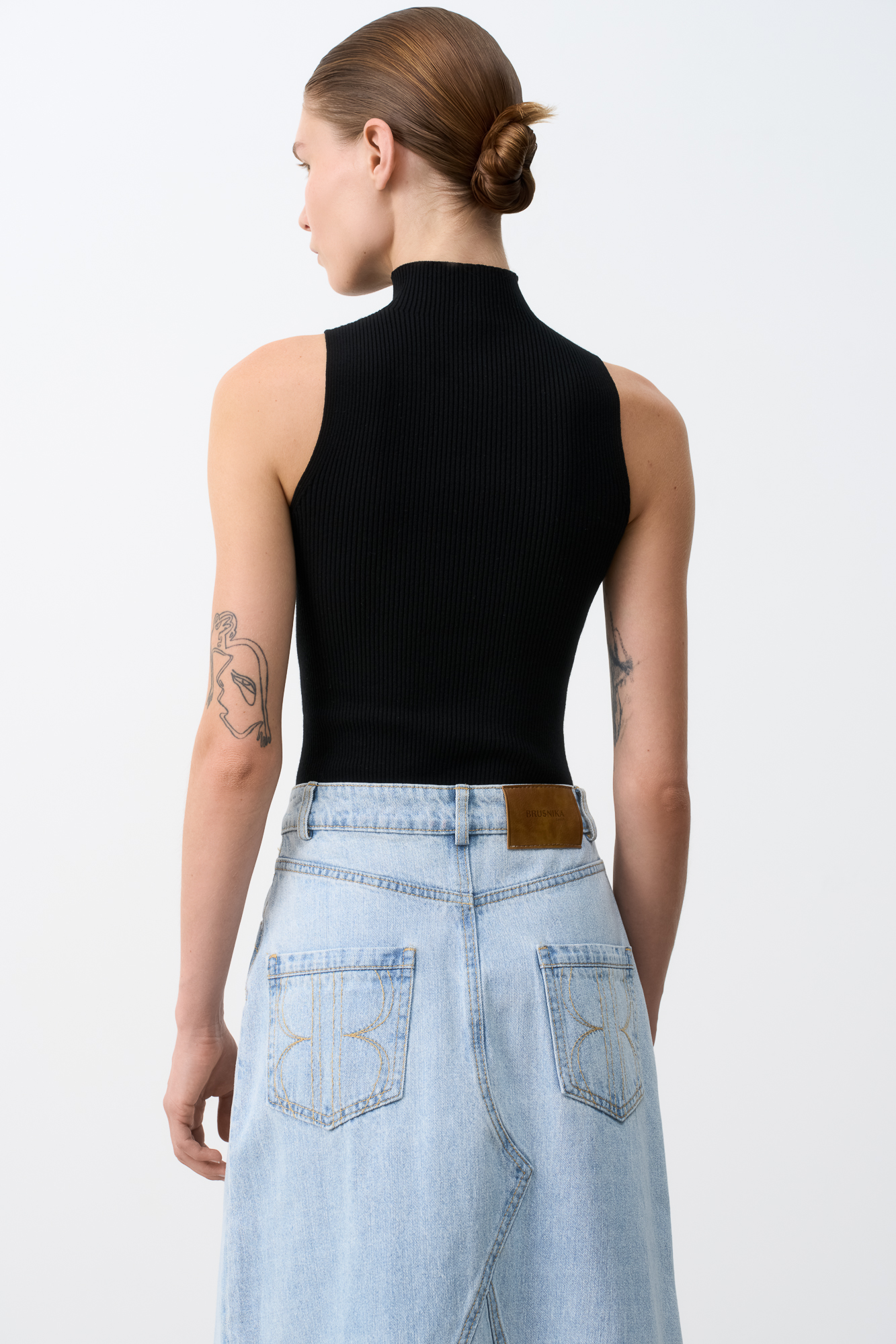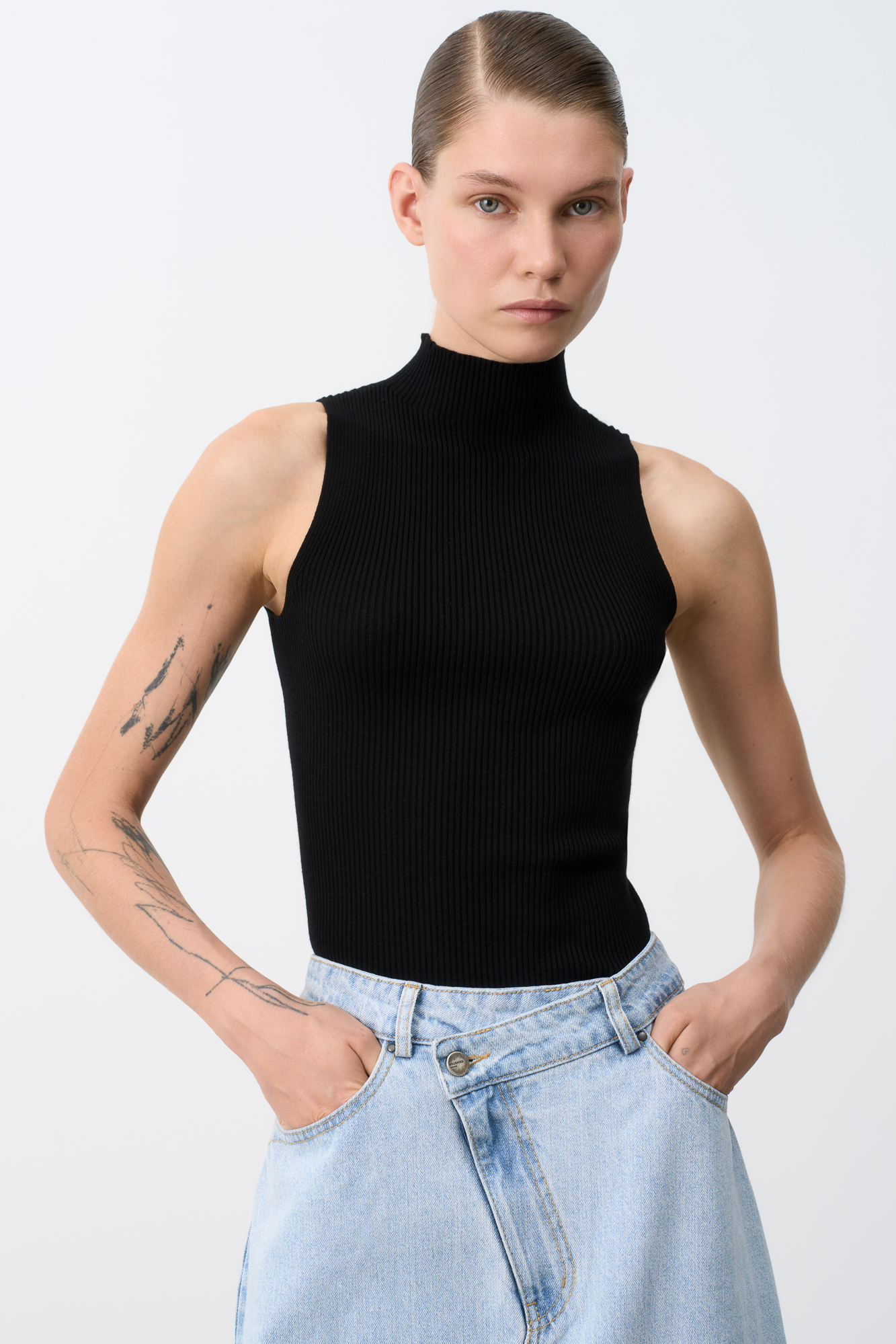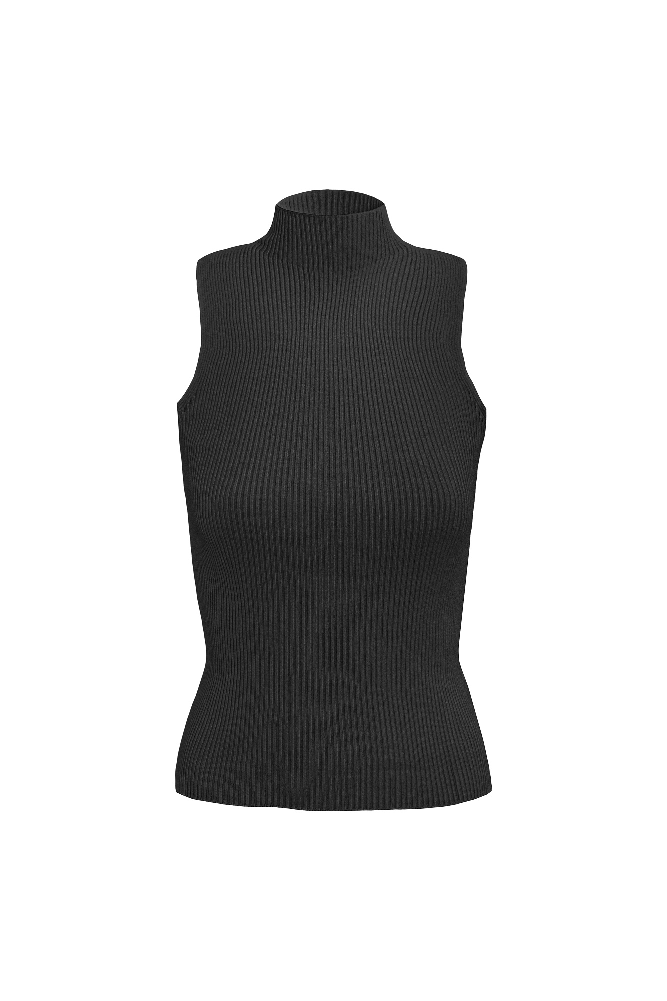 Цельновязаный топ с высоким воротником подчеркнёт линию плеча и визуально удлинит шею.