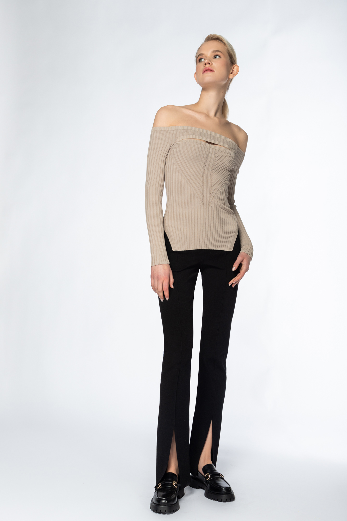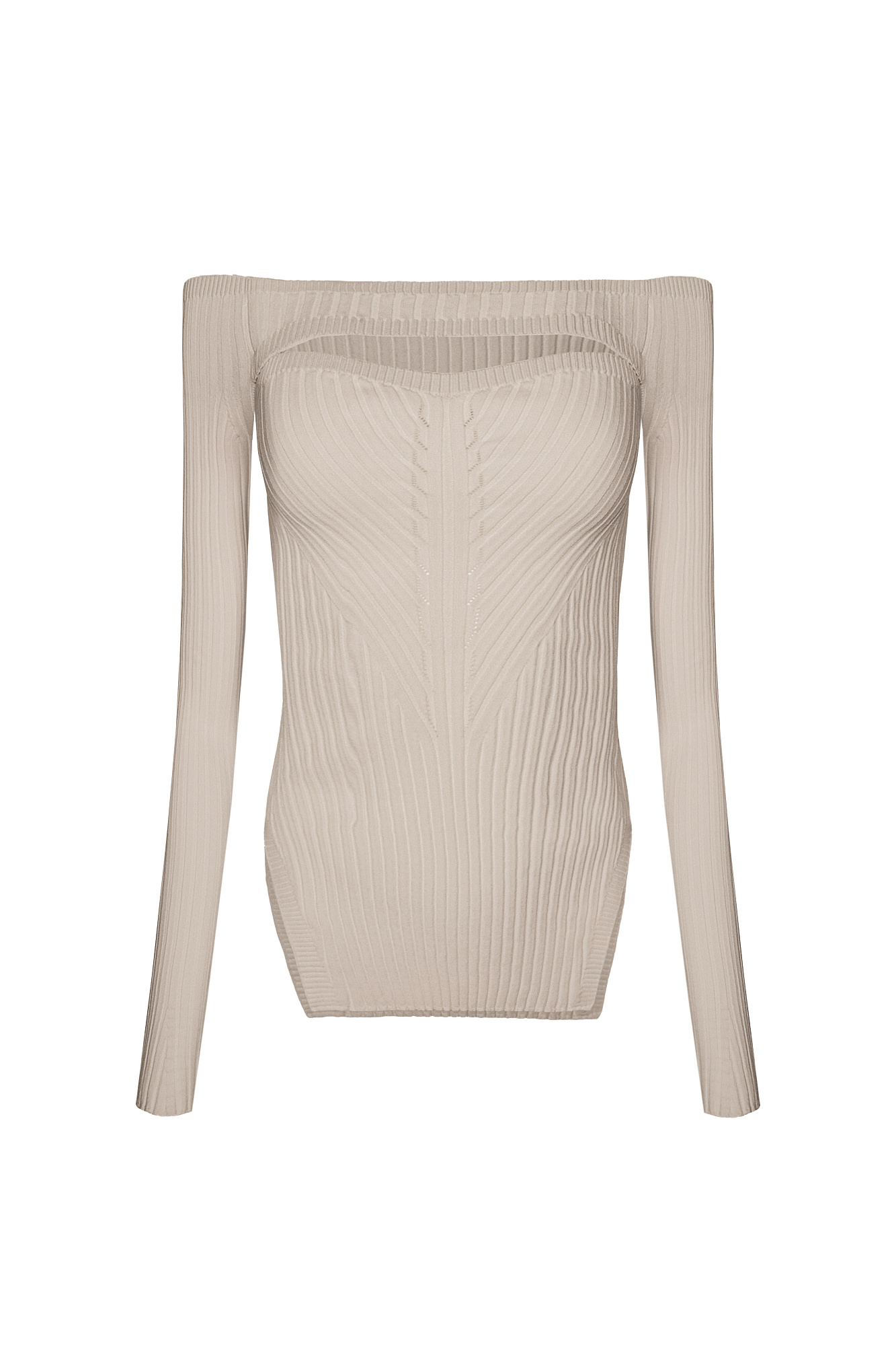 Трикотажный топ из вискозы. Модель с открытыми плечами и длинными рукавами. Изделие декорировано небольшим вырезом на груди.