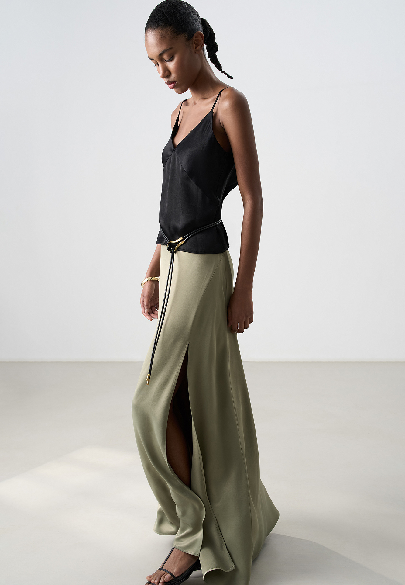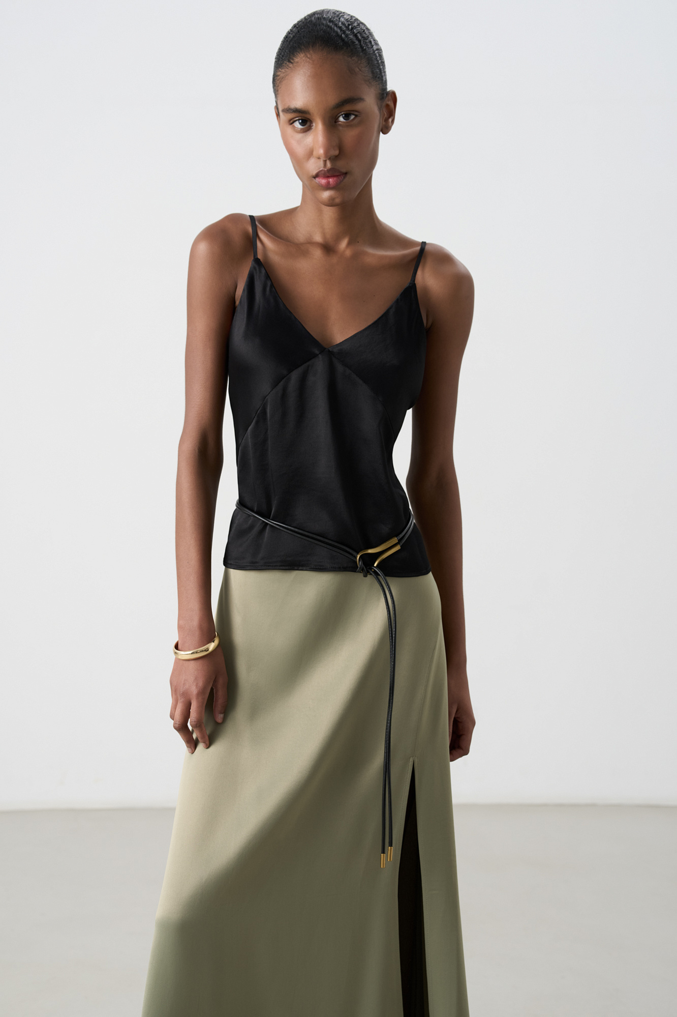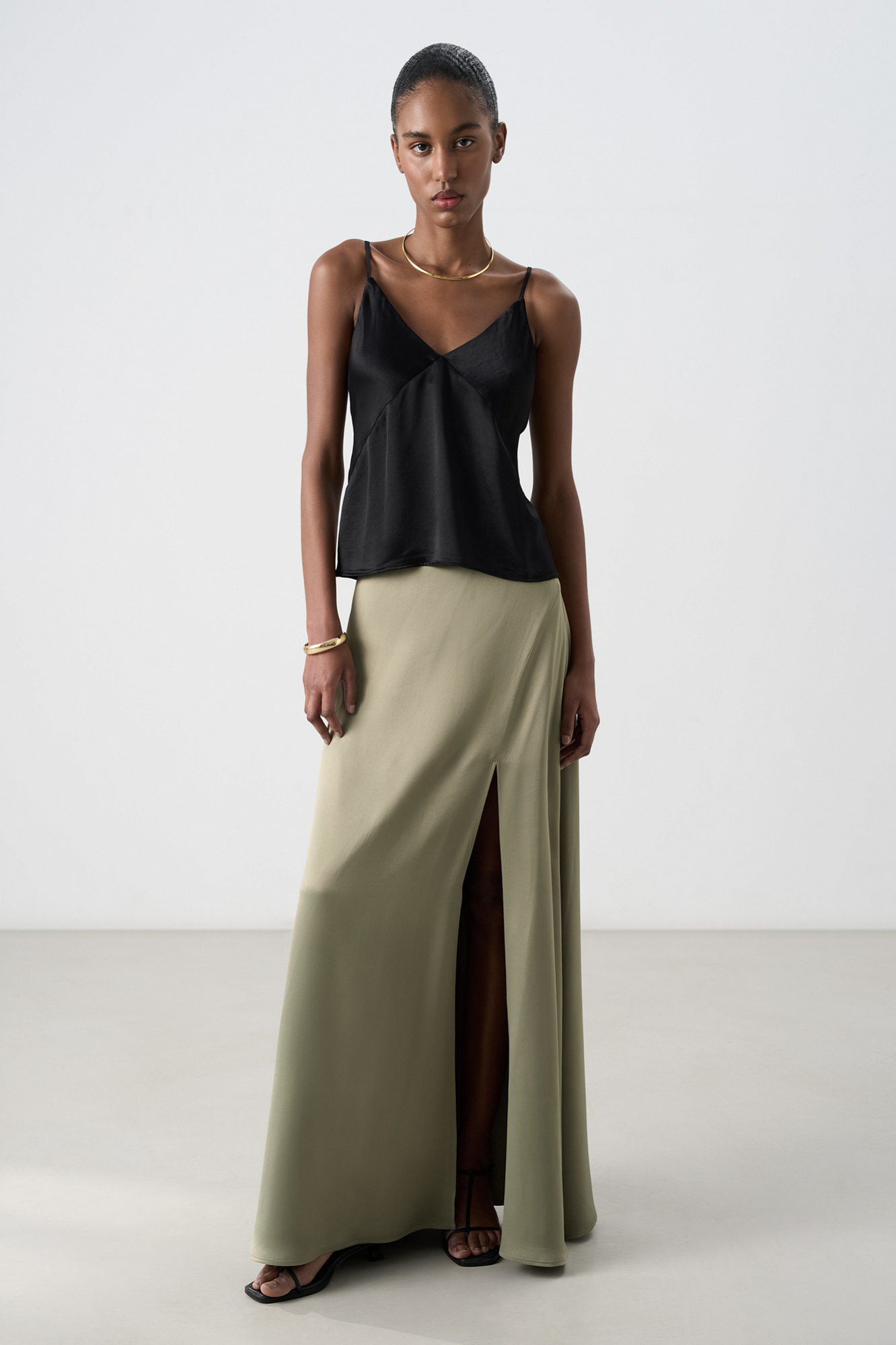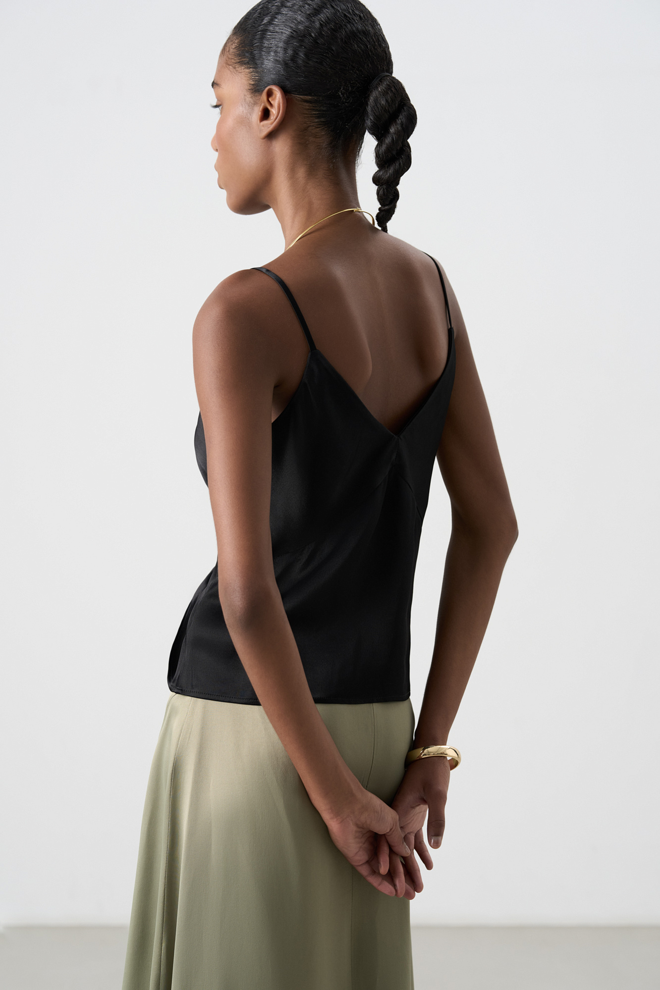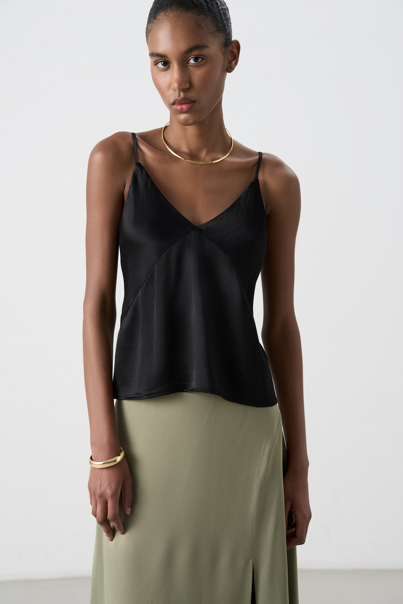 Атласный топ из тонкой вискозы. Модель прямого кроя, на тонких бретелях и глубоким V-образным вырезом.