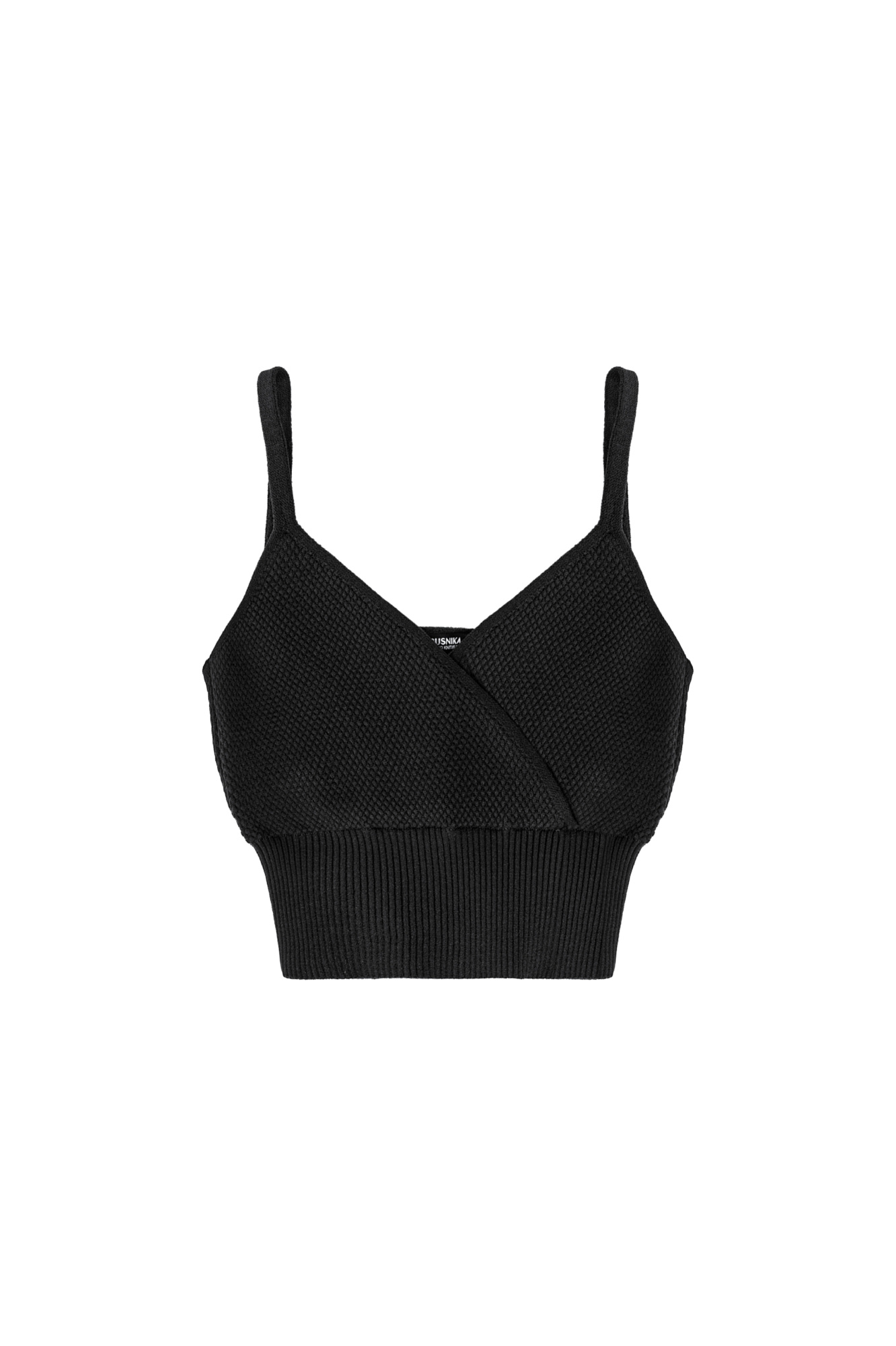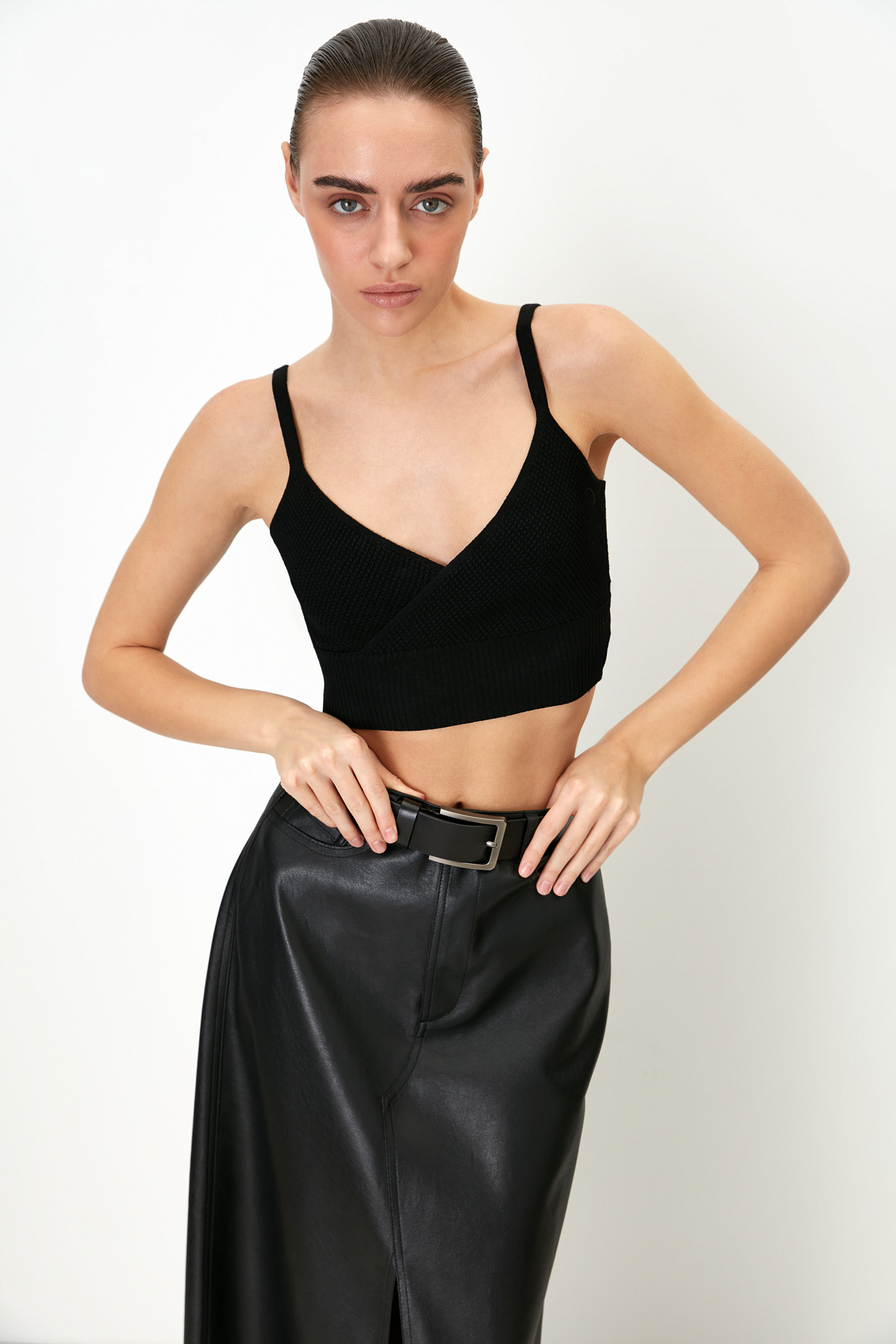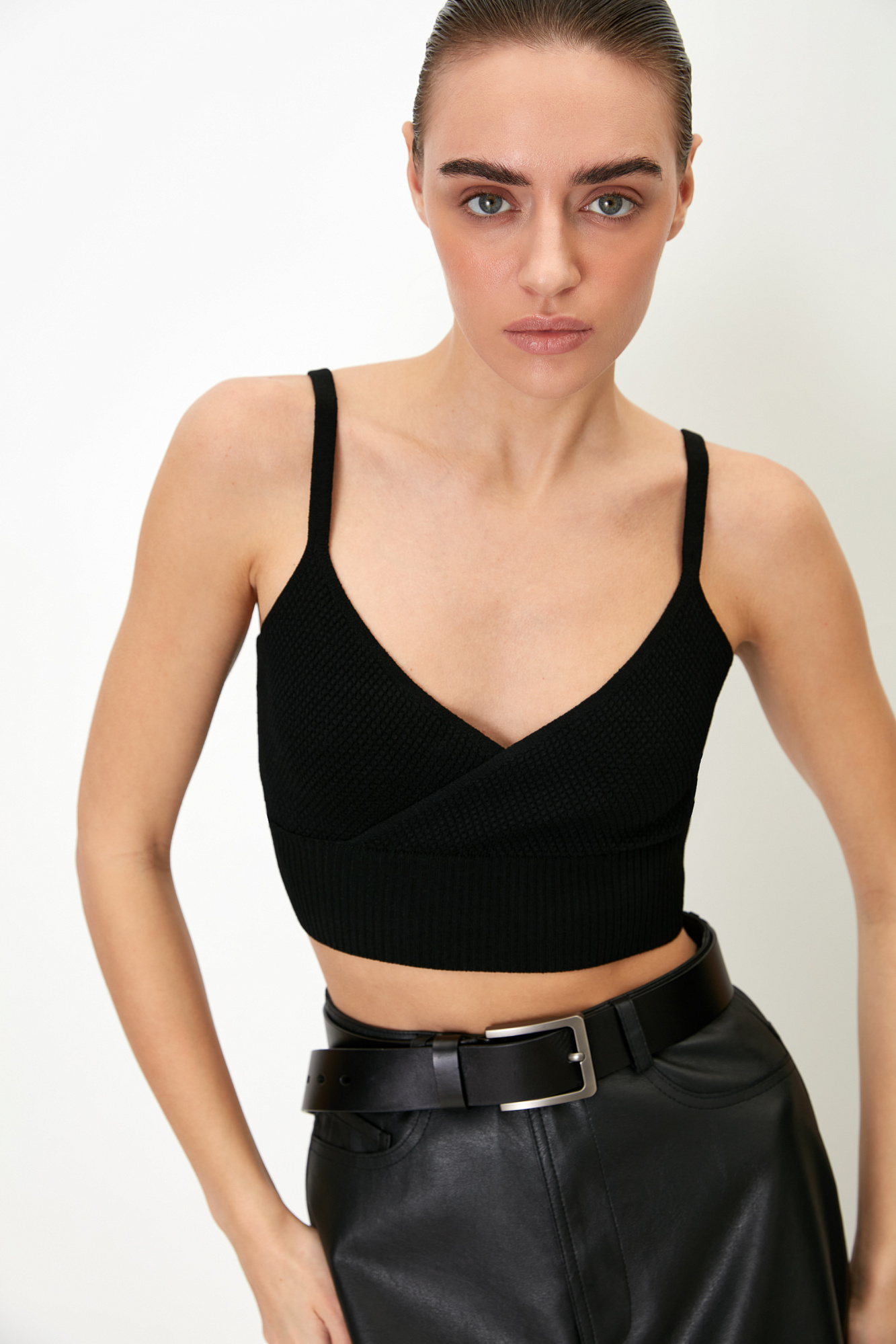 Фактурный кроп-топ из вискозы на тонких бретелях. Модель с имитацией запаха на лифе и широкой эластичной резинкой.
