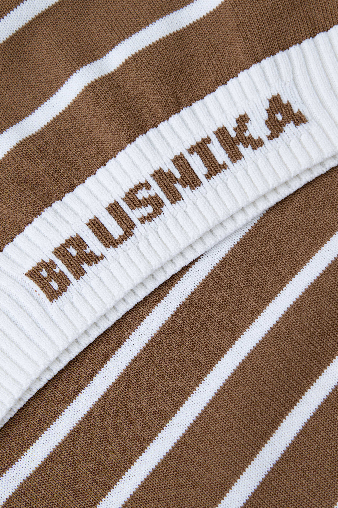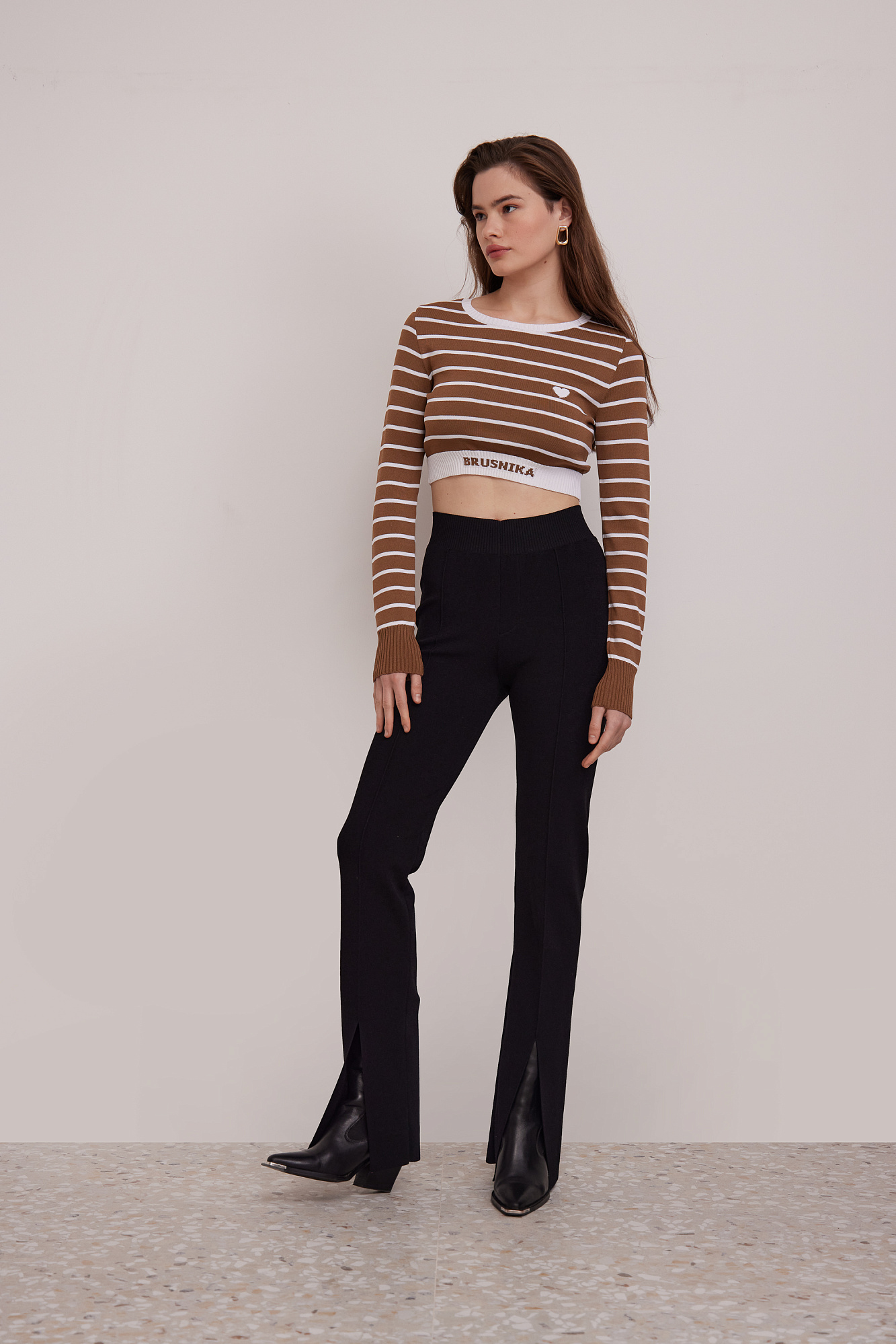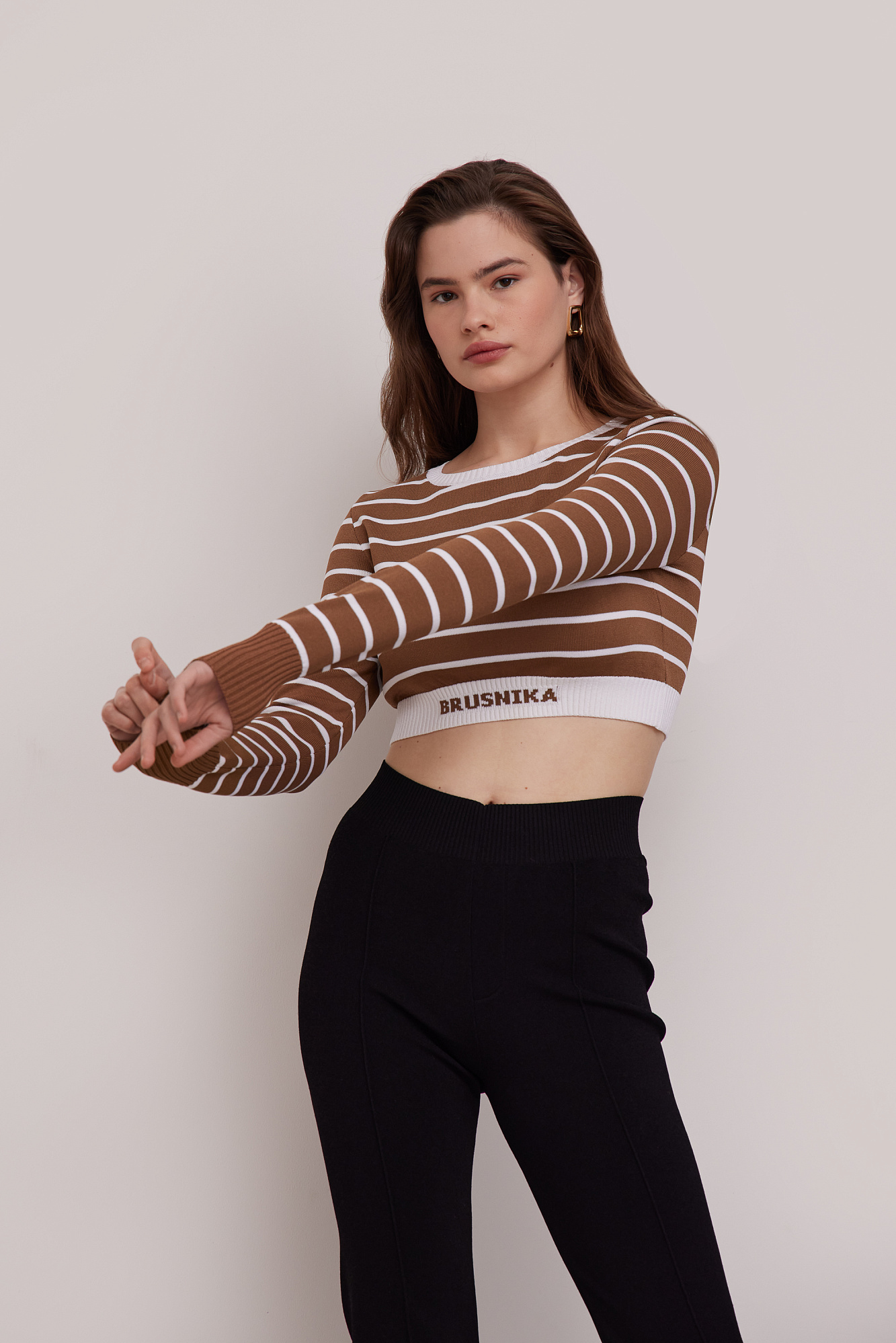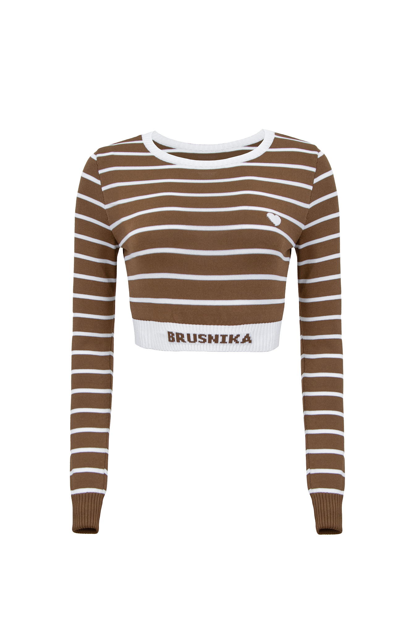 Трикотажный топ в полоску. Круглый вырез, длинные рукава с манжетами. Низ изделия выполнен резинкой с брендированной надписью.