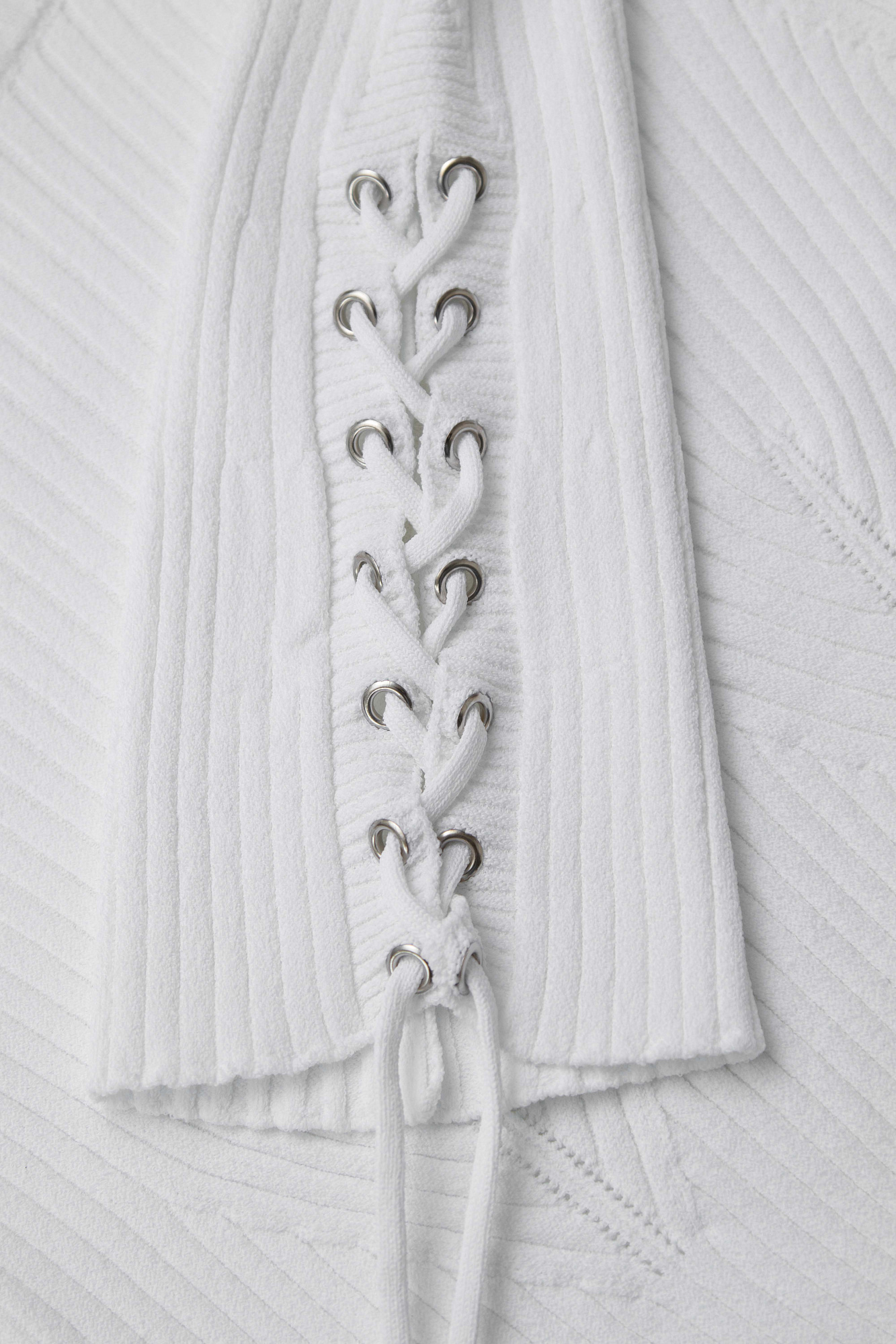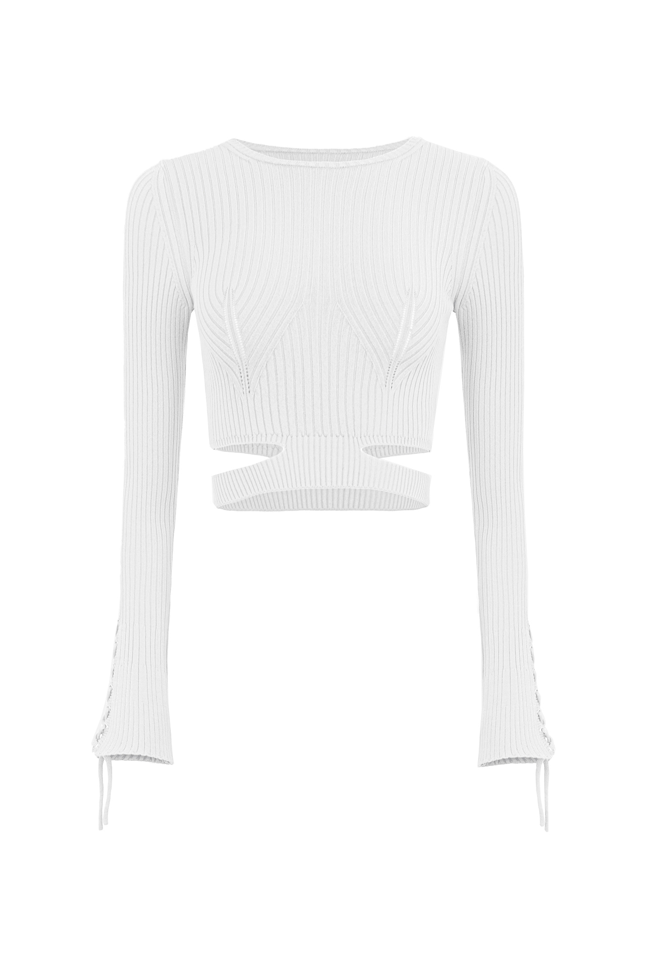 Укороченный трикотажный топ из вискозы. Модель приталенного силуэта, с декоративными горизонтальными разрезами на талии, длинными рукавами, декорированными люверсами и шнуровкой, и круглым вырезом горловины. Изделие выполнено в широкий рубчик. Дополнить образ можно юбкой в таком же стиле.