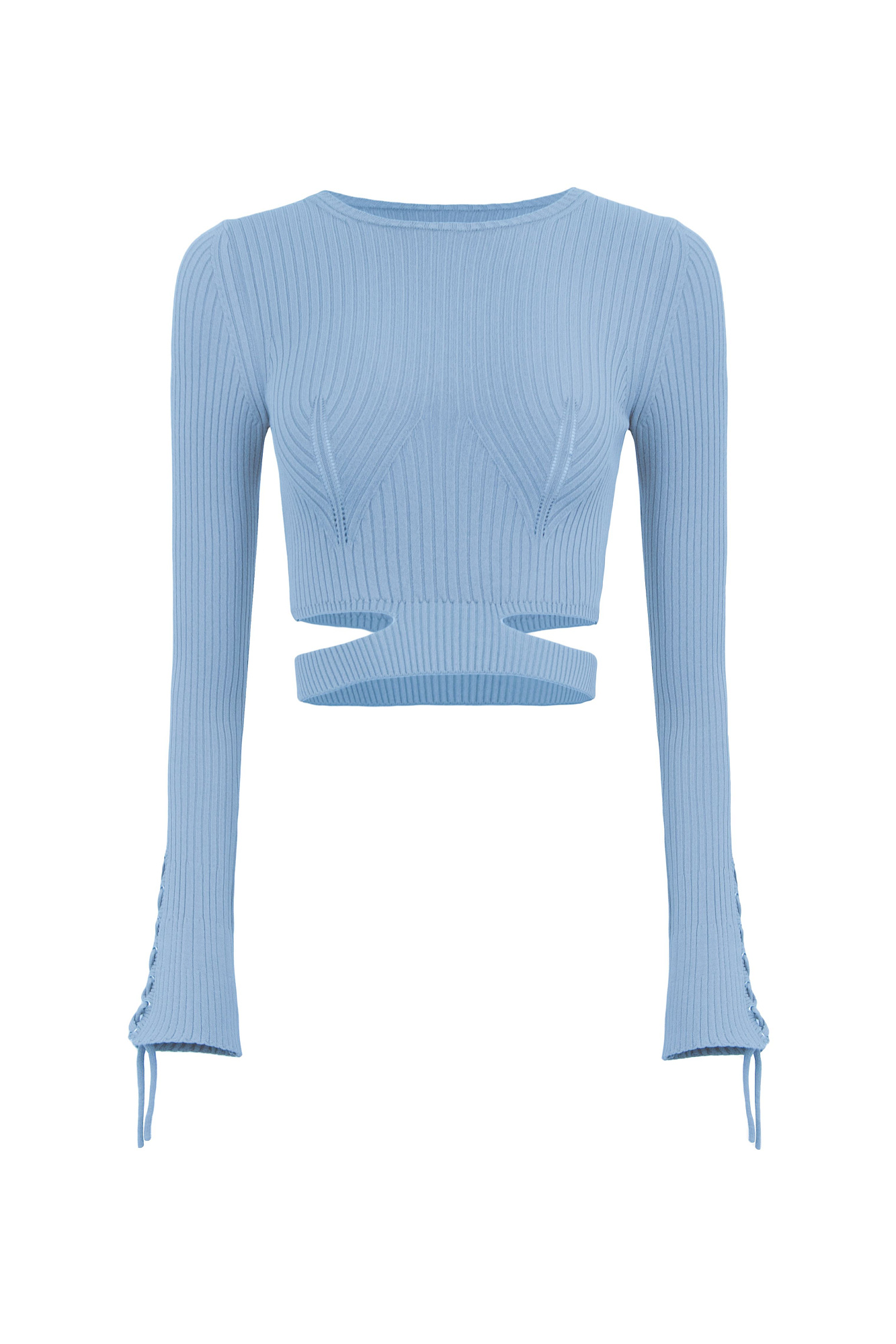Укороченный трикотажный топ из вискозы. Модель приталенного силуэта, с декоративными горизонтальными разрезами на талии, длинными рукавами, декорированными люверсами и шнуровкой, и круглым вырезом горловины. Изделие выполнено в широкий рубчик. Дополнить образ можно юбкой в таком же стиле.