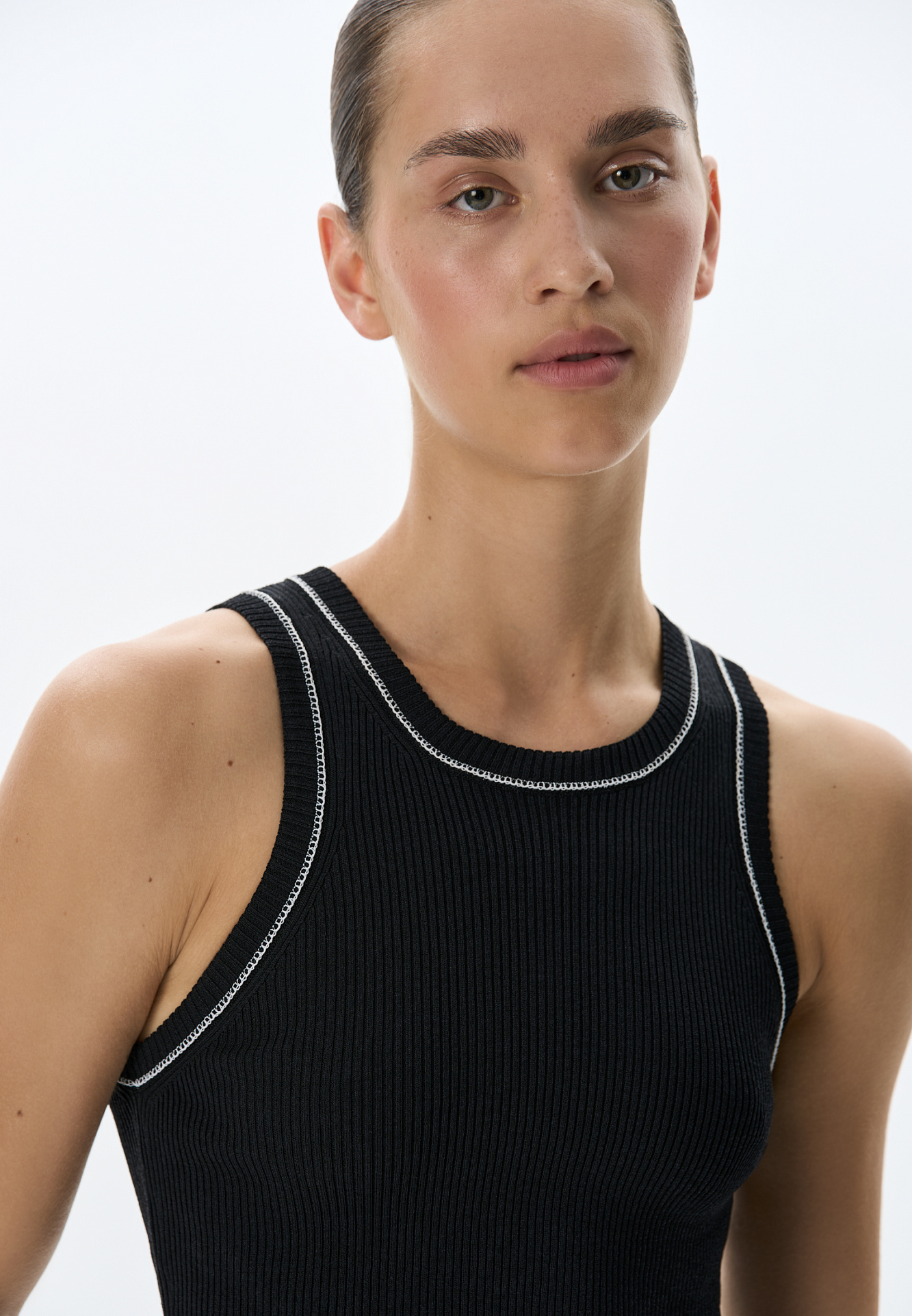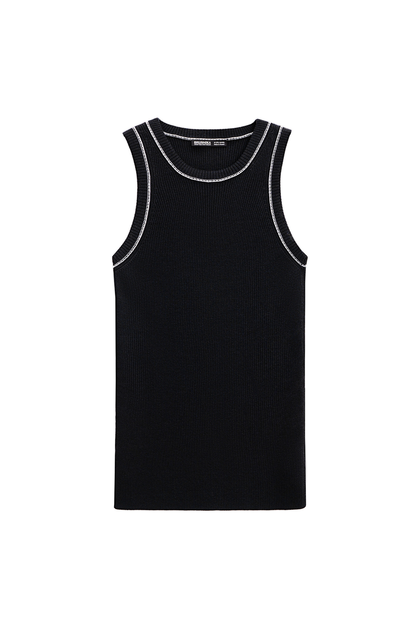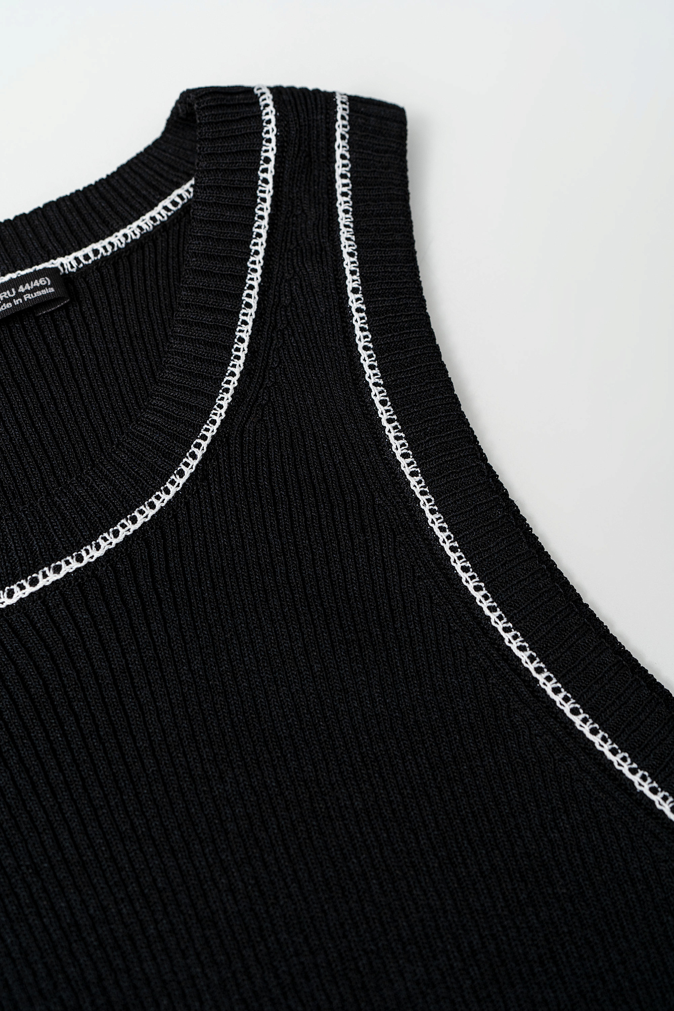 Трикотажный топ из вискозы в рубчик. Модель приталенного силуэта, без рукавов и круглым вырезом горловины. Изделие декорировано строчкой контрастного цвета.