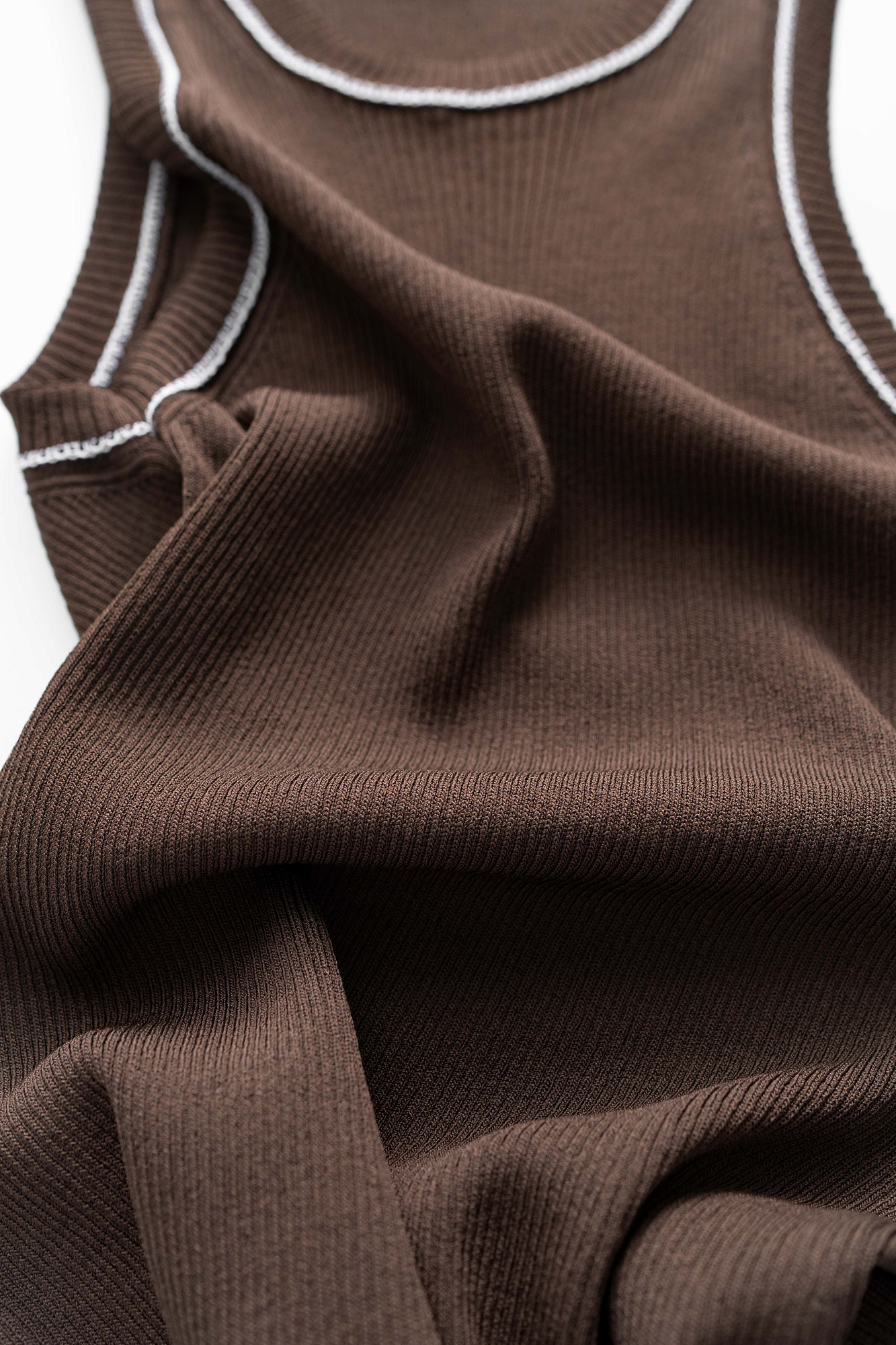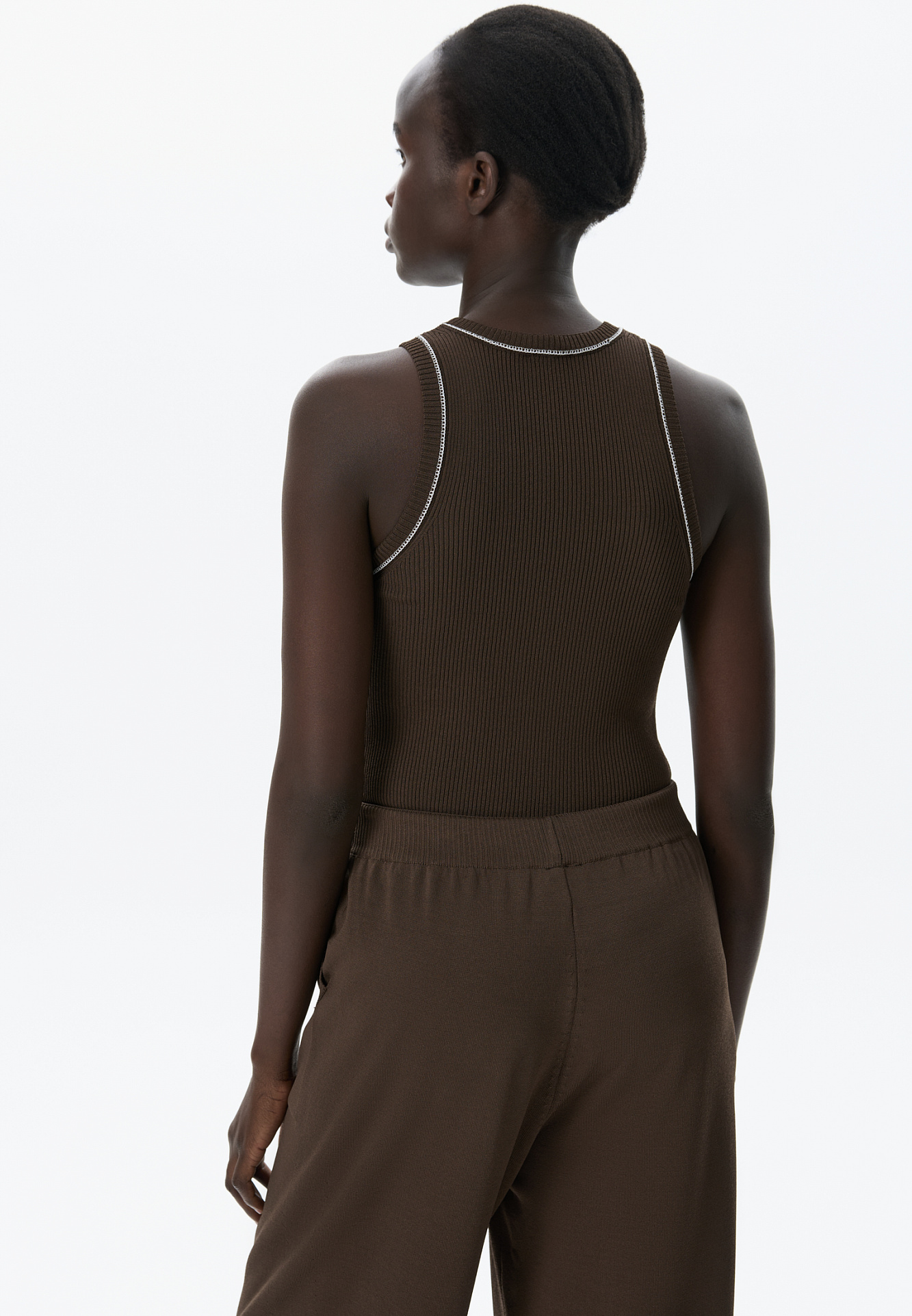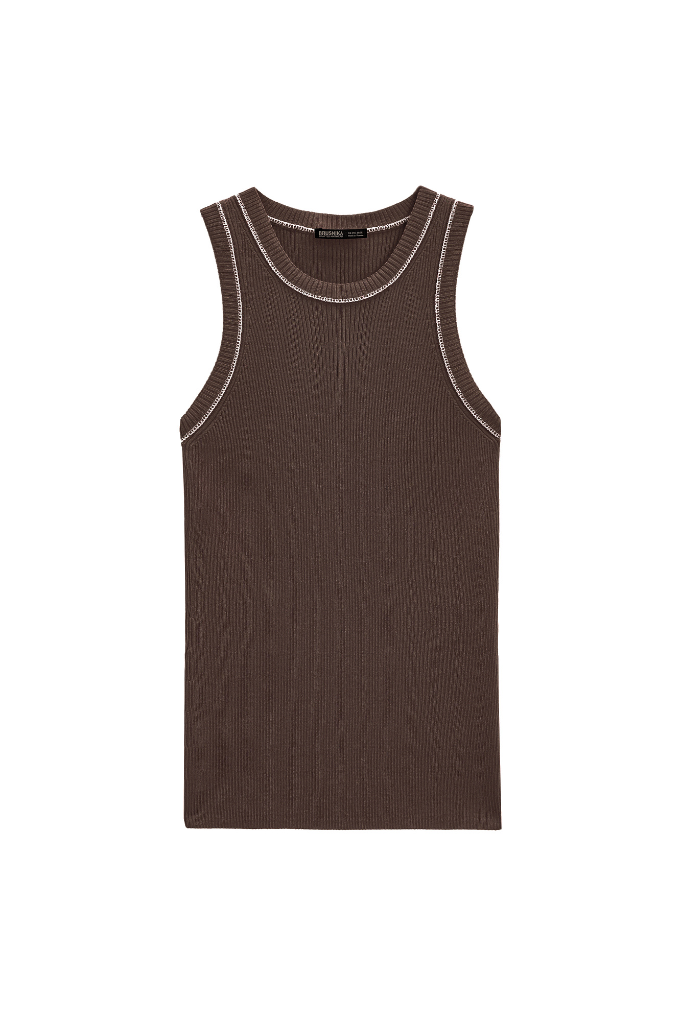 Трикотажный топ из вискозы в рубчик. Модель приталенного силуэта, без рукавов и круглым вырезом горловины. Изделие декорировано строчкой контрастного цвета.