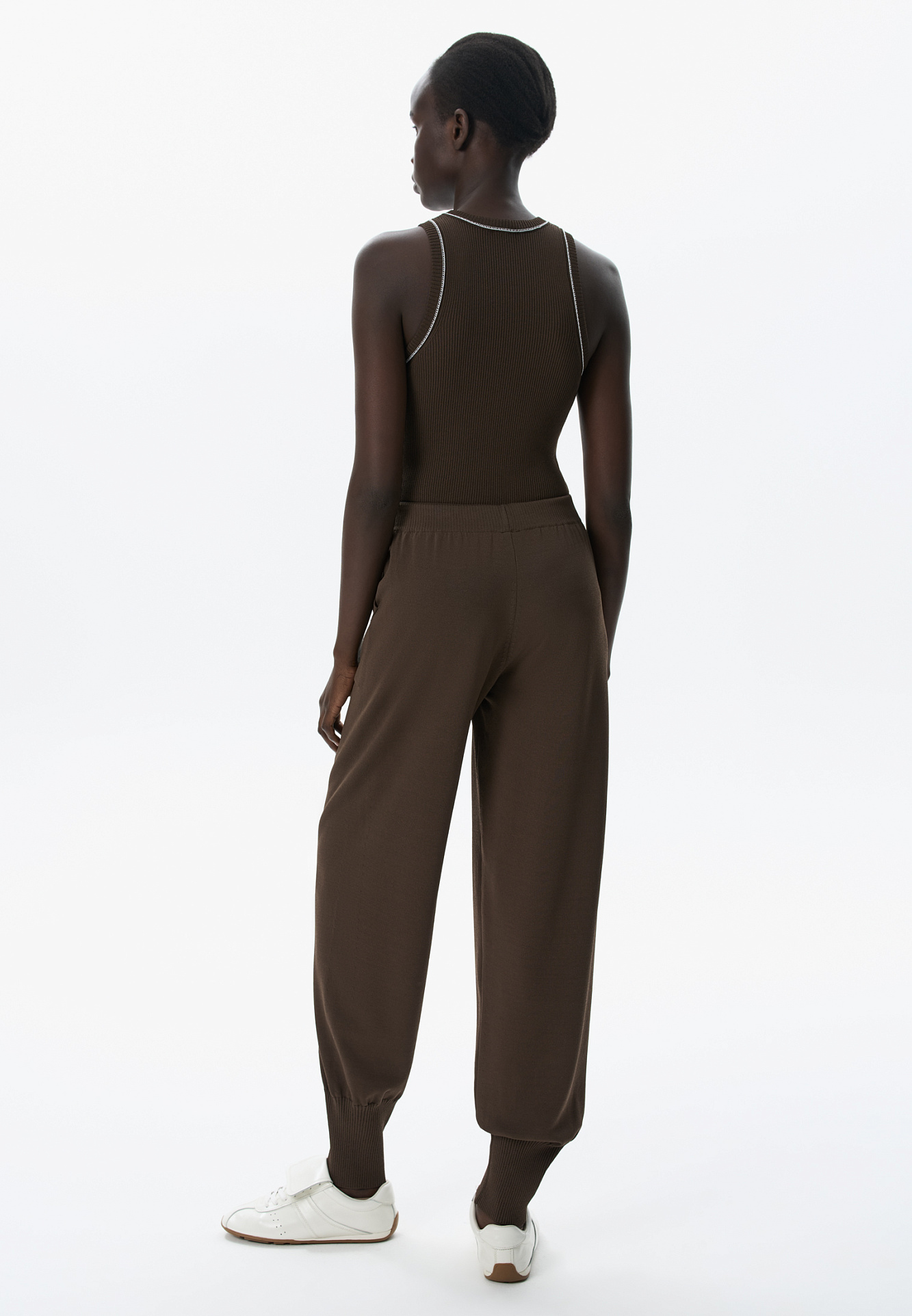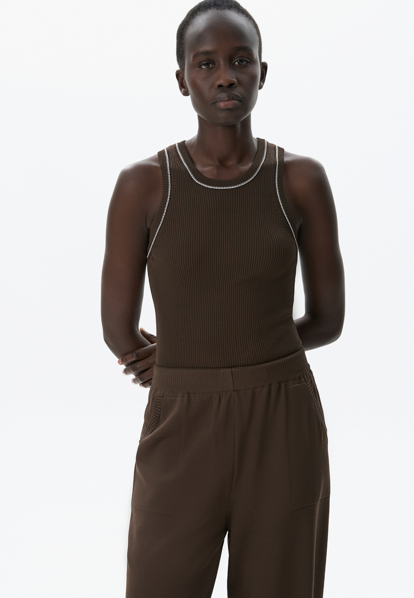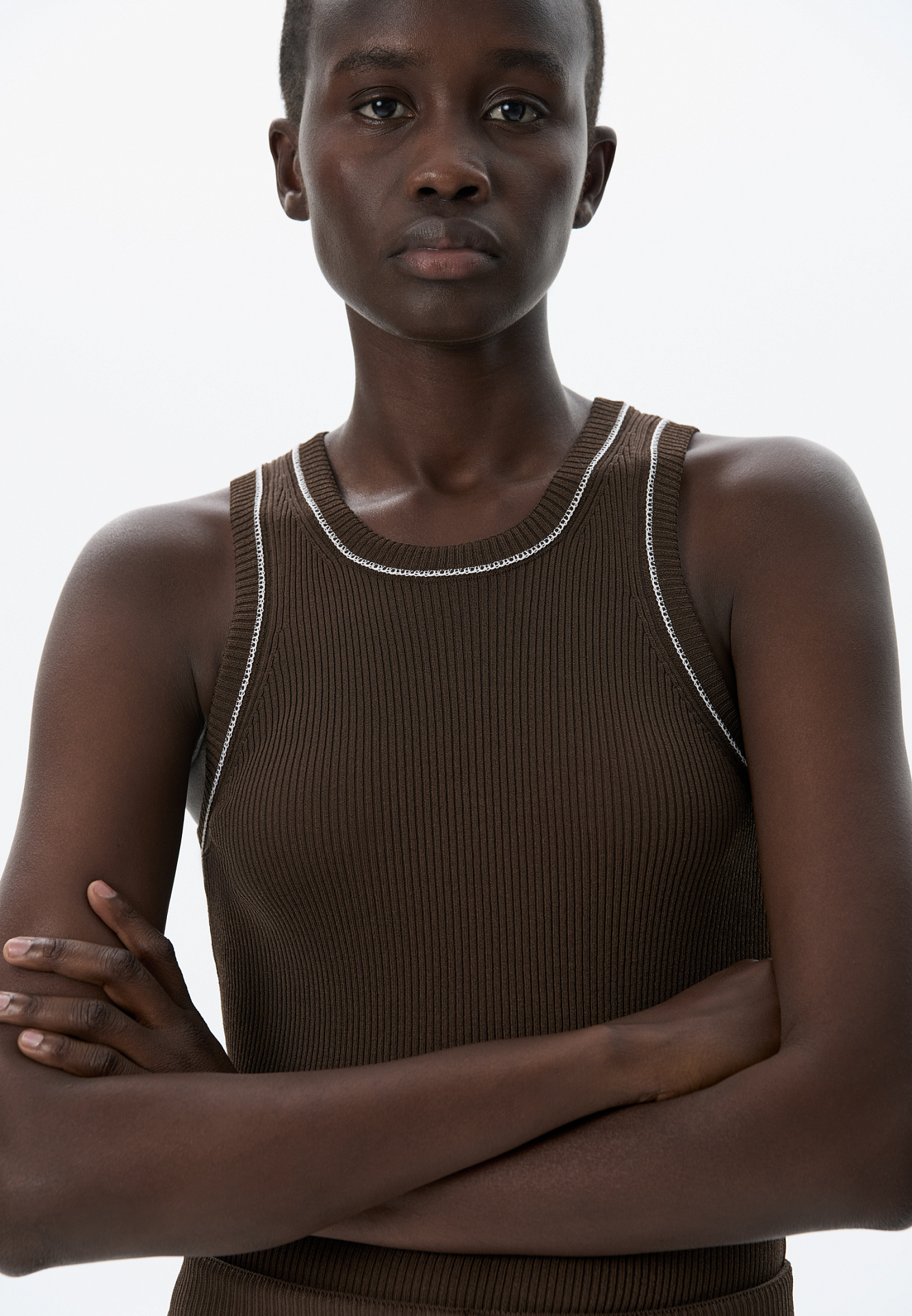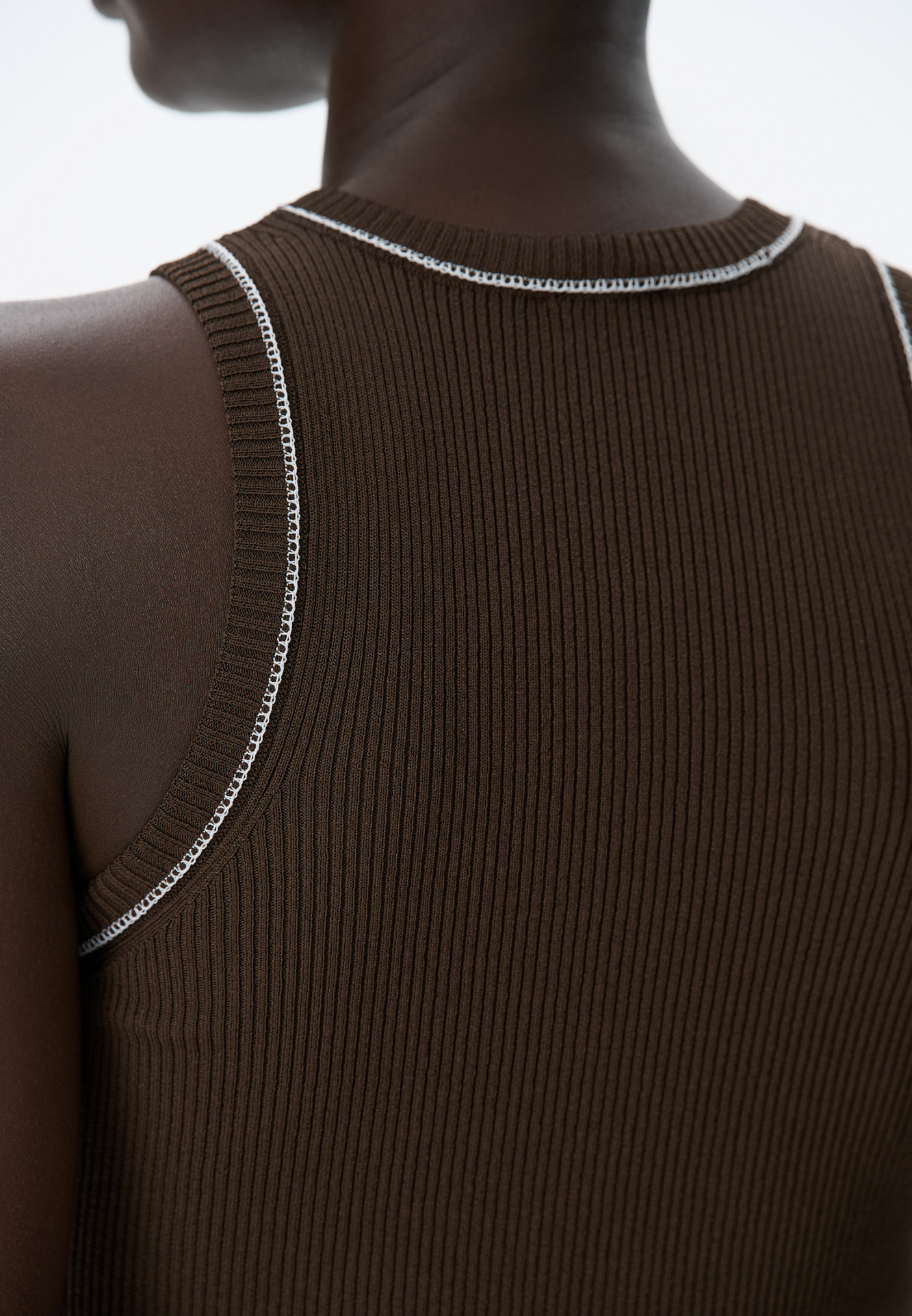 Трикотажный топ из вискозы в рубчик. Модель приталенного силуэта, без рукавов и круглым вырезом горловины. Изделие декорировано строчкой контрастного цвета.