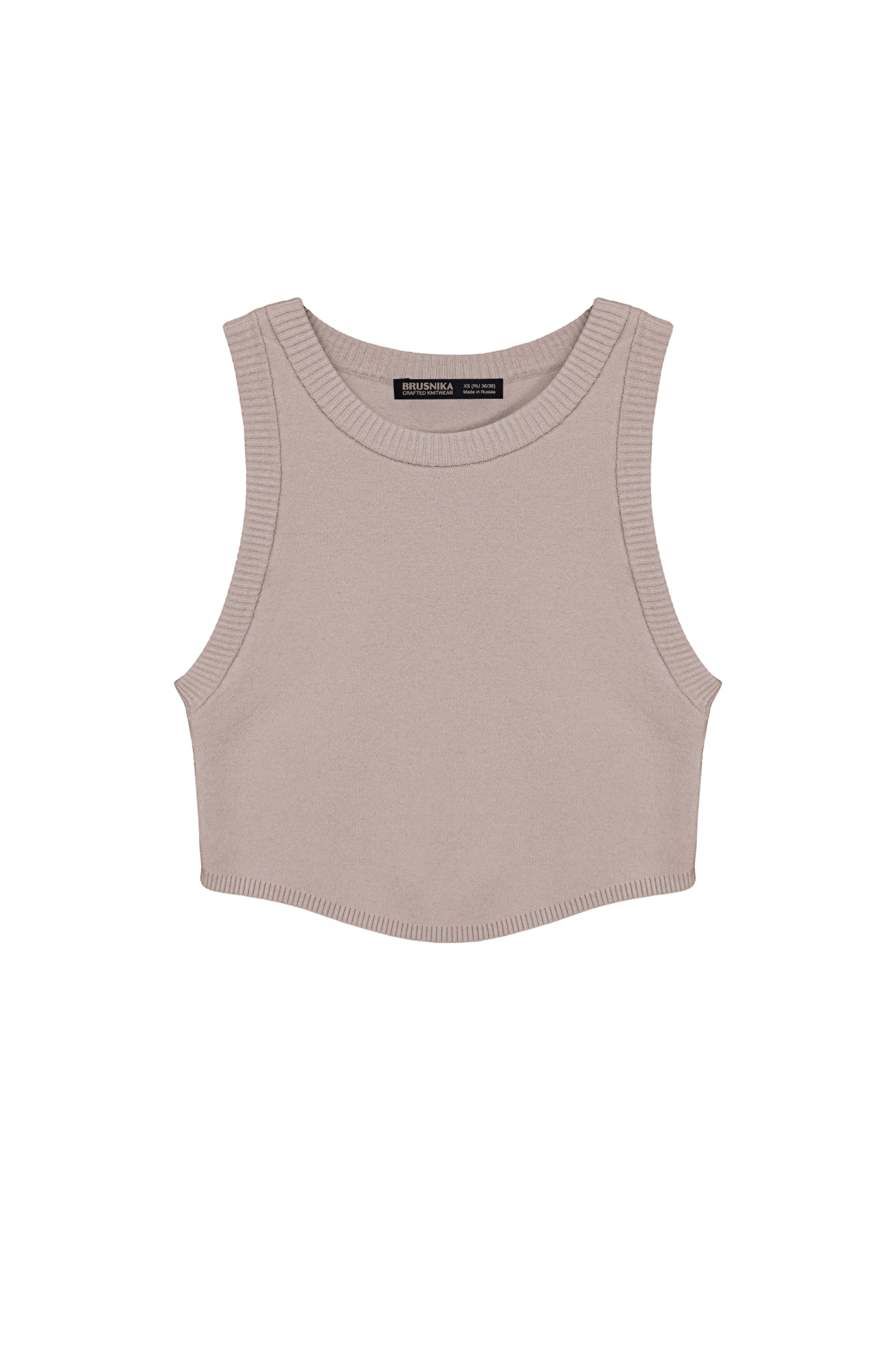 Трикотажный кроп-топ из поливискозы с круглым вырезом горловины и неровным низом. Края изделия выполнены в рубчик.