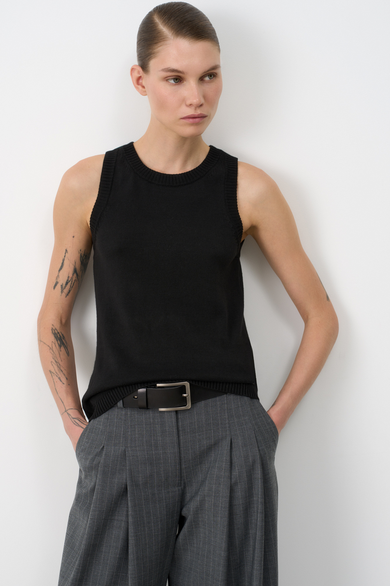 Трикотажный топ из 100% хлопка без рукавов. Модель приталенного силуэта с круглым вырезом горловины. Края изделия выполнены в рубчик.