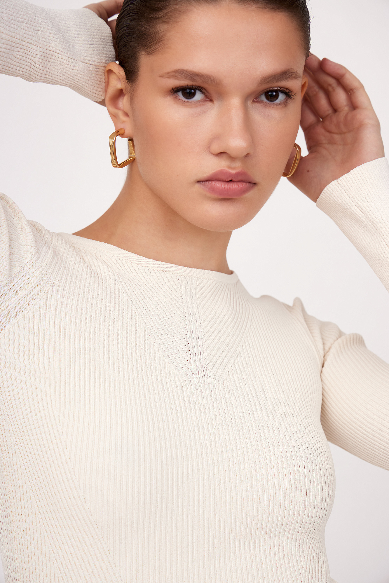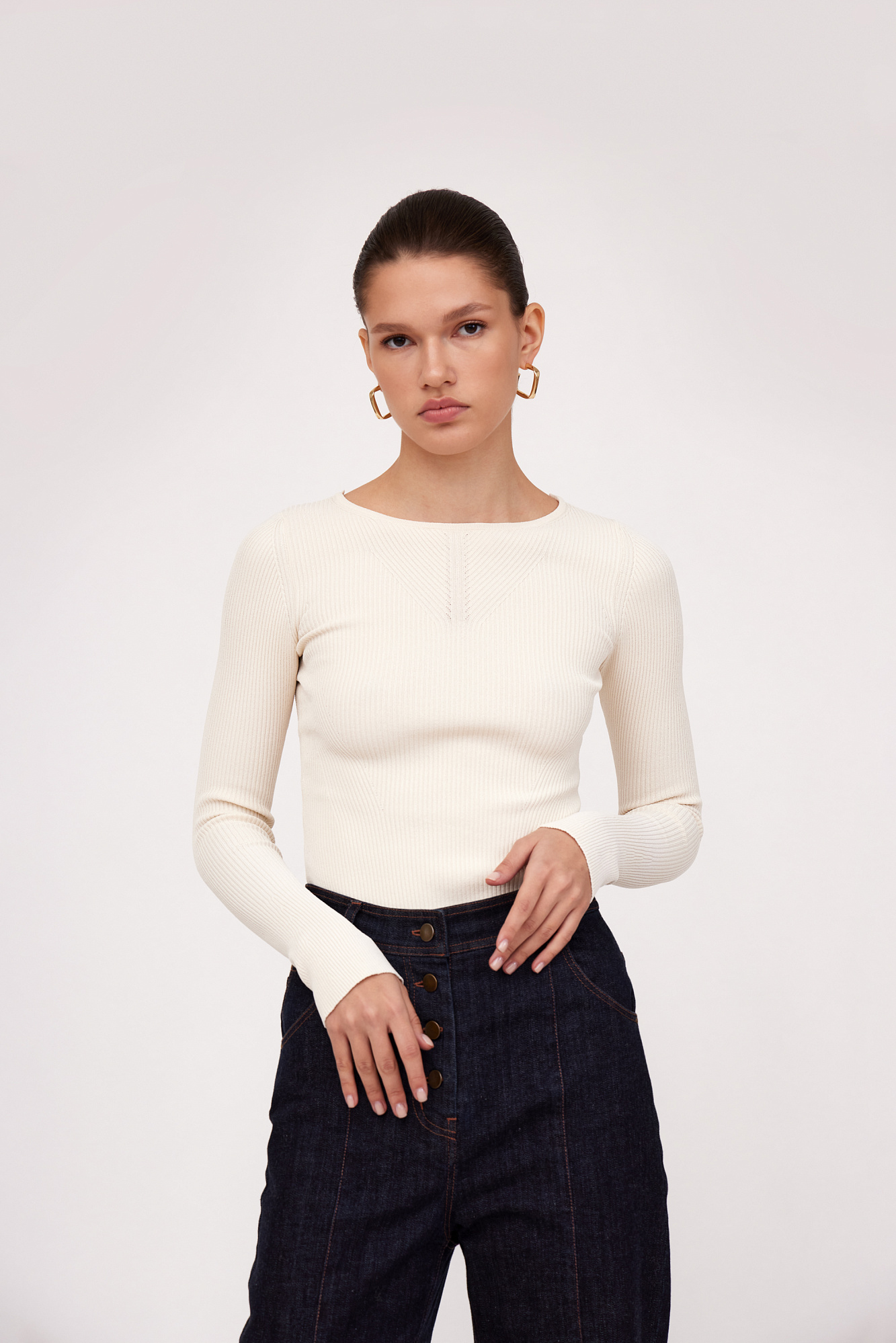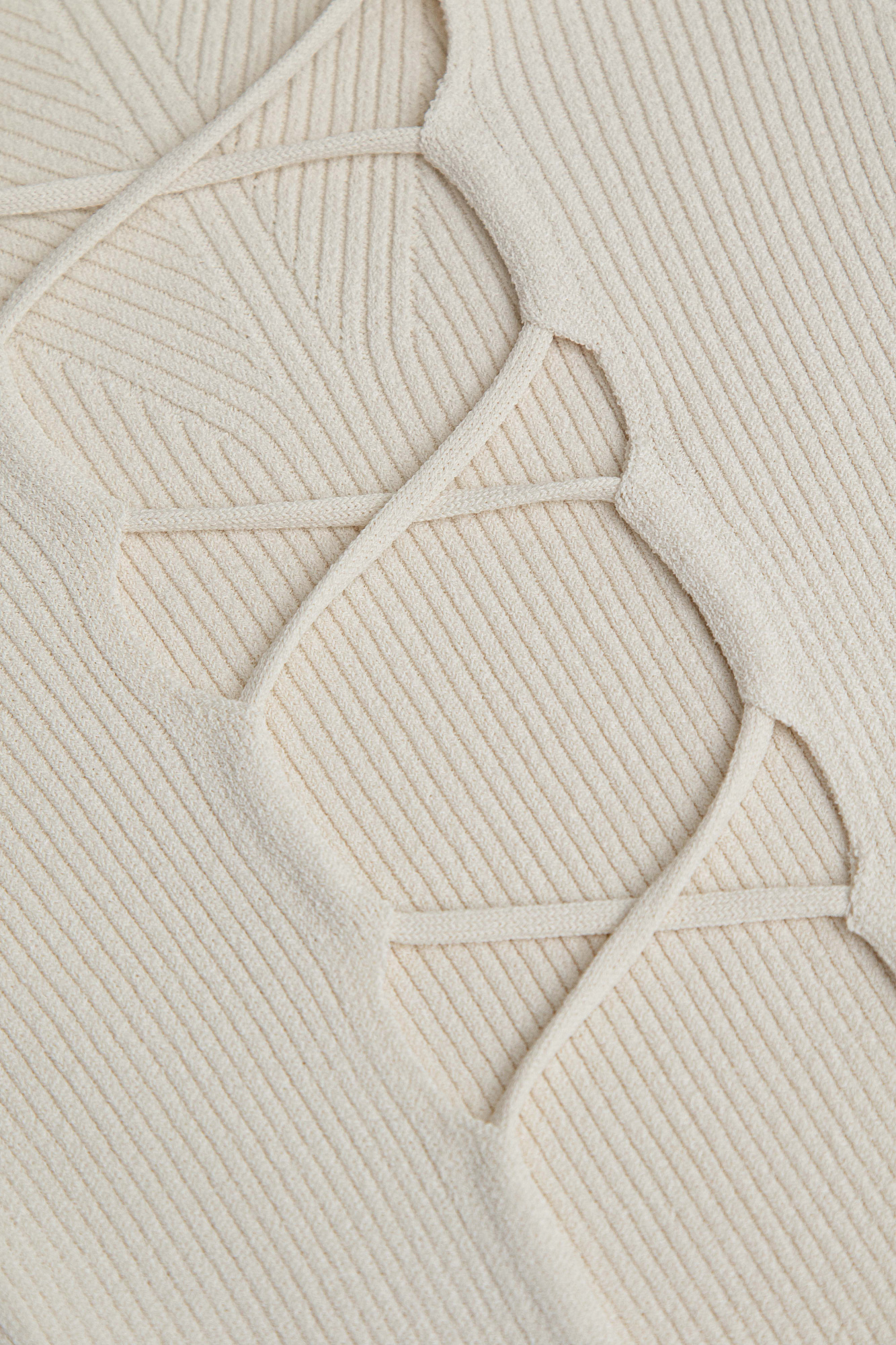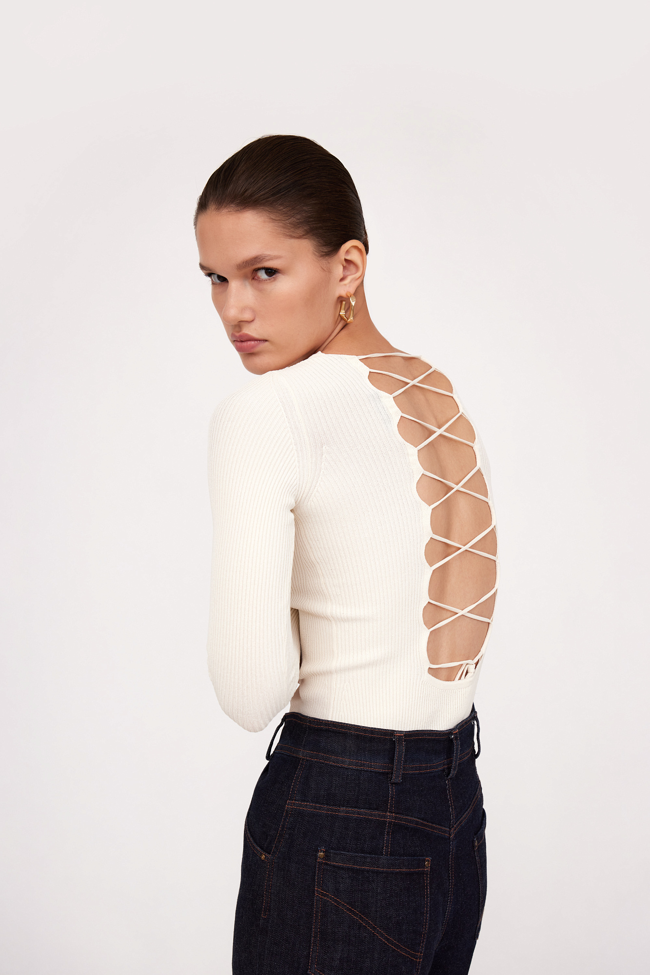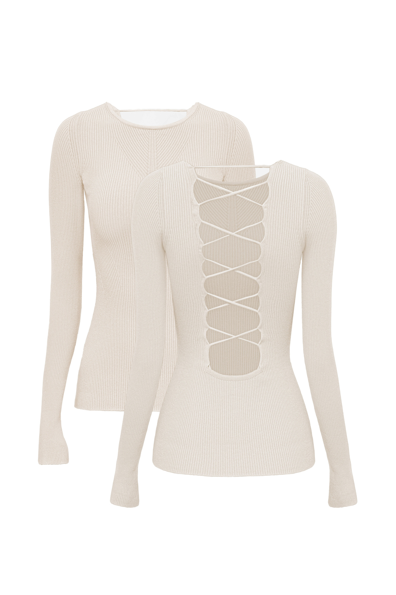 Трикотажный топ из тонкого трикотажа на основе вискозы. Модель с длинным рукавом и круглым вырезом горловины. Изделие декорировано вывязанным узором на груди и глубоким вырезом со шнуровкой на спине.