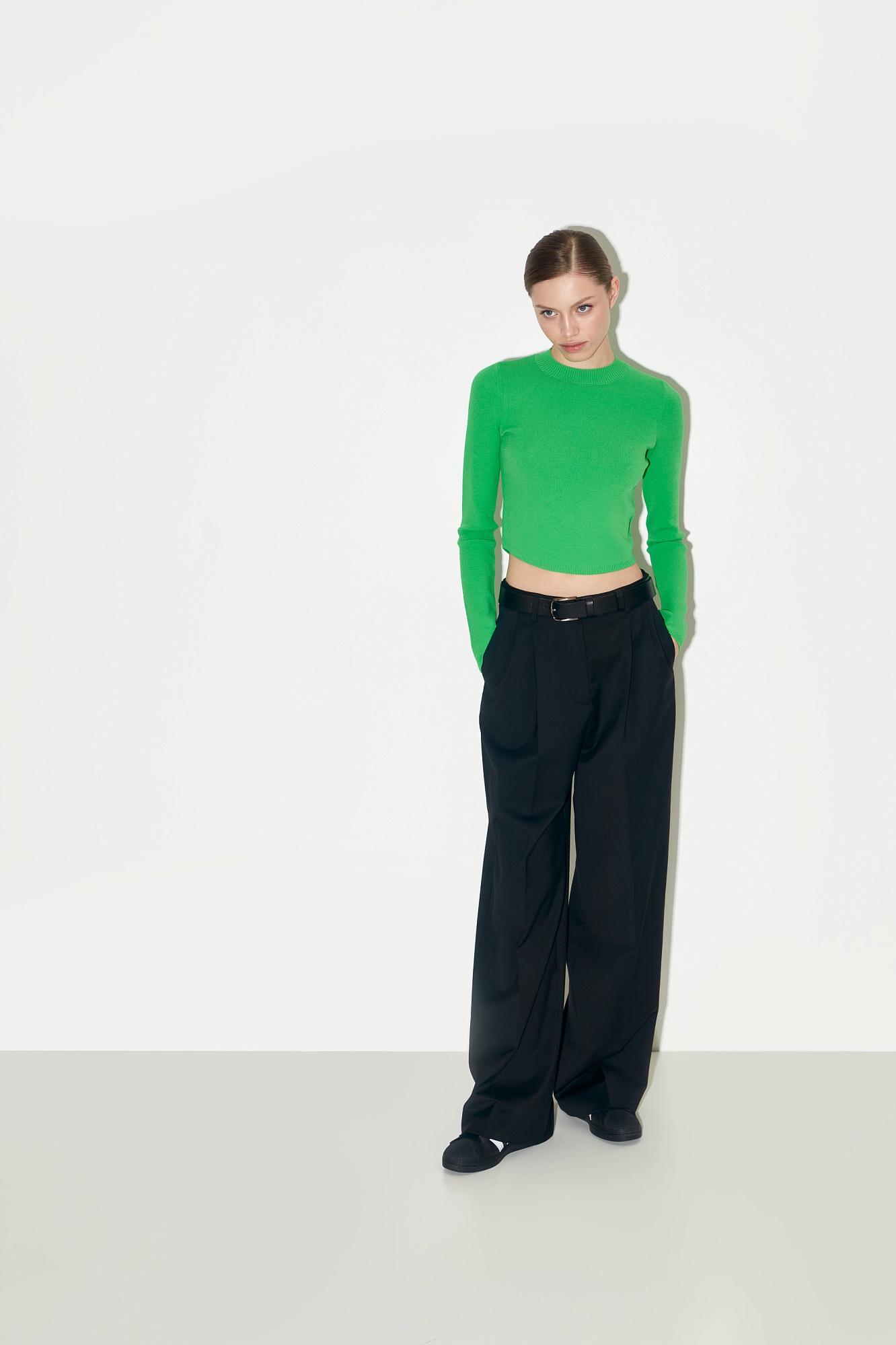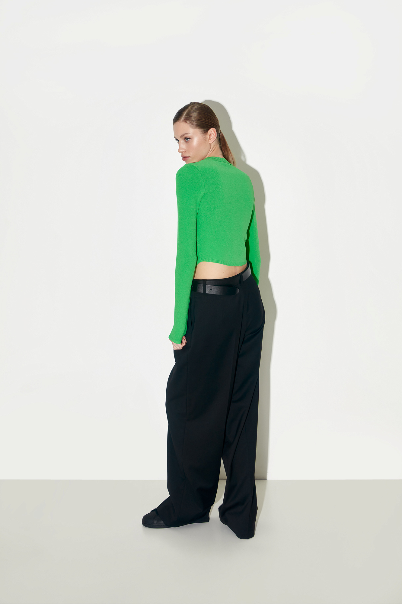 Трикотажный топ из мягкой вискозы с асимметричным низом и длинным рукавом.