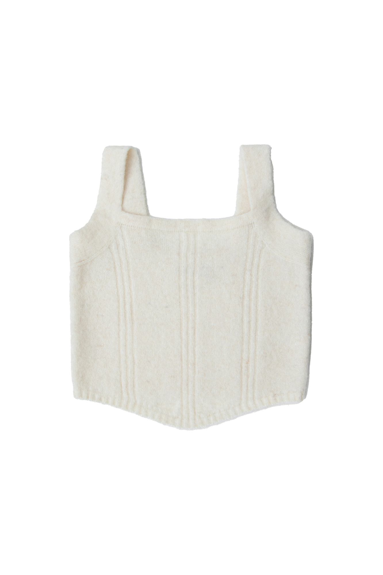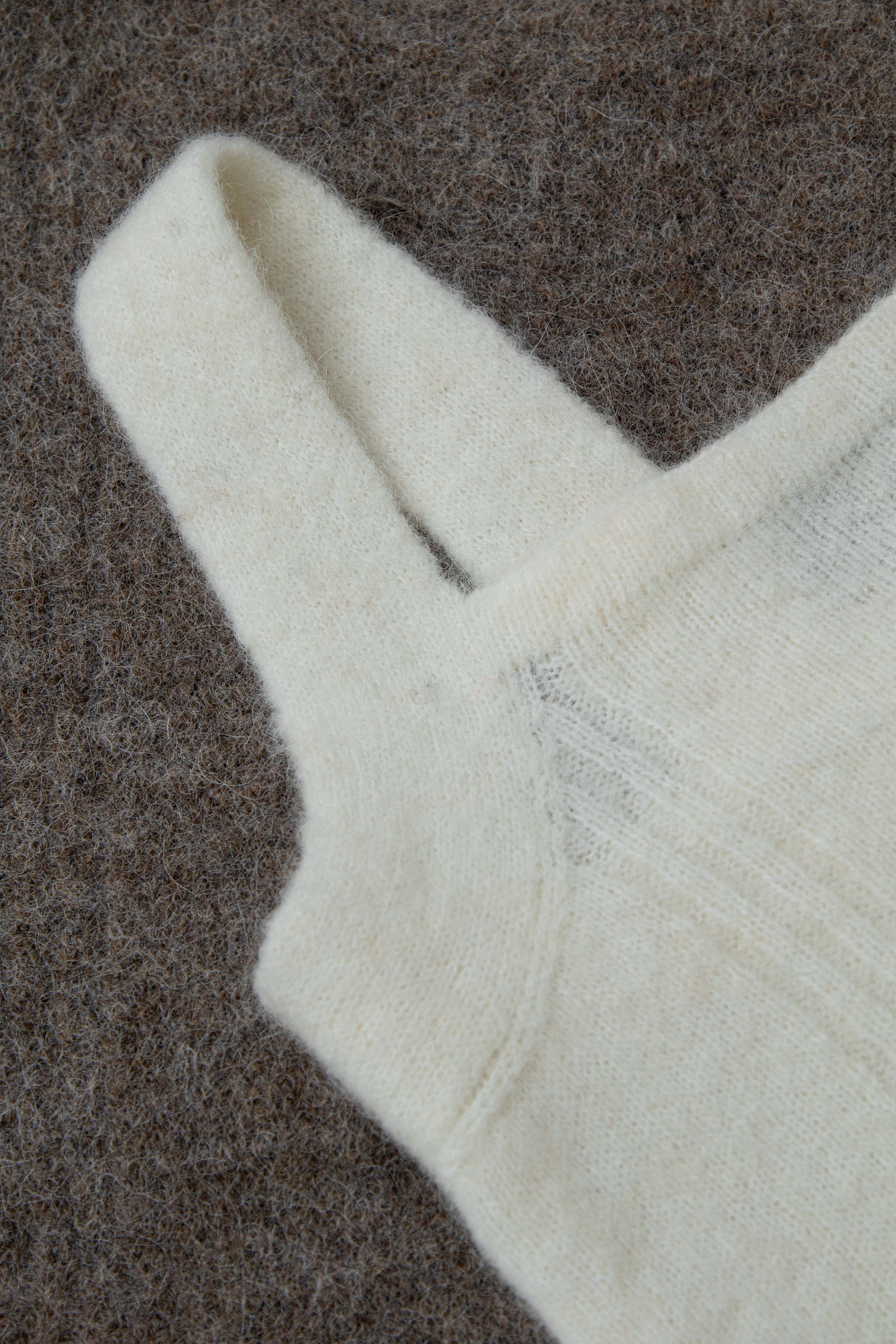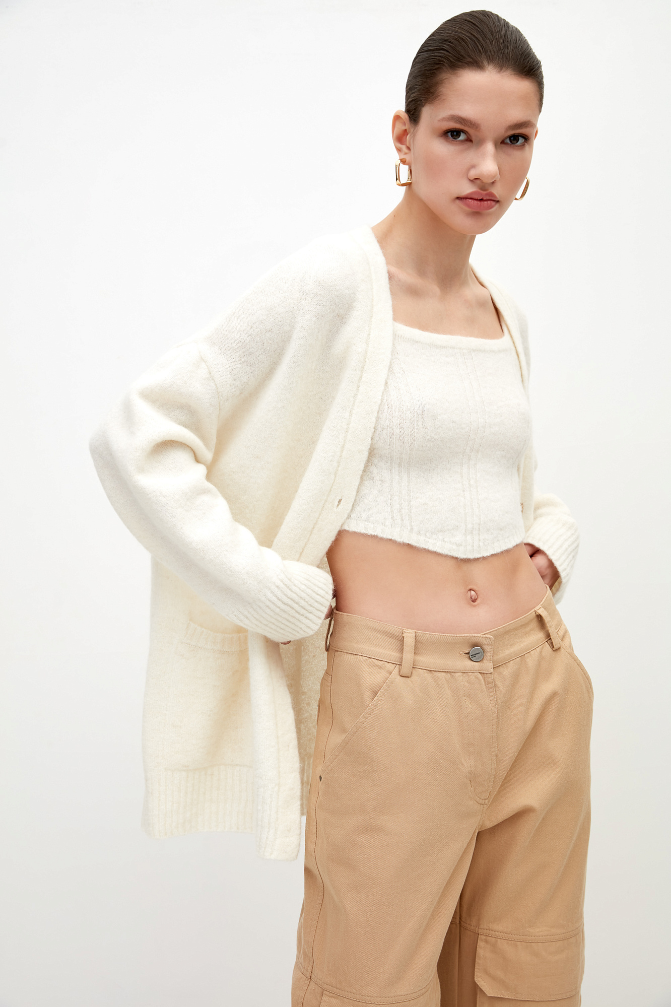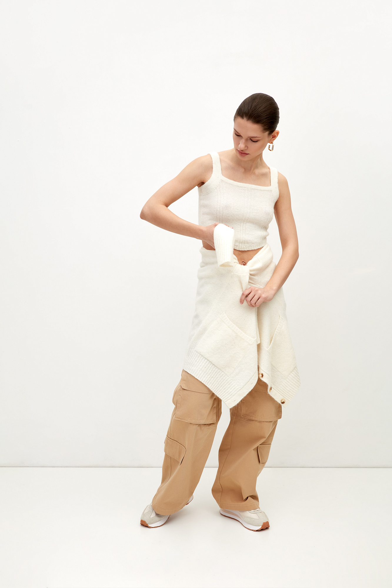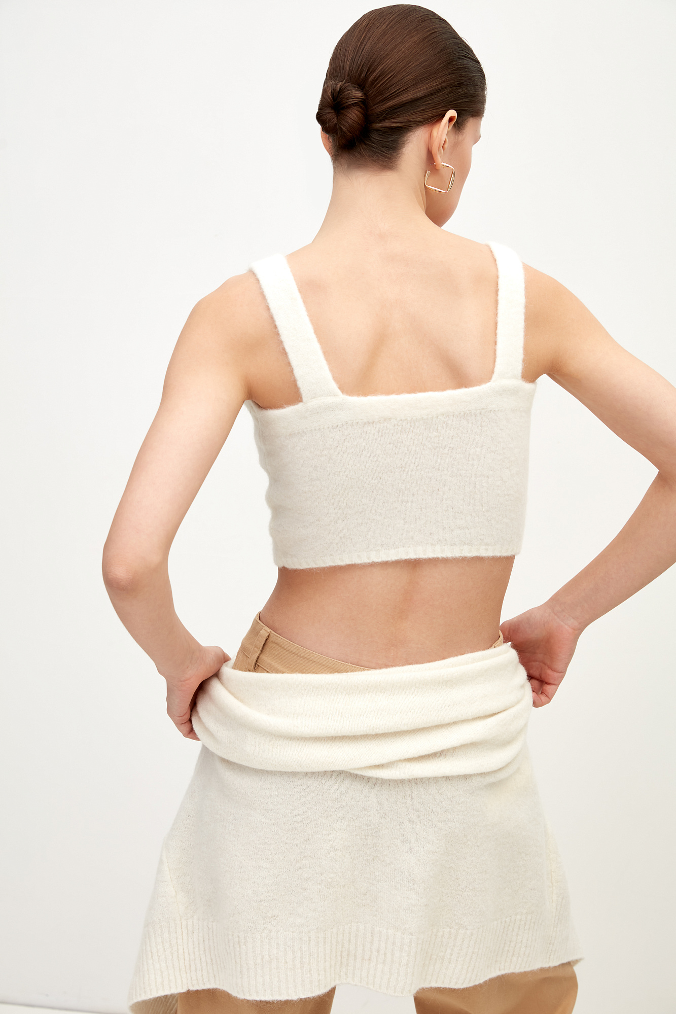 Трикотажный укороченный топ из шерсти альпака. Модель на бретелях. Дополнить образ можно кардиганом из того же материала.