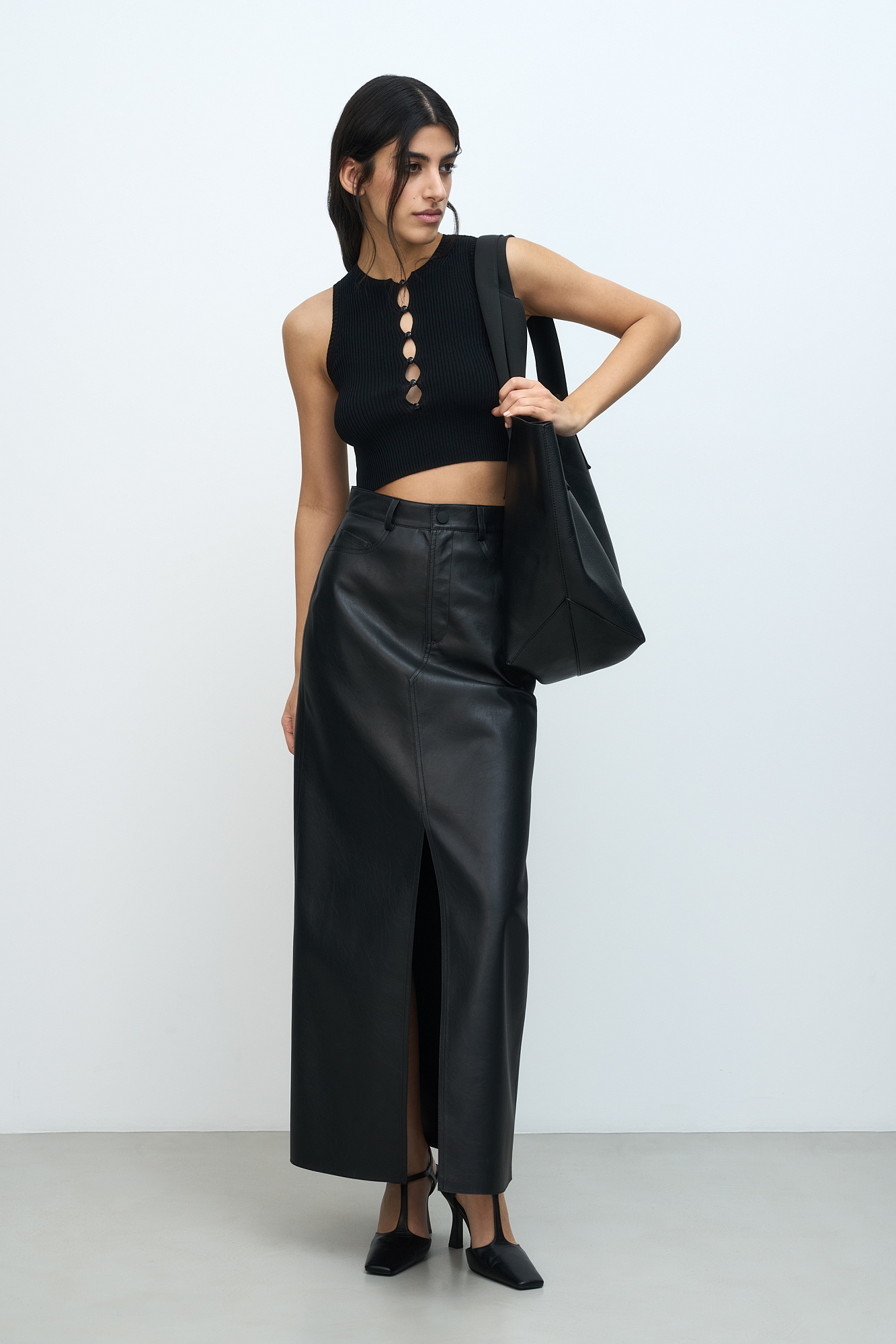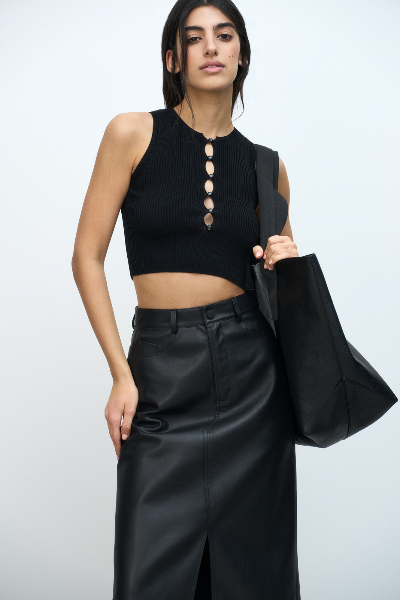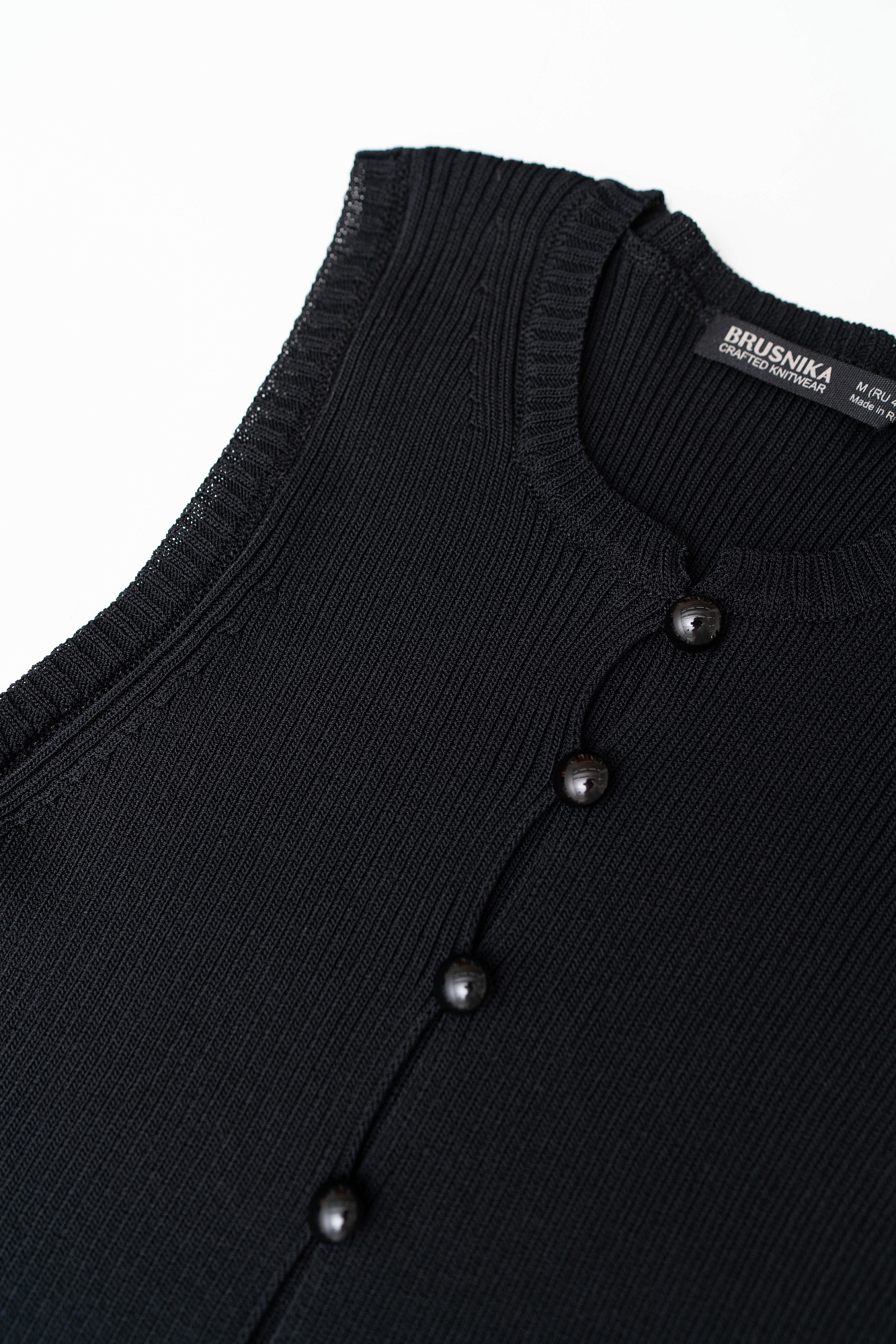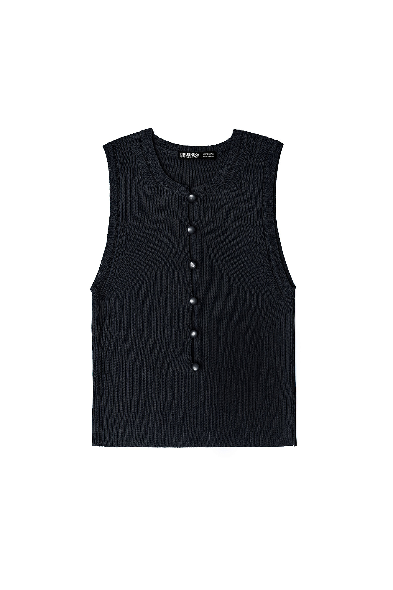 Трикотажный топ без рукавов. Модель с глубоким вырезом на пуговицах.