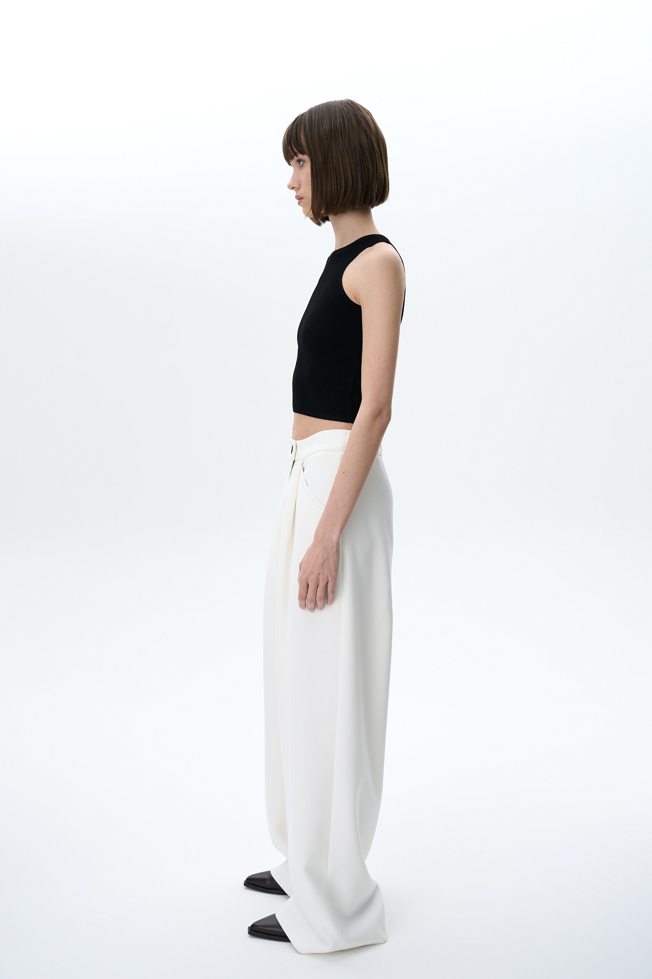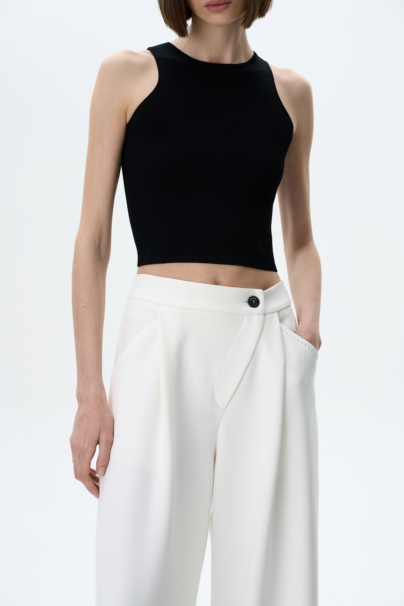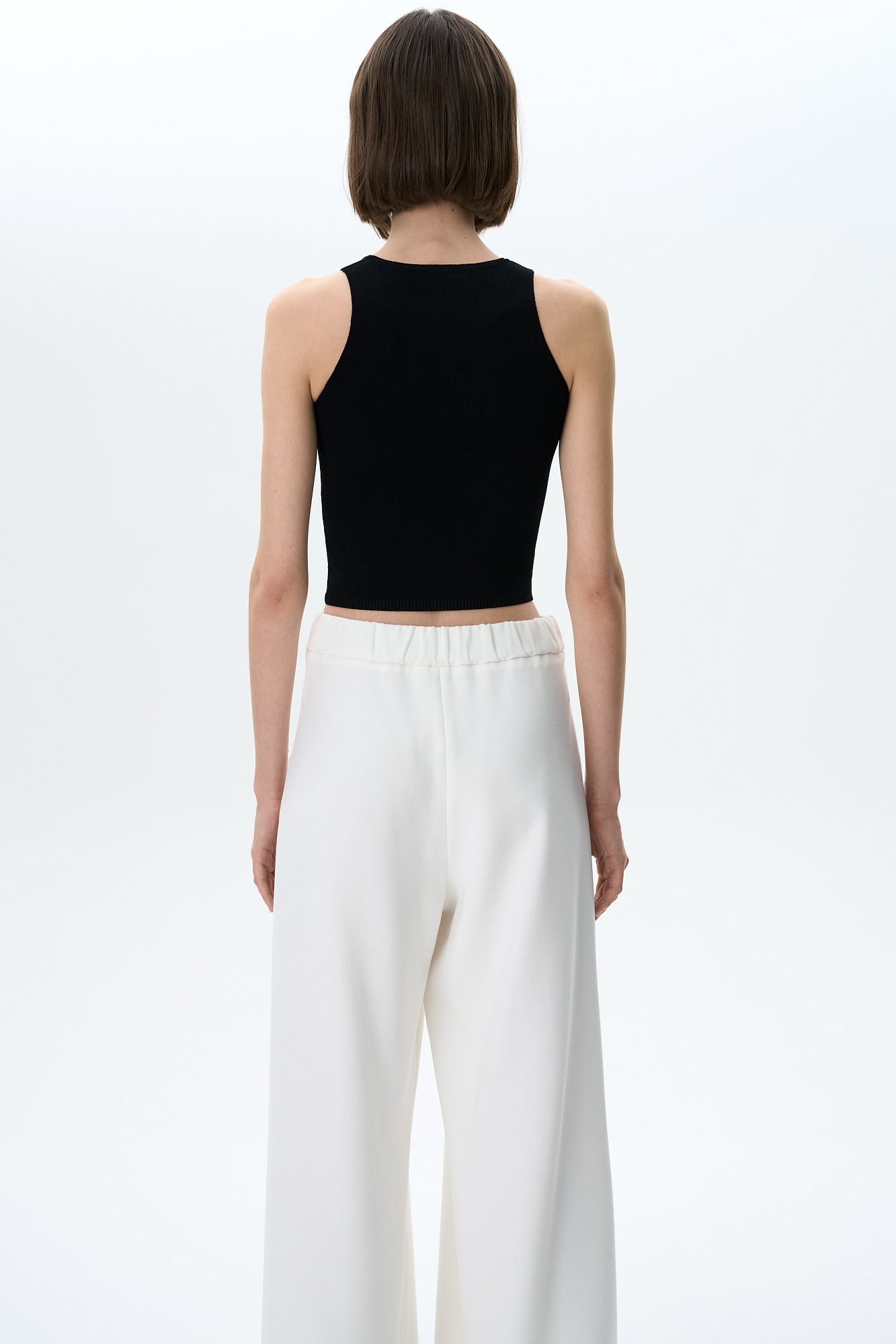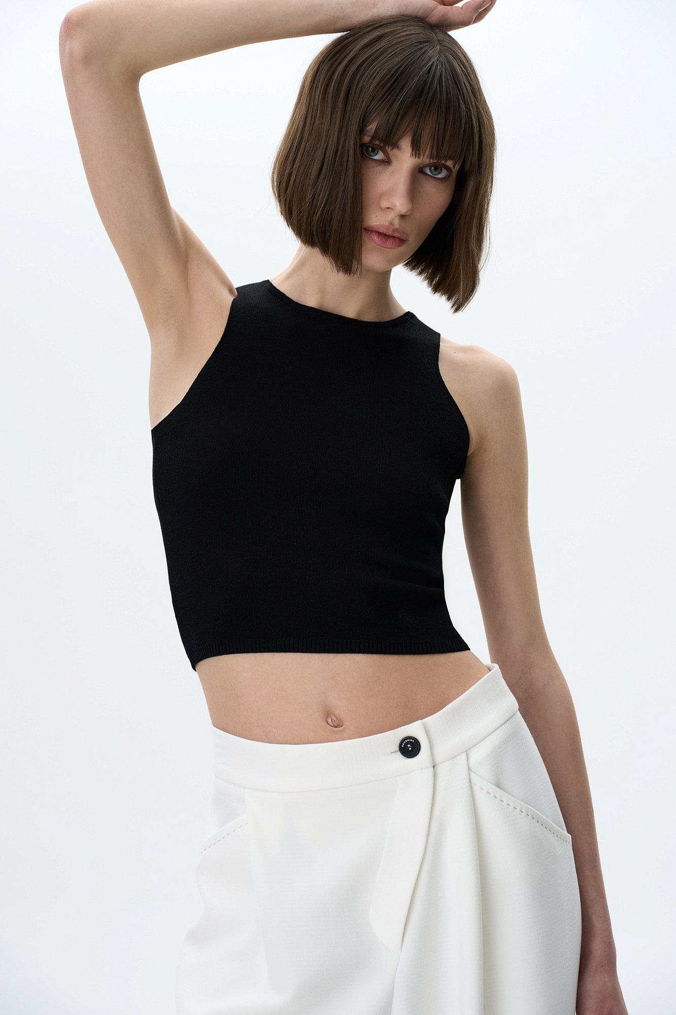 Трикотажный укороченный топ из вискозы. Модель без рукавов с круглым вырезом горловины.