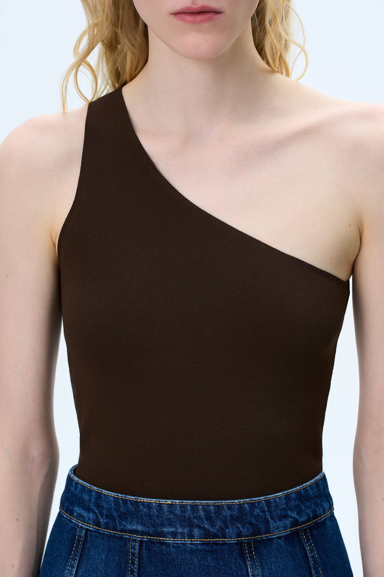 Трикотажный топ из вискозы. Модель облегающего силуэта, с лямкой на одно плечо.