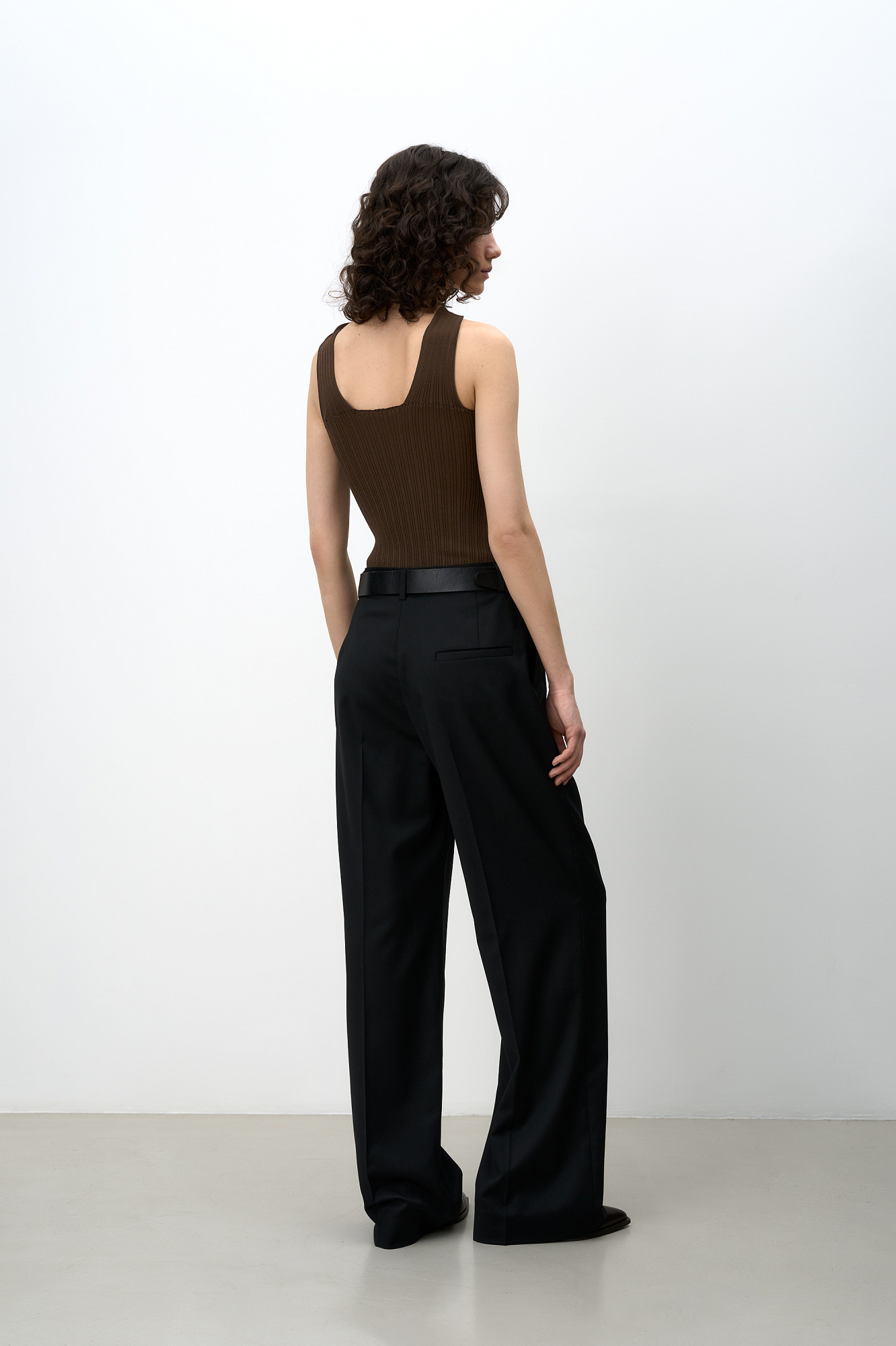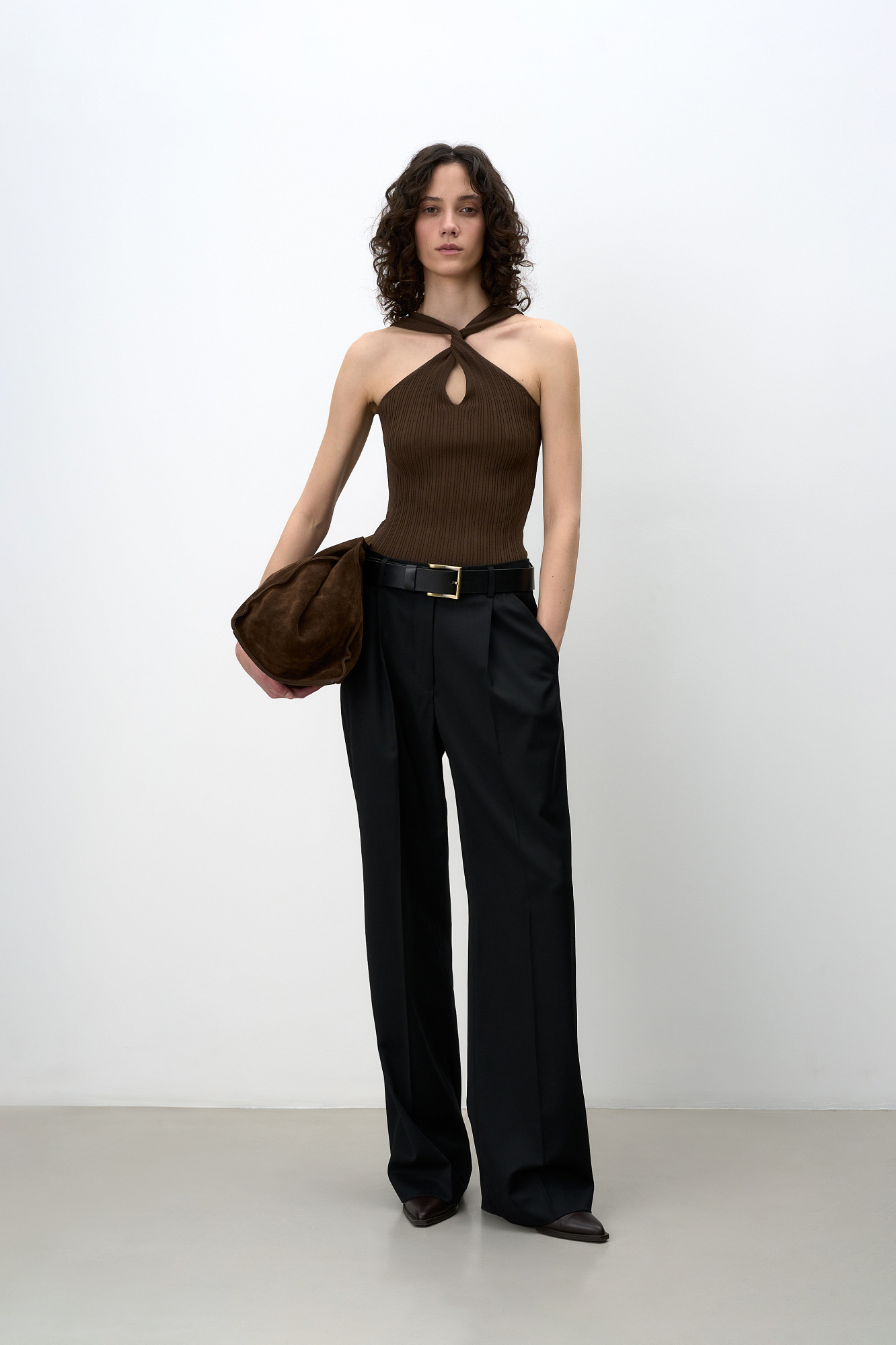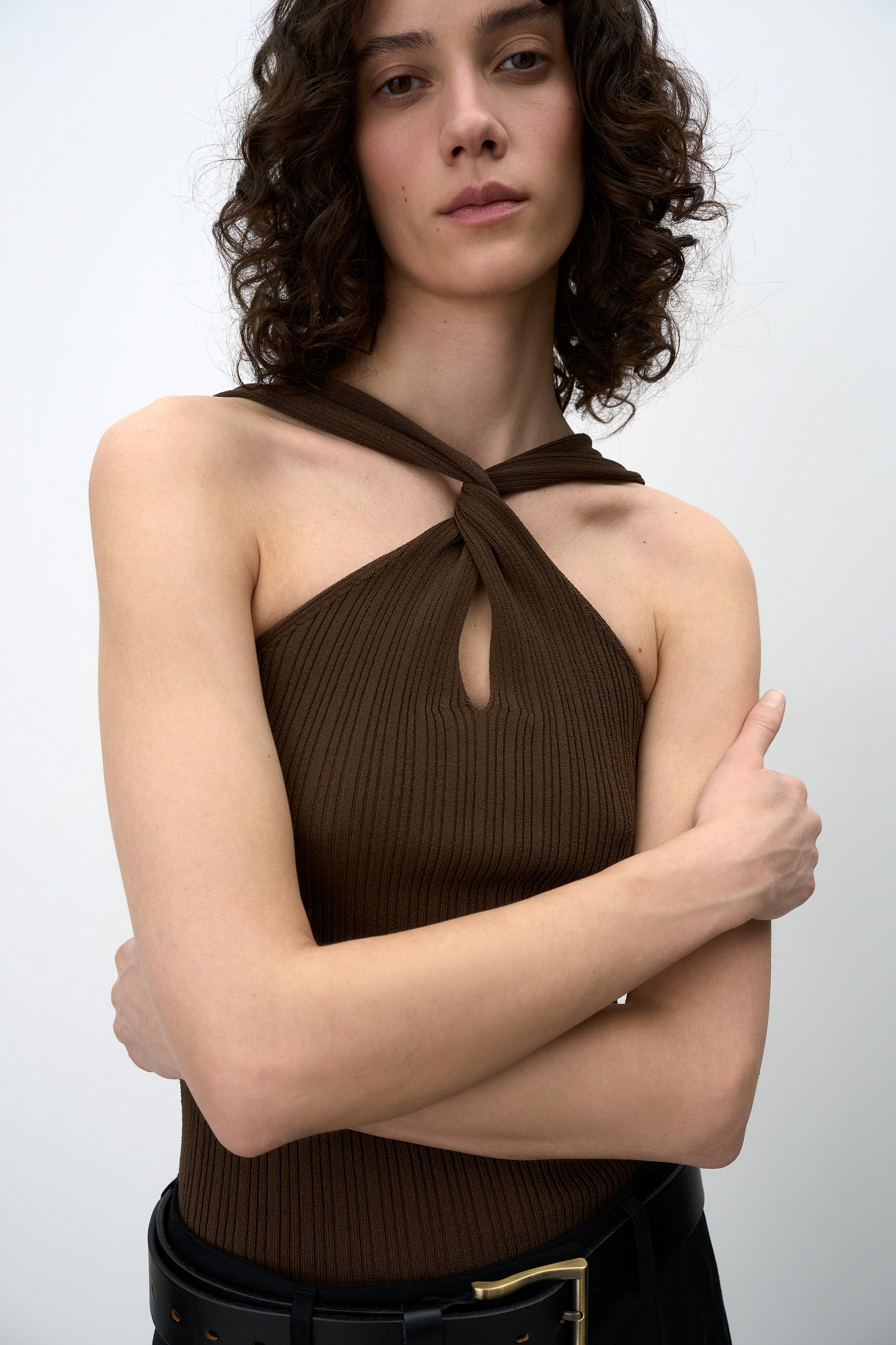 Трикотажный топ с двойным перекрутом на груди. Модель приталенного силуэта с открытыми плечами.