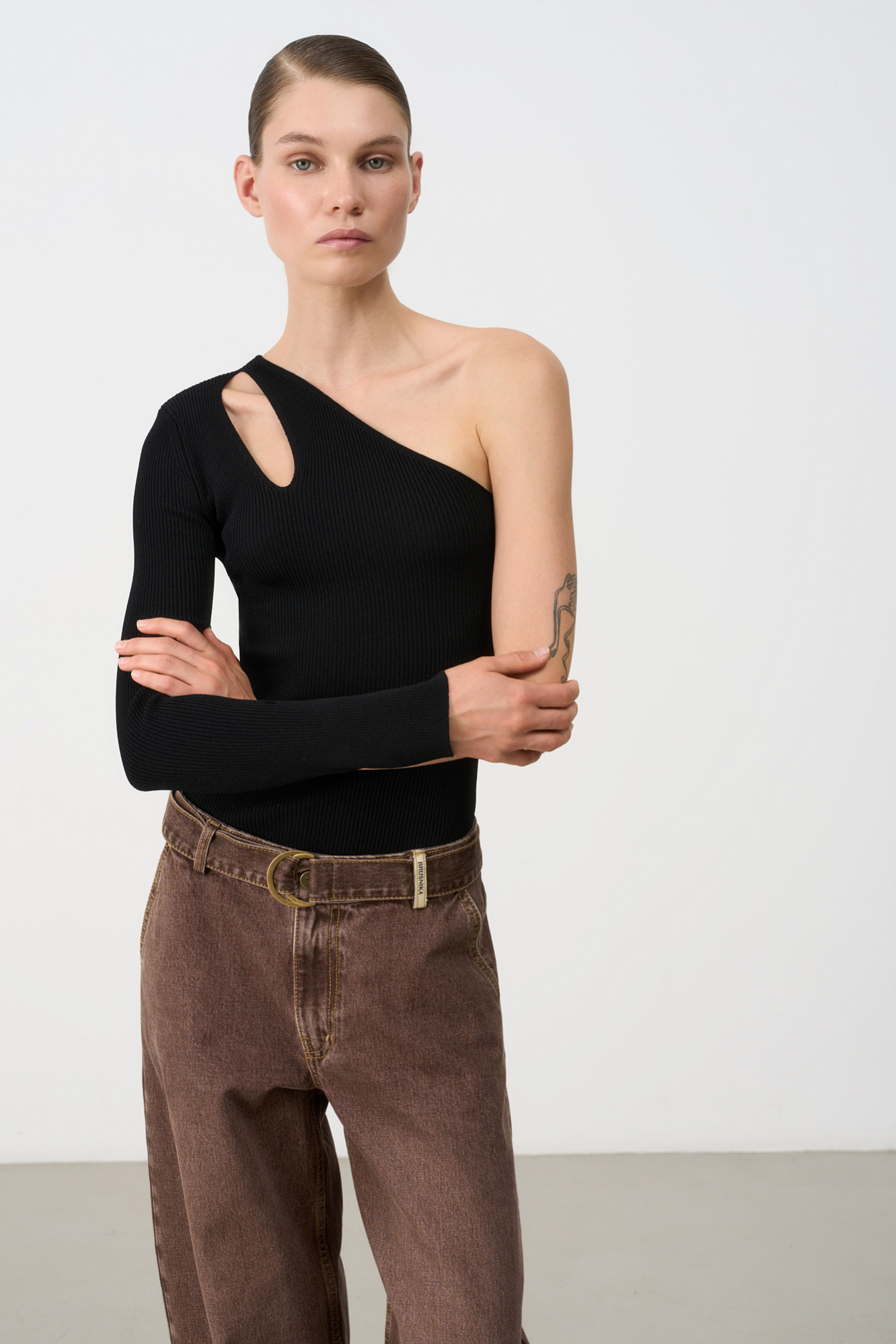 Трикотажный топ из вискозы. Модель асимметричного кроя с одним длинным рукавом и открытым плечом. Декоративный вырез на плече. Облегающий силуэт, фактурная ткань в мелкий рубчик.