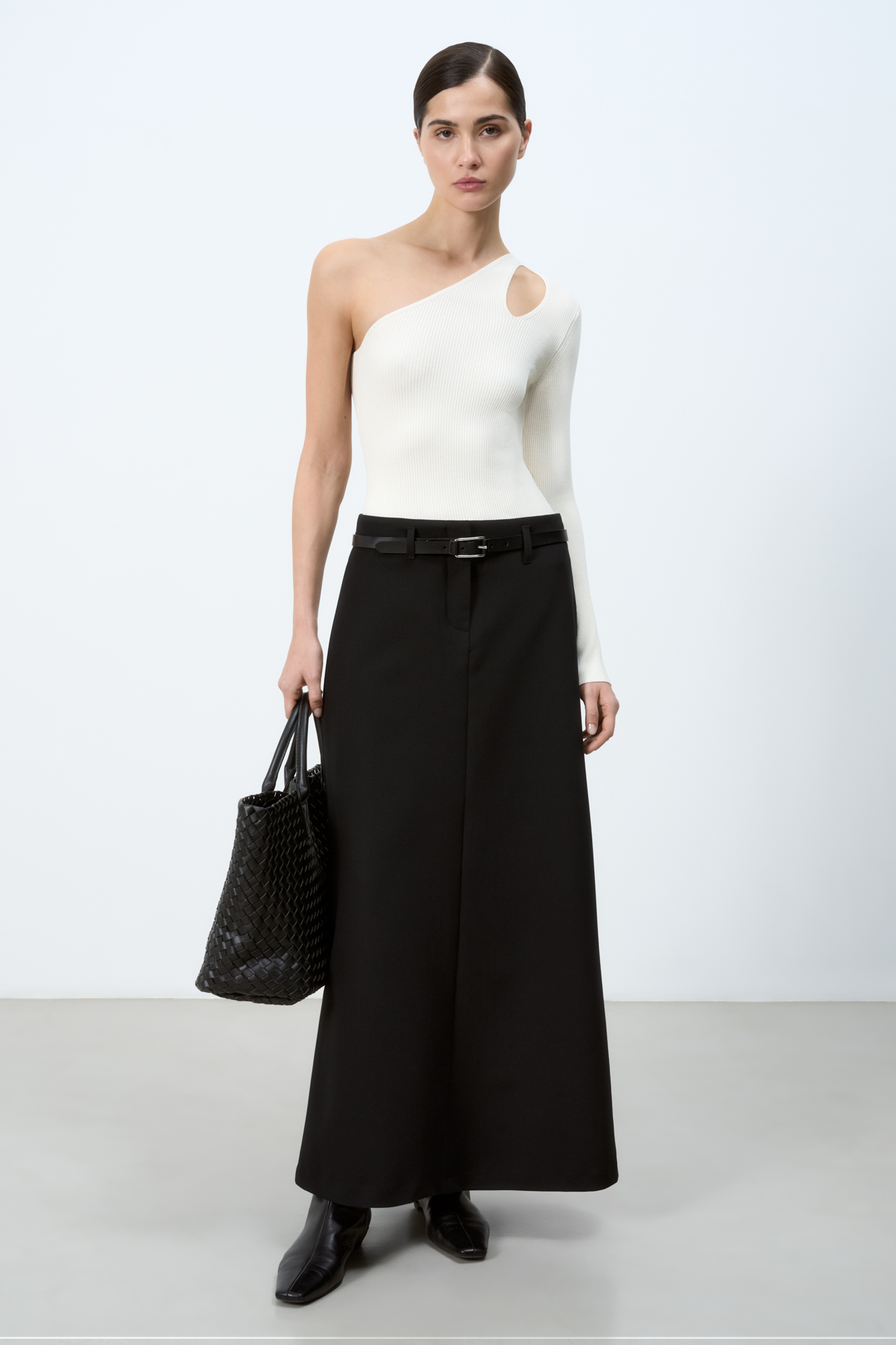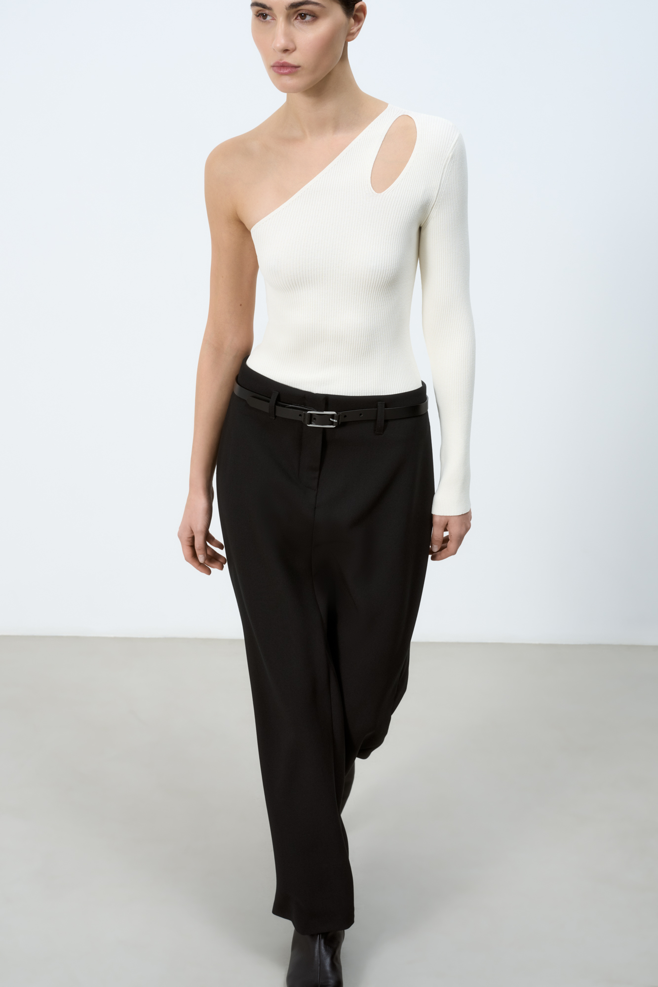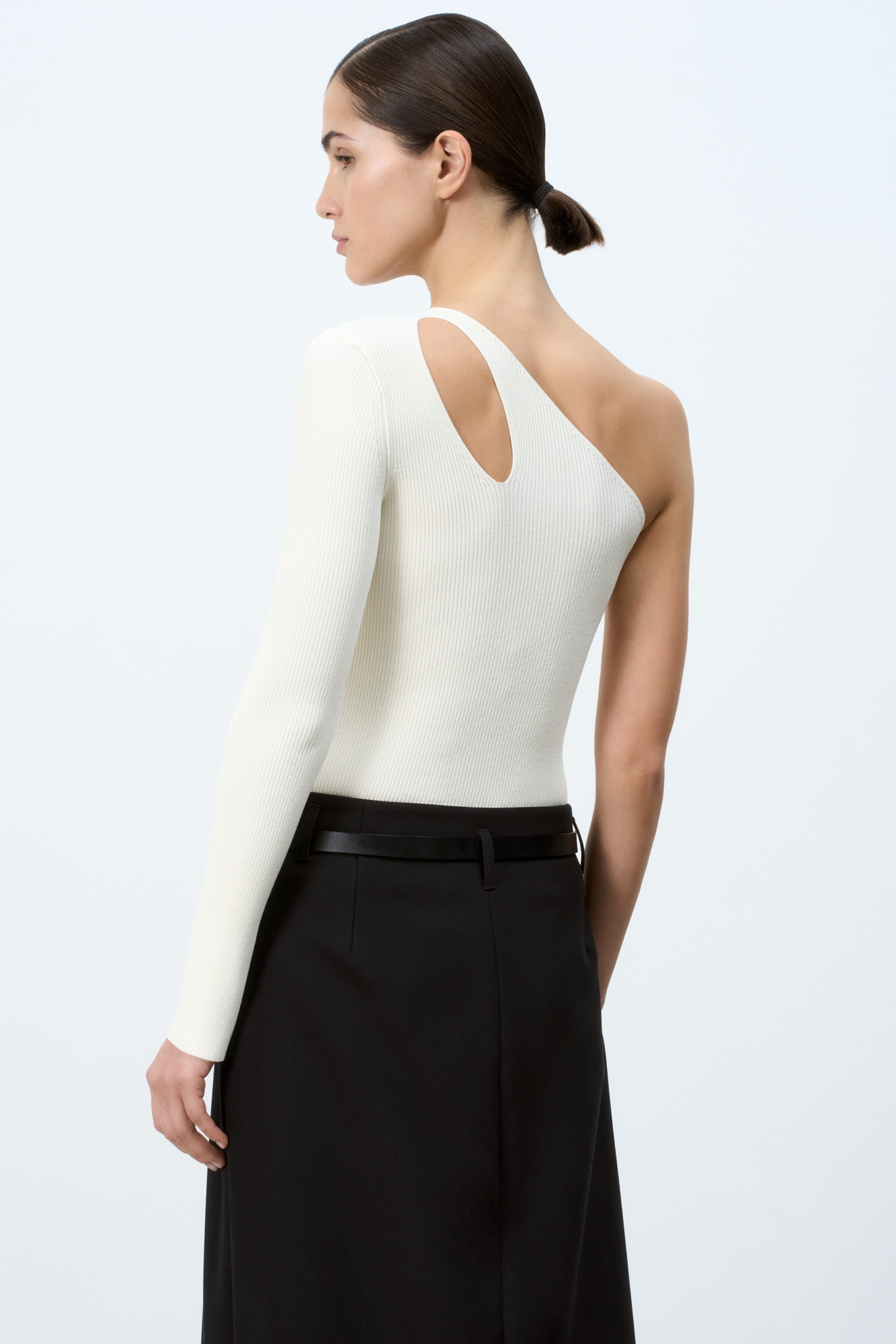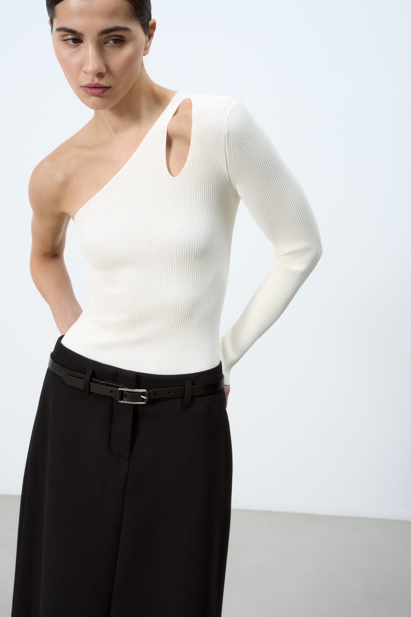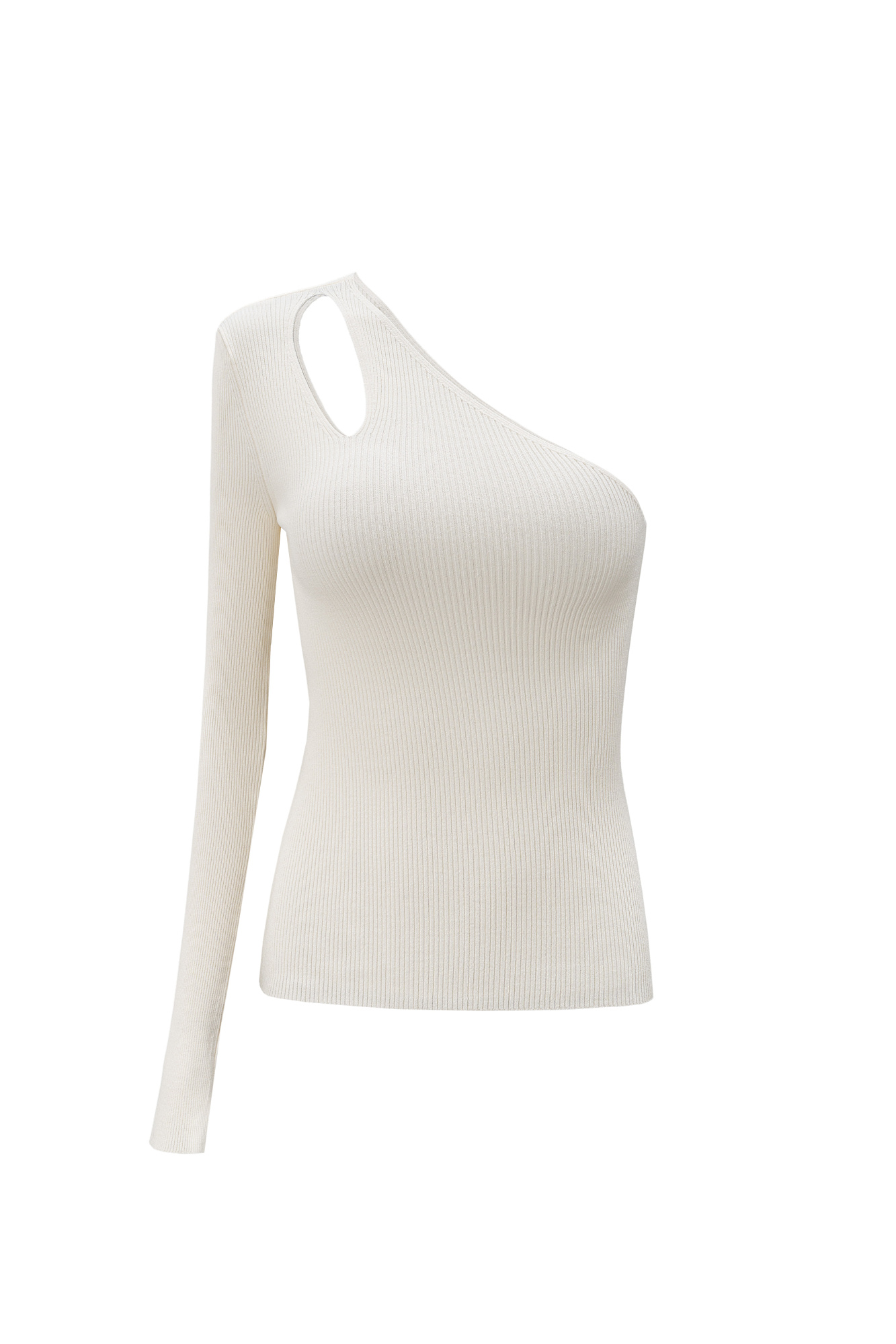 Трикотажный топ из вискозы. Модель асимметричного кроя с одним длинным рукавом и открытым плечом. Декоративный вырез на плече. Облегающий силуэт, фактурная ткань в мелкий рубчик.