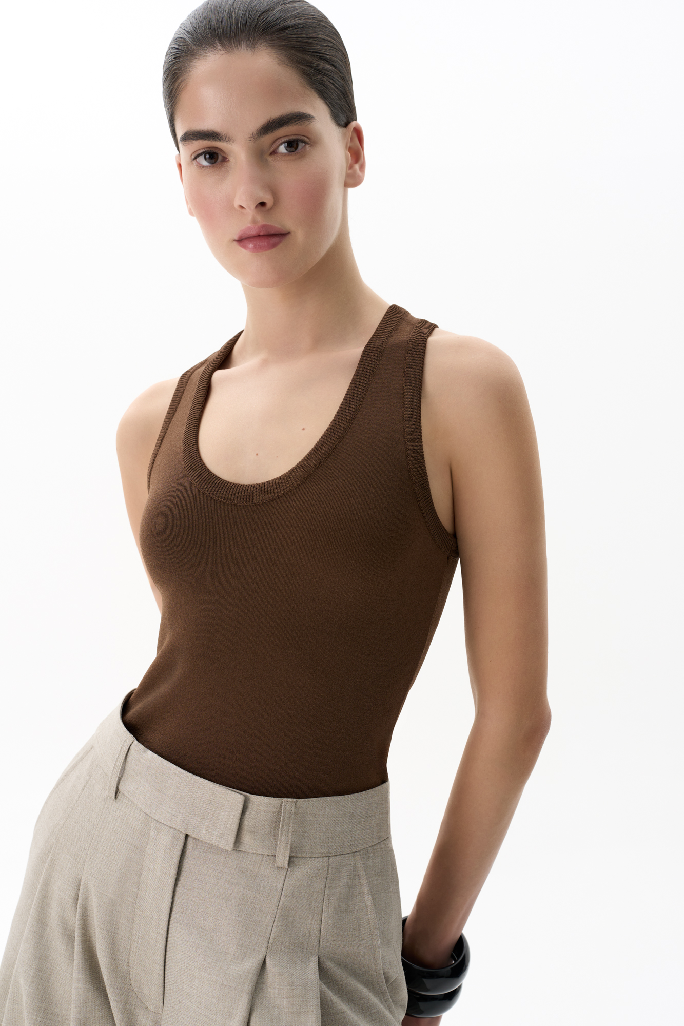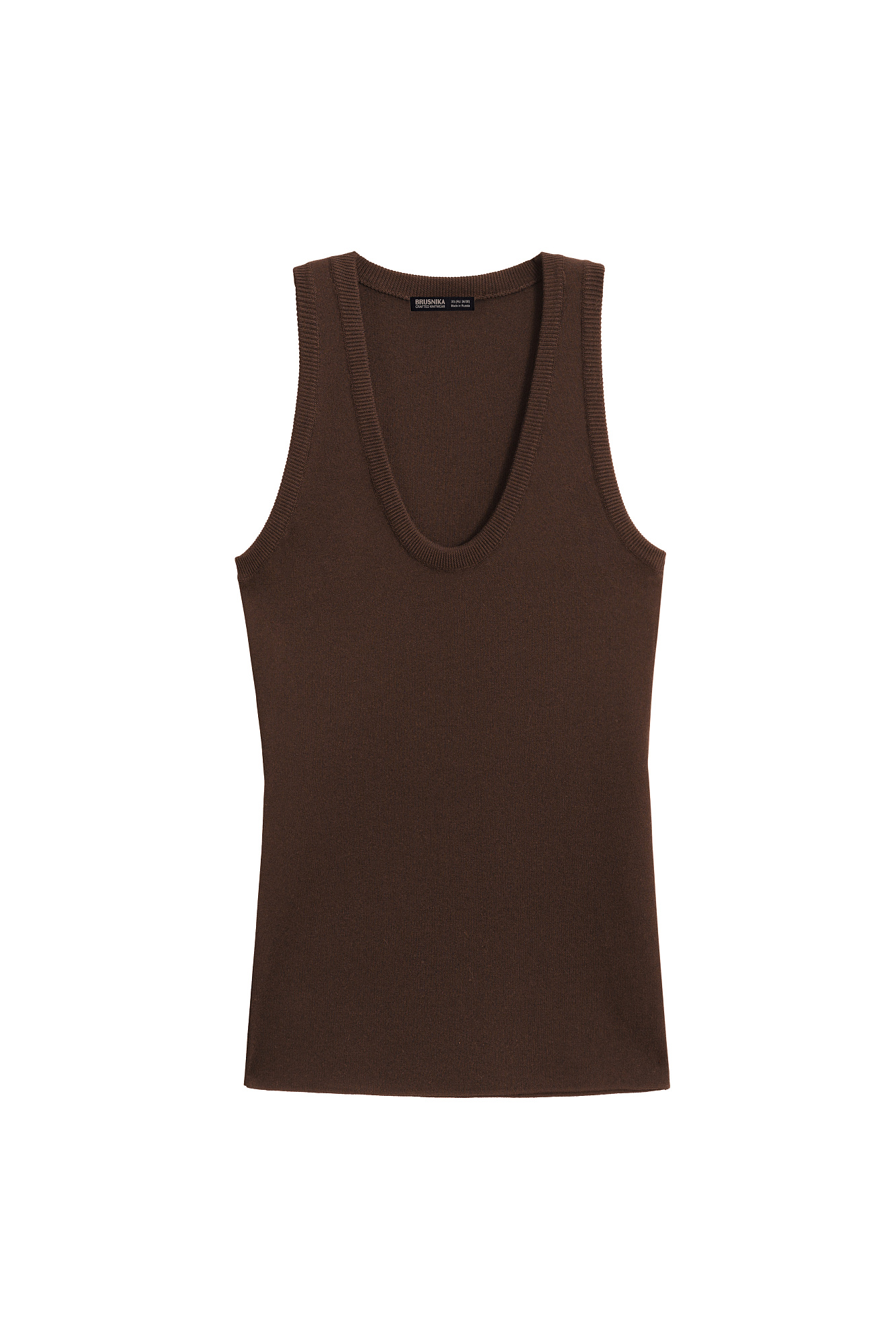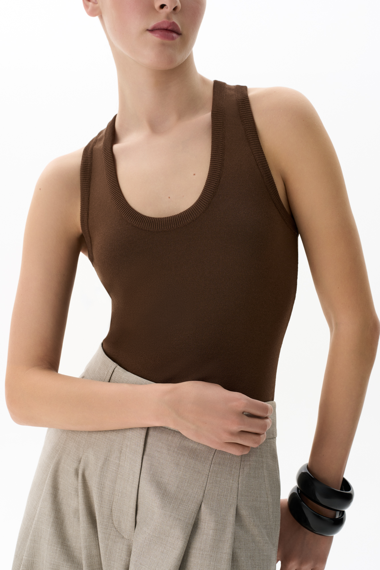 Трикотажный топ из вискозы. Модель приталенного силуэта, с U-образным вырезом горловины и глубокой проймой.