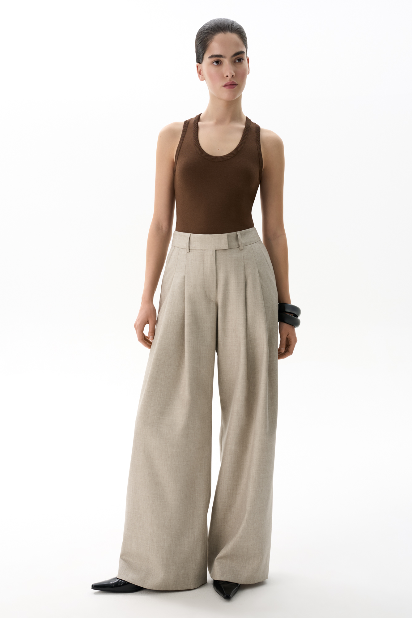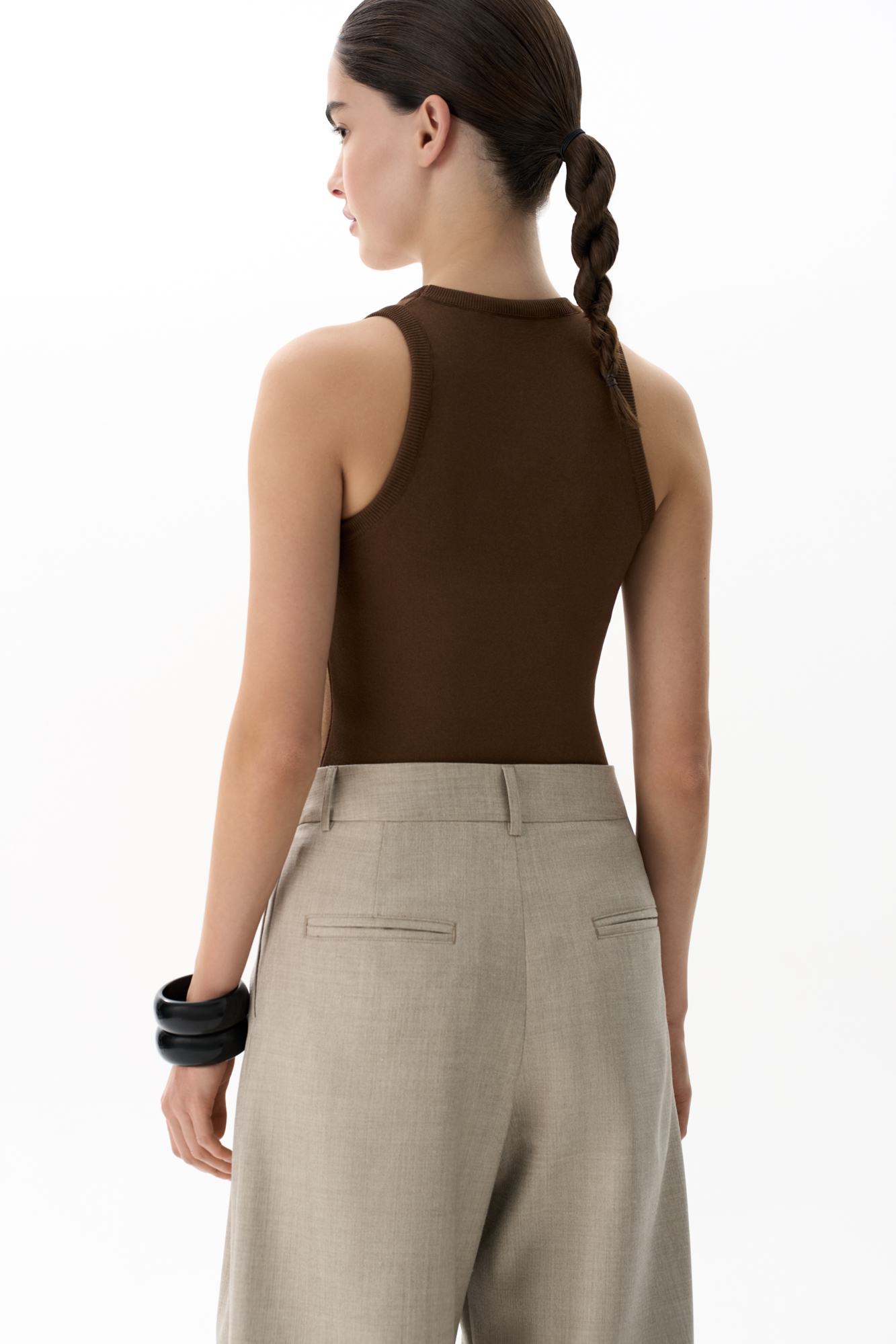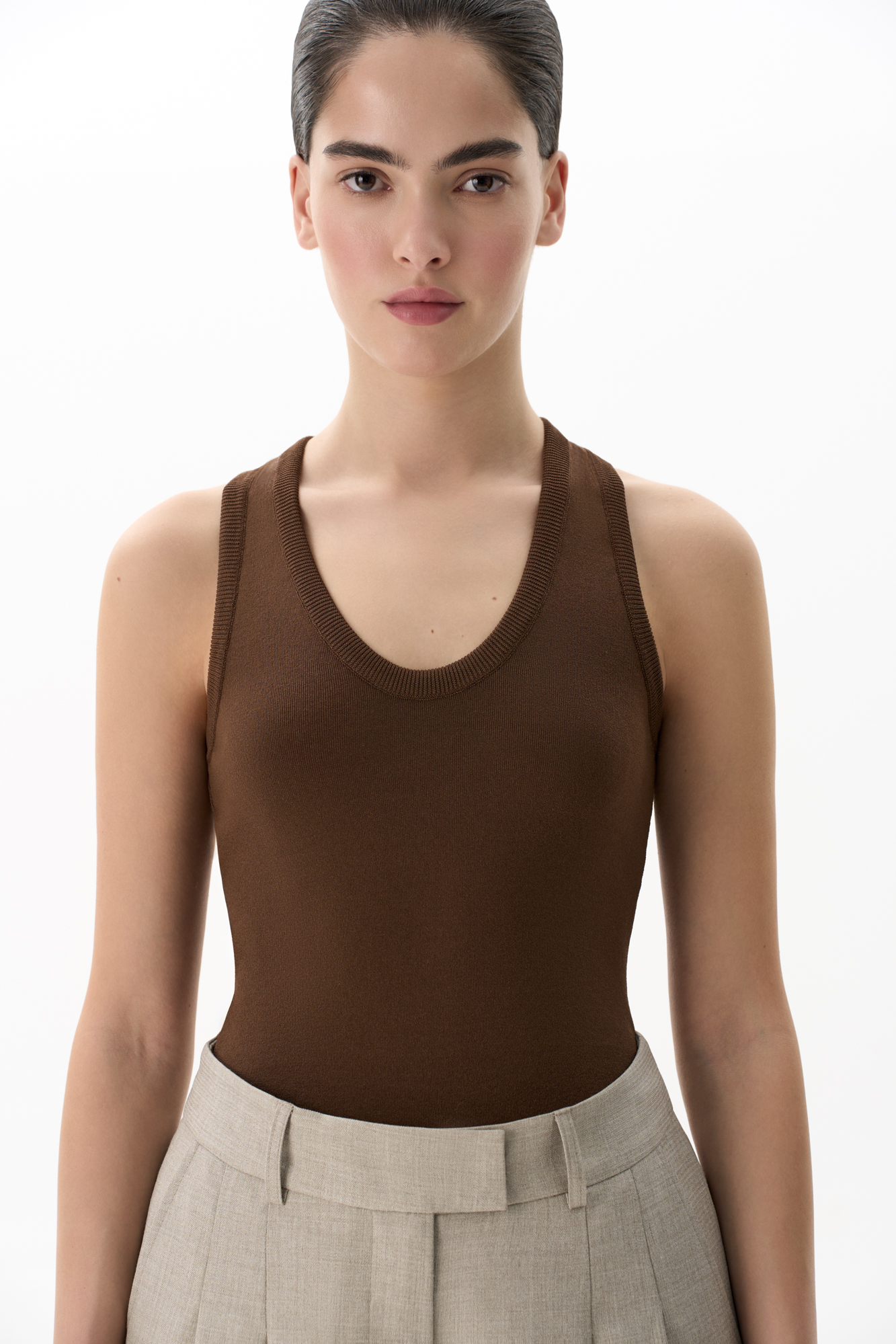 Трикотажный топ из вискозы. Модель приталенного силуэта, с U-образным вырезом горловины и глубокой проймой.