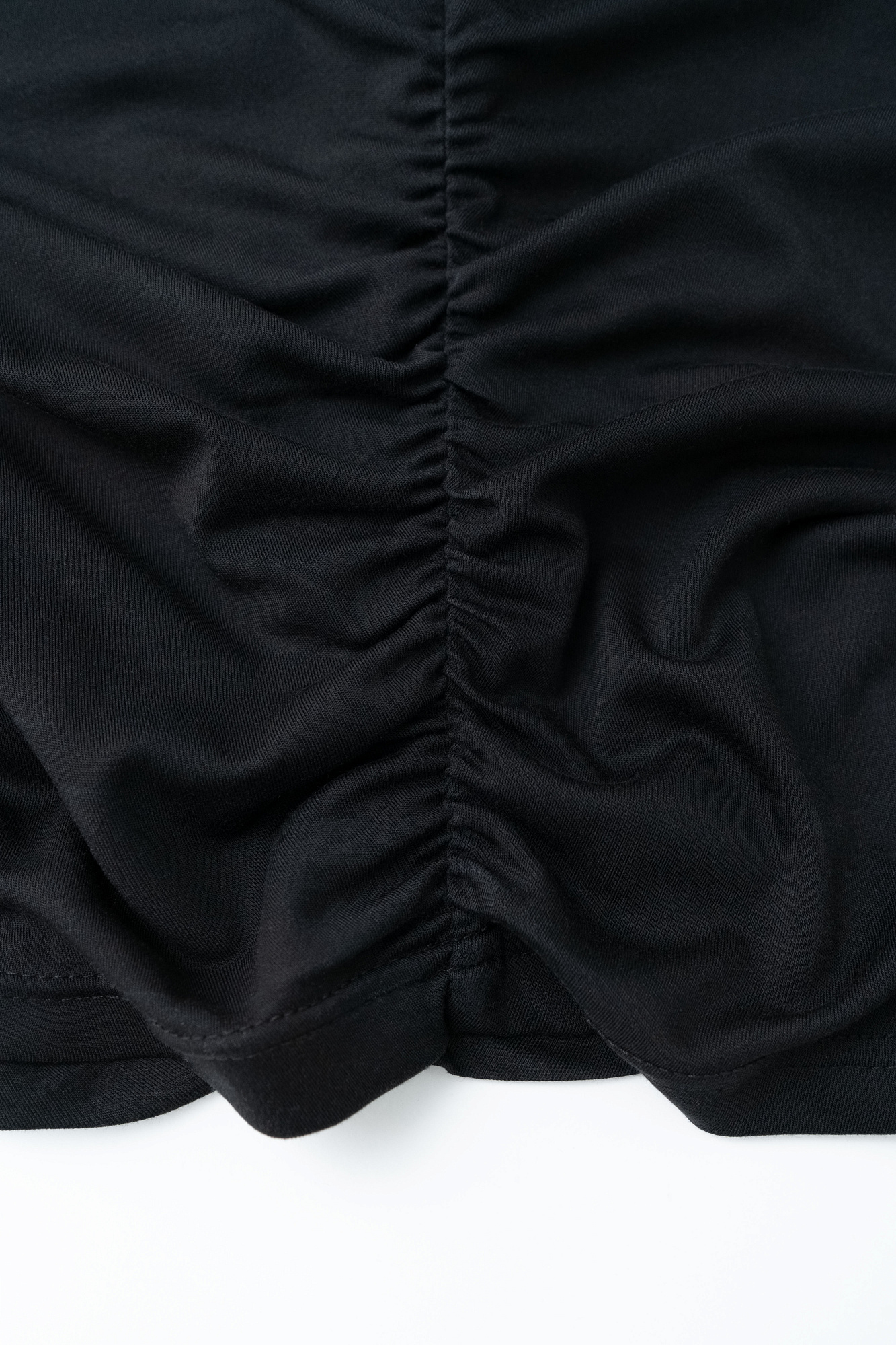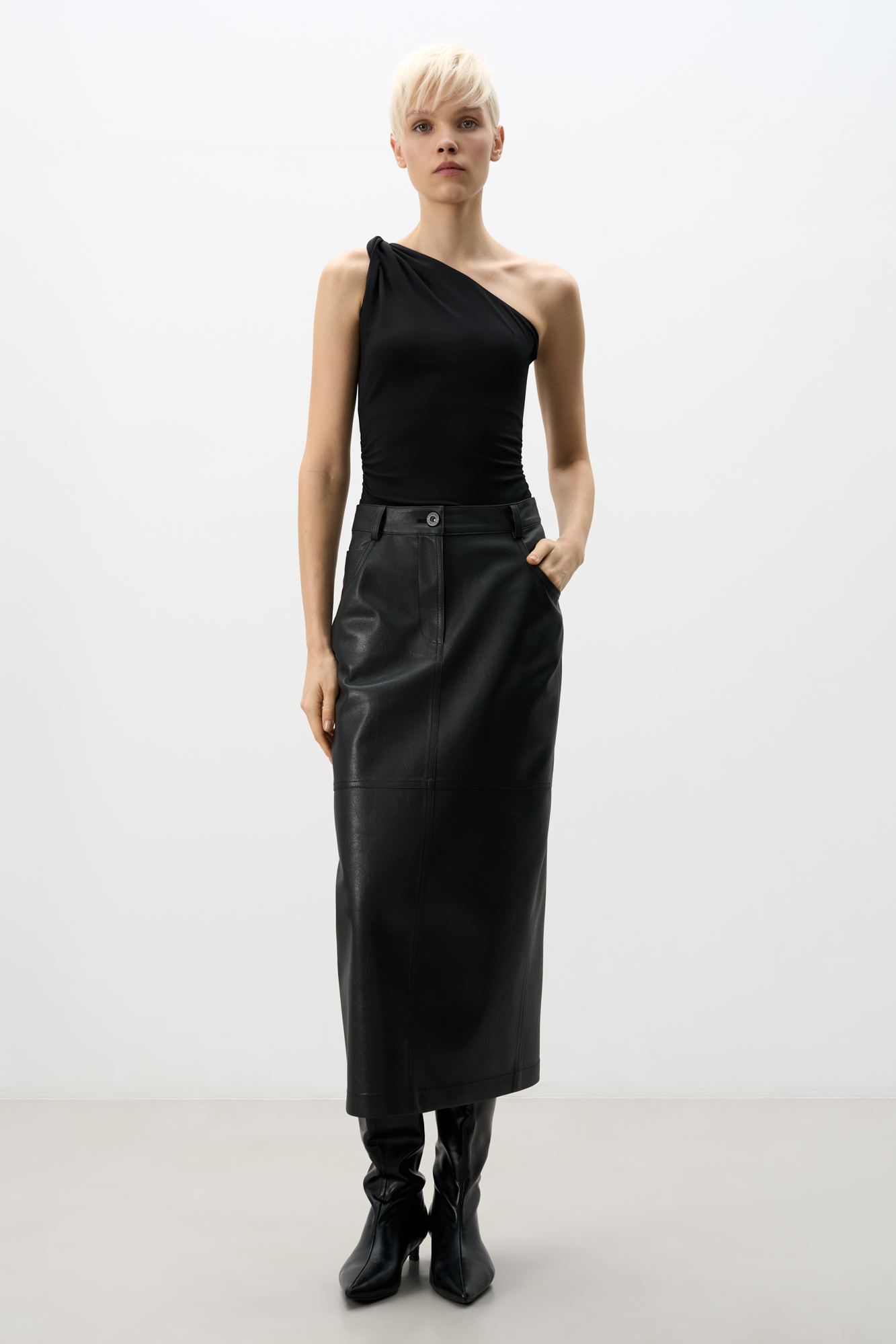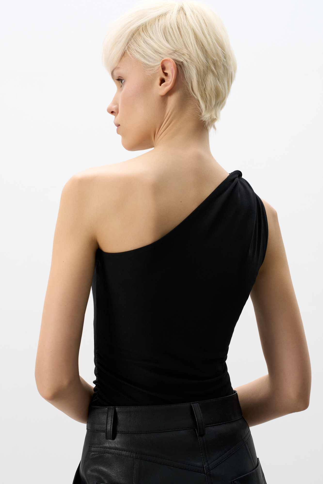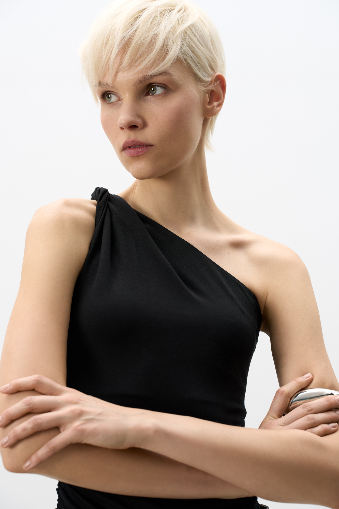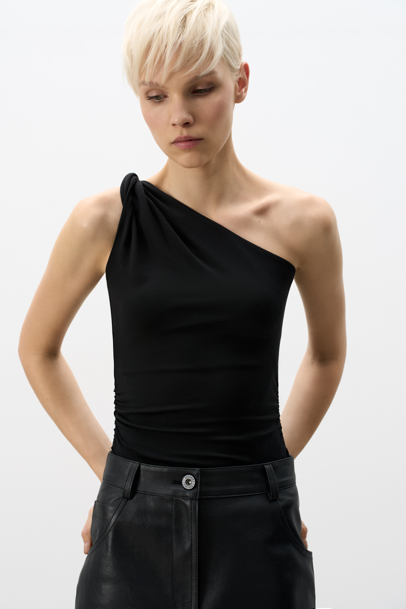 Асимметричный топ из модала. Модель приталенного силуэта с открытым плечом, перекрутом на лямке и драпировкой.