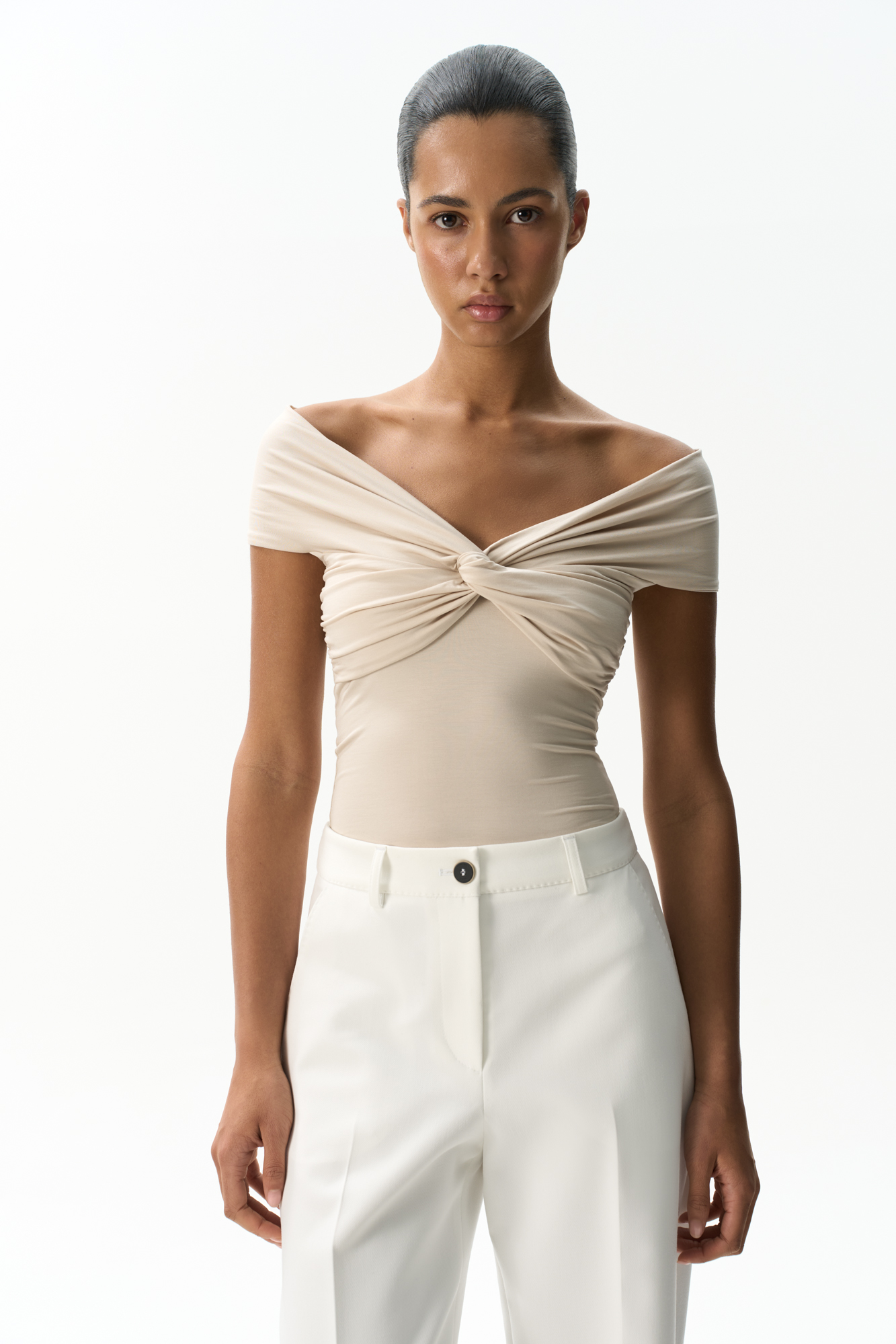 Топ из модала с открытой линией плеч. Модель приталенного силуэта, без рукавов. Изделие декорировано перекрутом на груди и драпировкой на лифе.