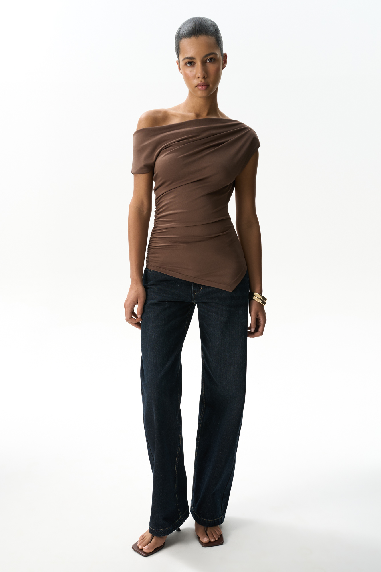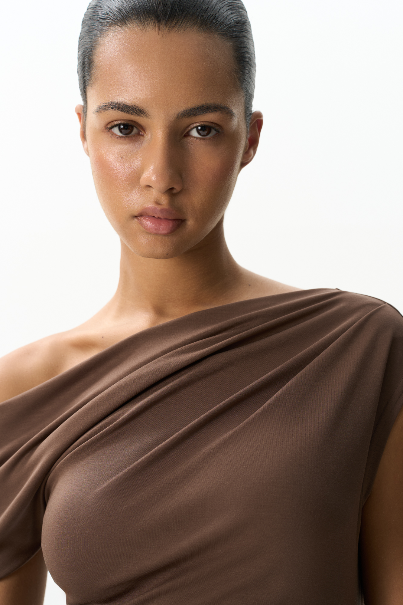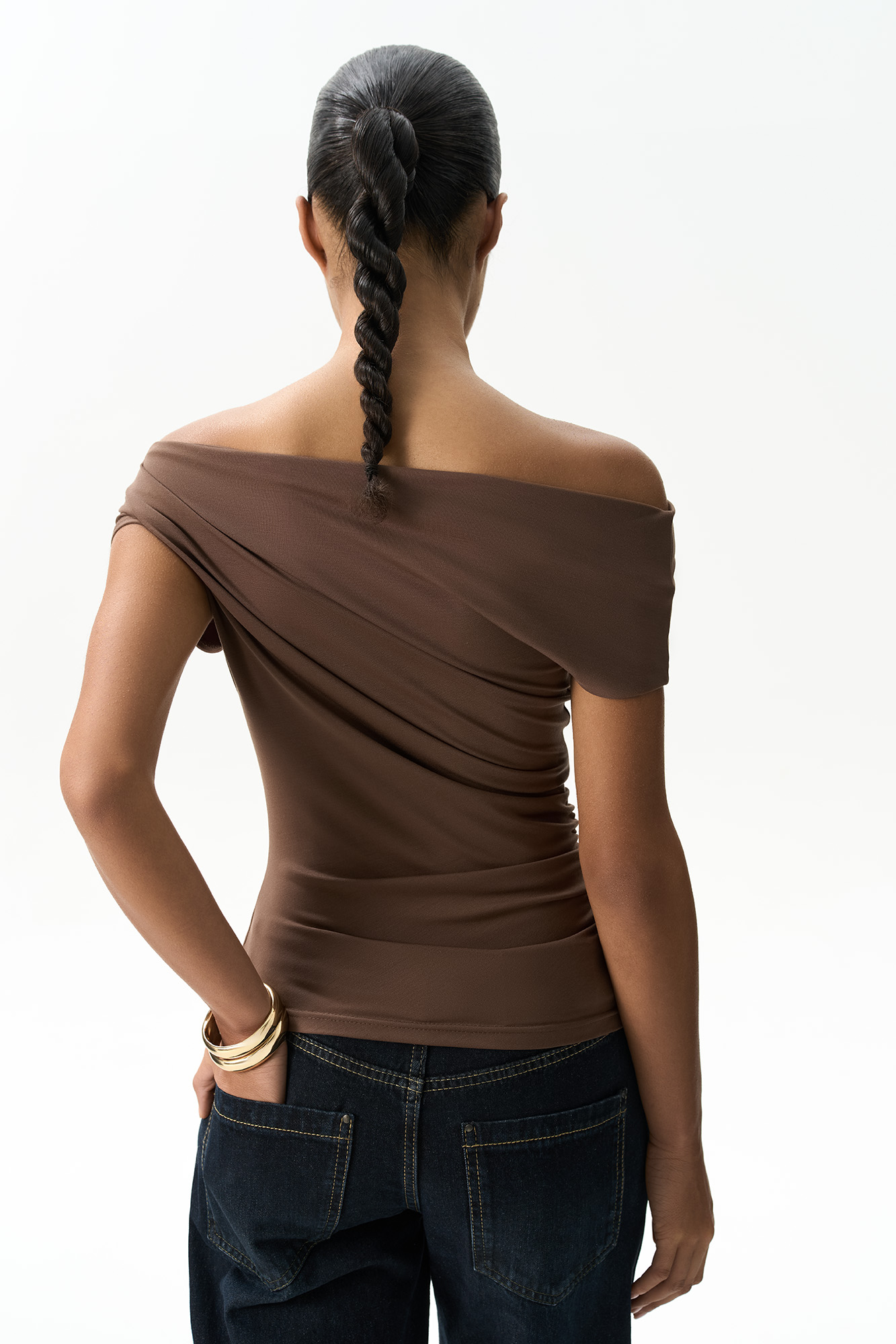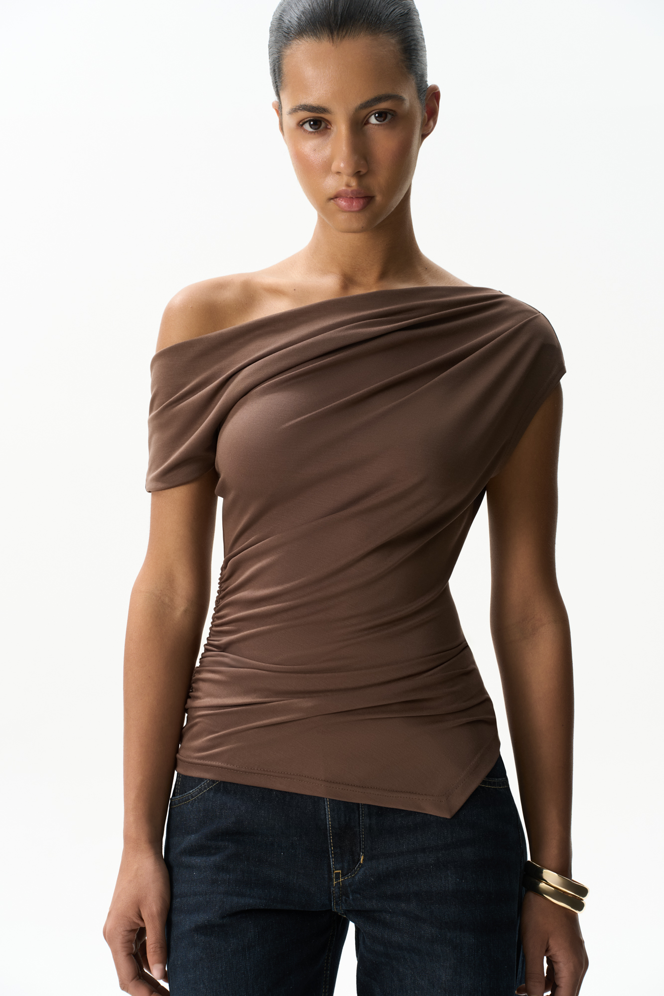 Асимметричный топ из модала. Модель приталенного силуэта с акцентом на одно плечо. Изделие декорировано драпировкой и мягкими складками.
