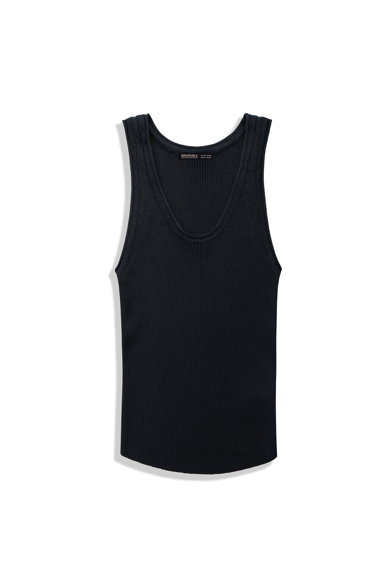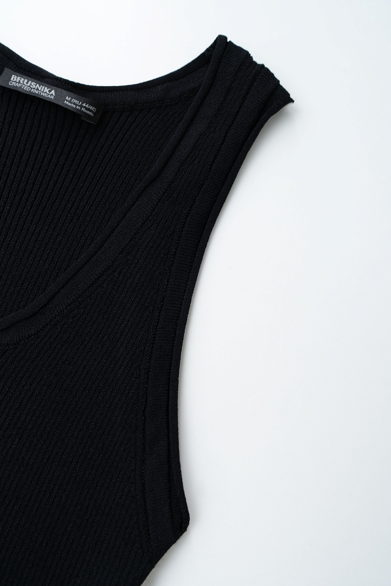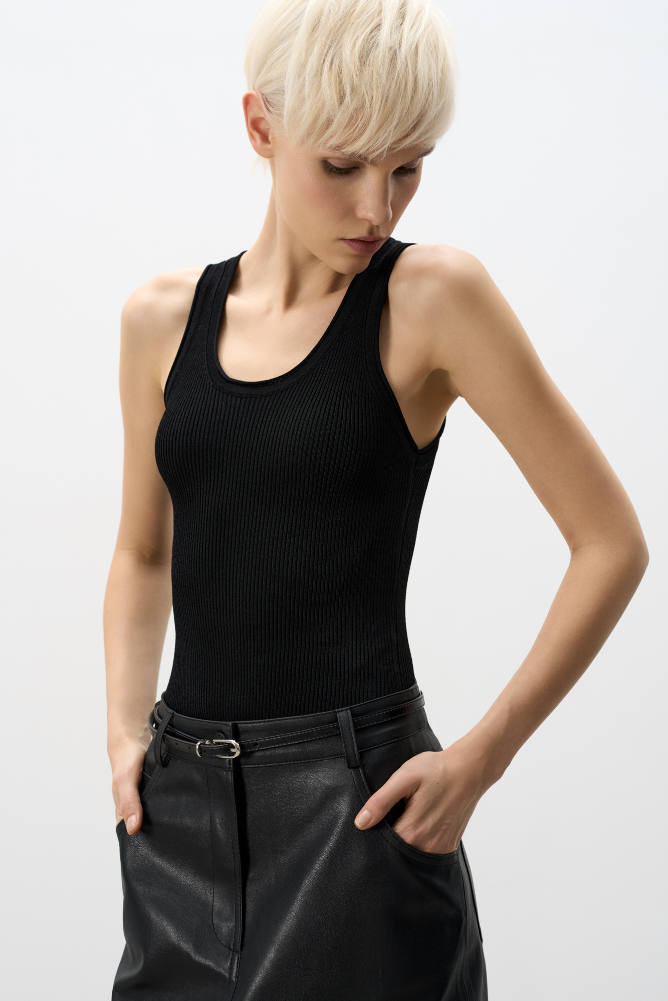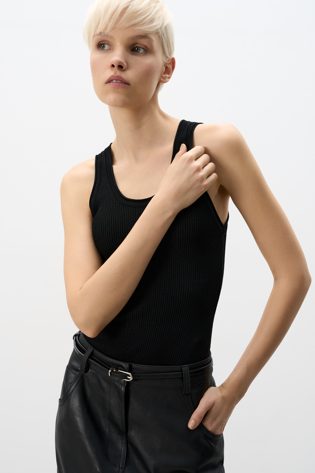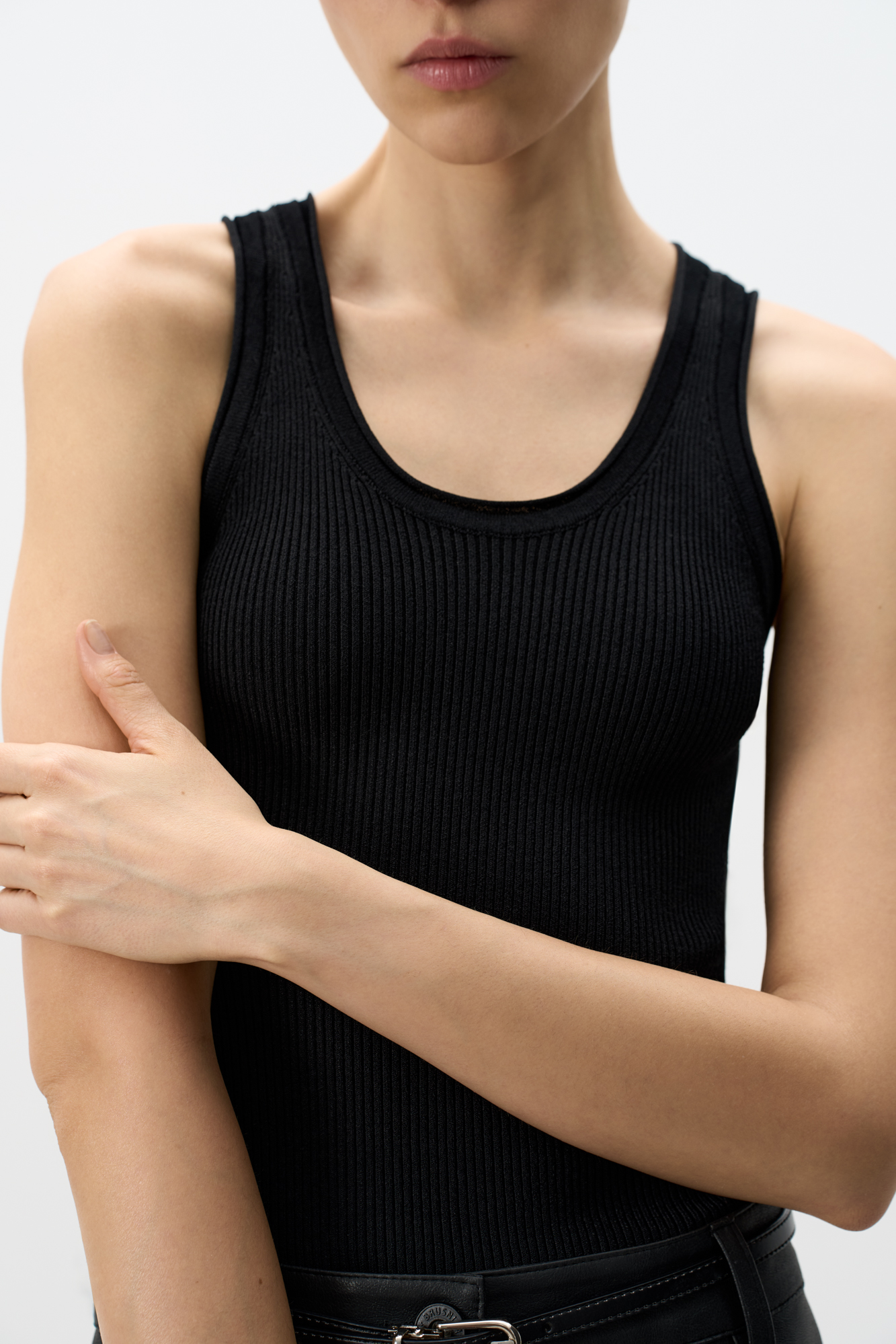 Трикотажная майка из вискозы в рубчик. Модель с глубокой проймой, арочным низом и U-образным вырезом горловины с валиком.