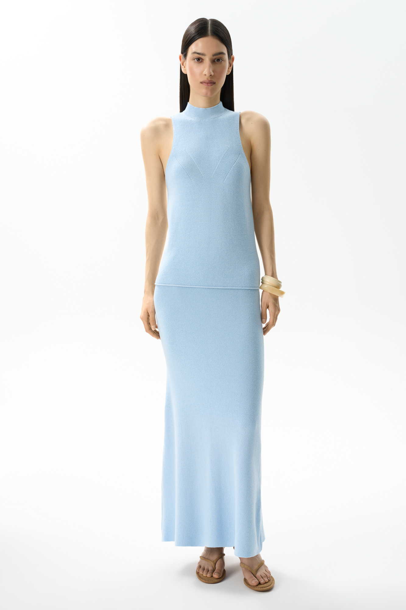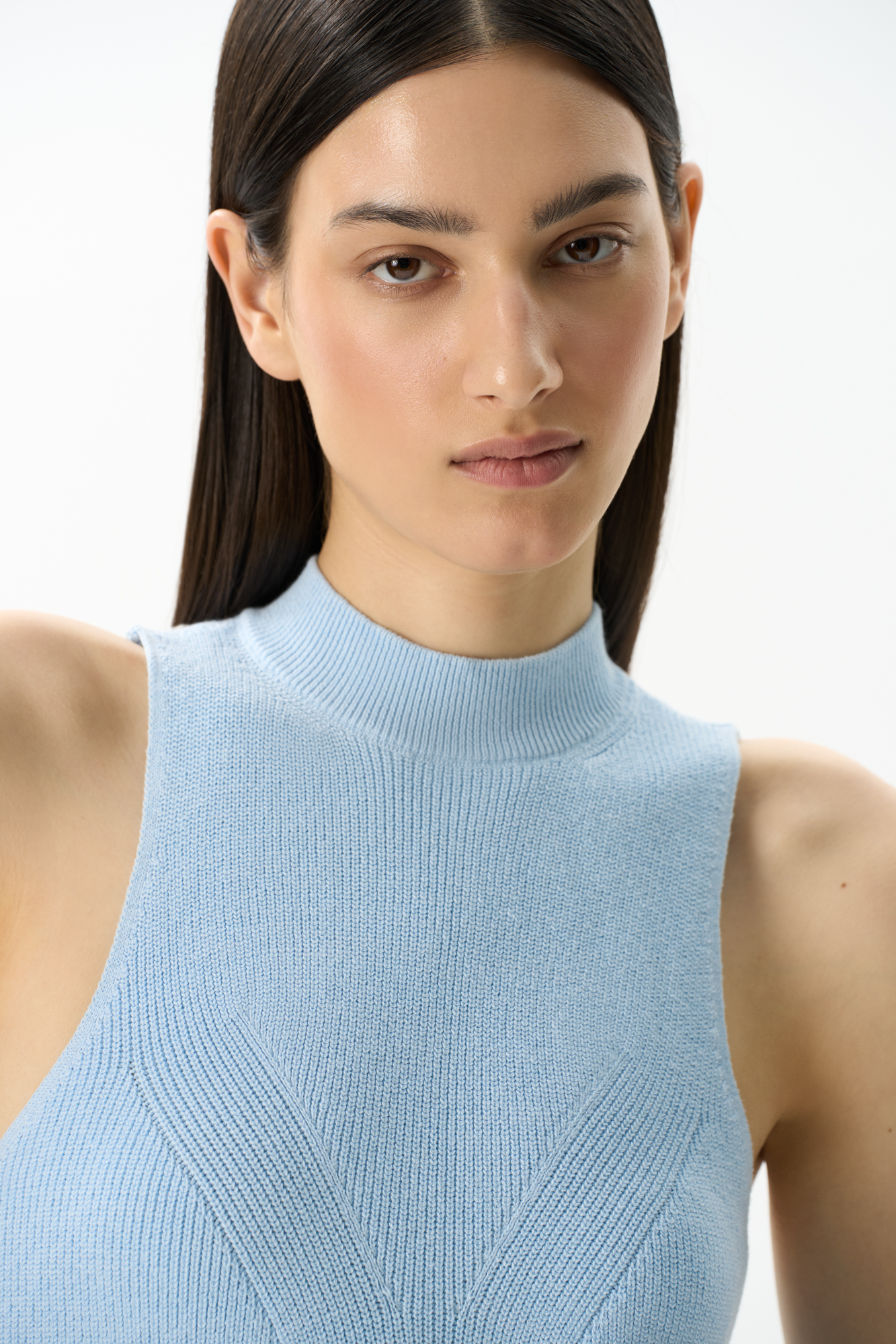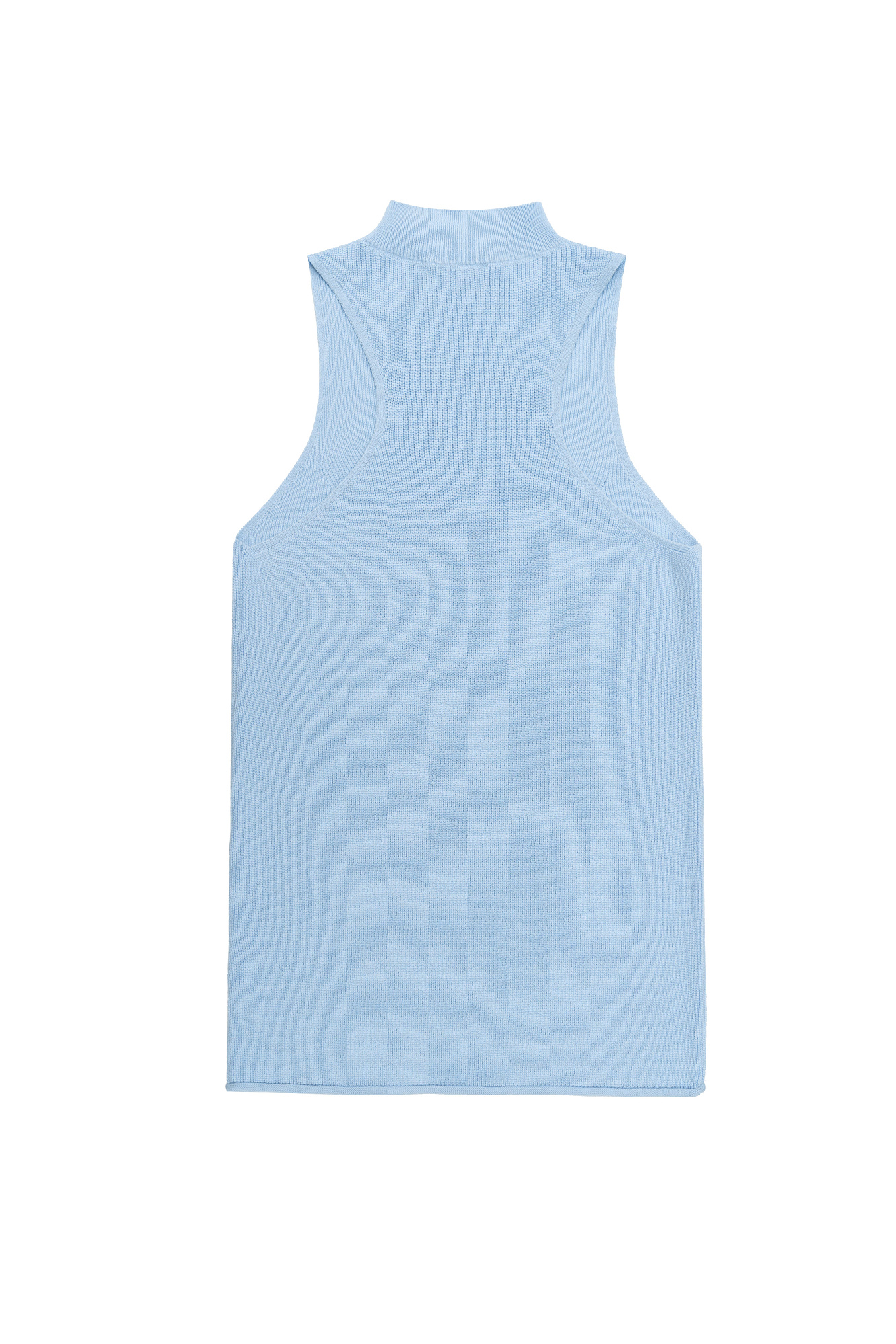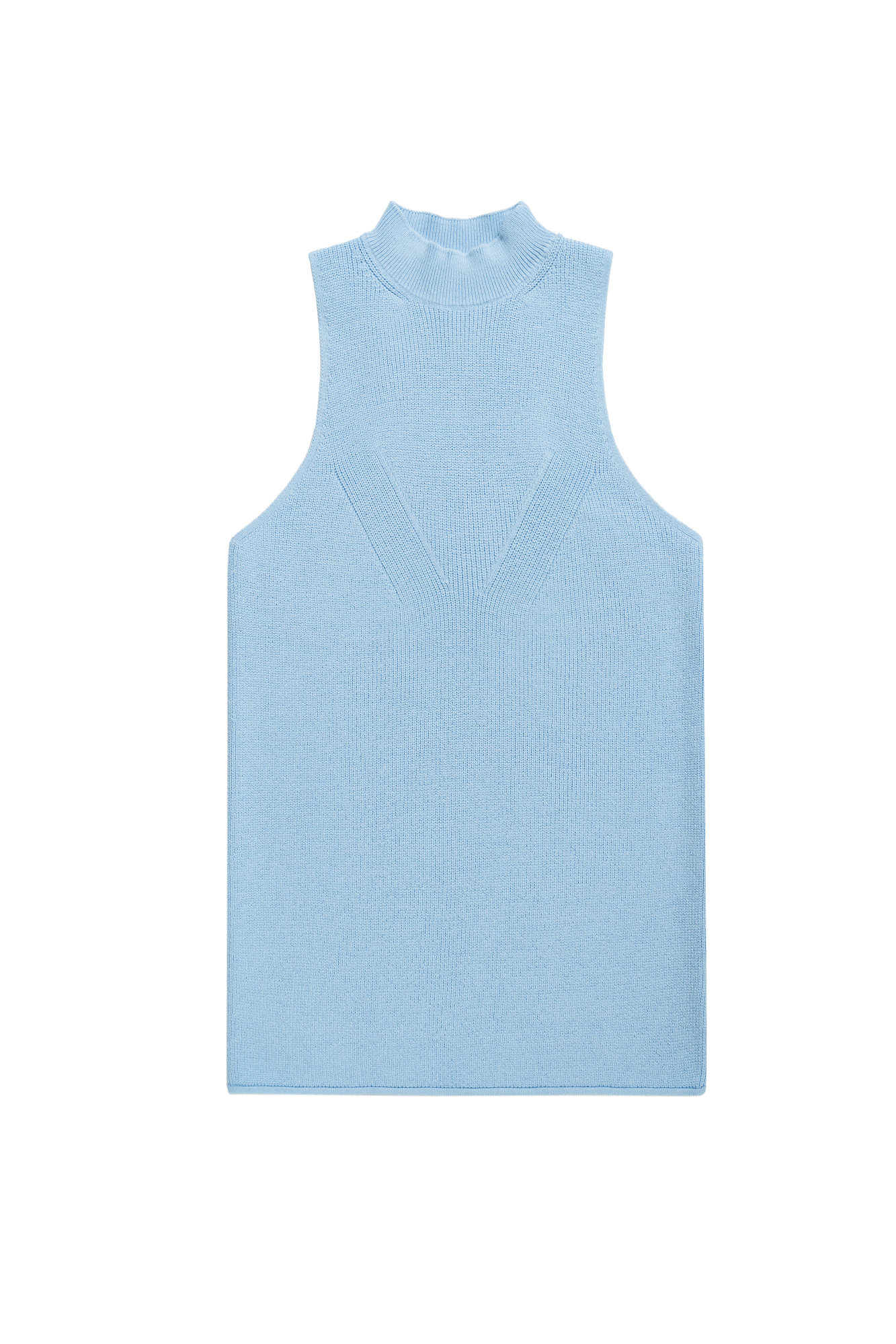 Трикотажный топ из хлопка с добавлением вискозы. Модель с высоким воротником-стойкой и глубокой проймой. Воротник изделия выполнен в мелкий рубчик.