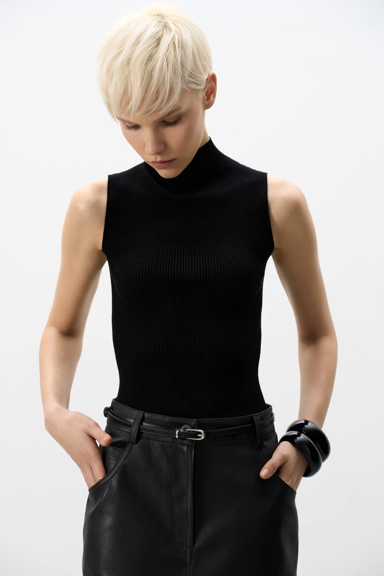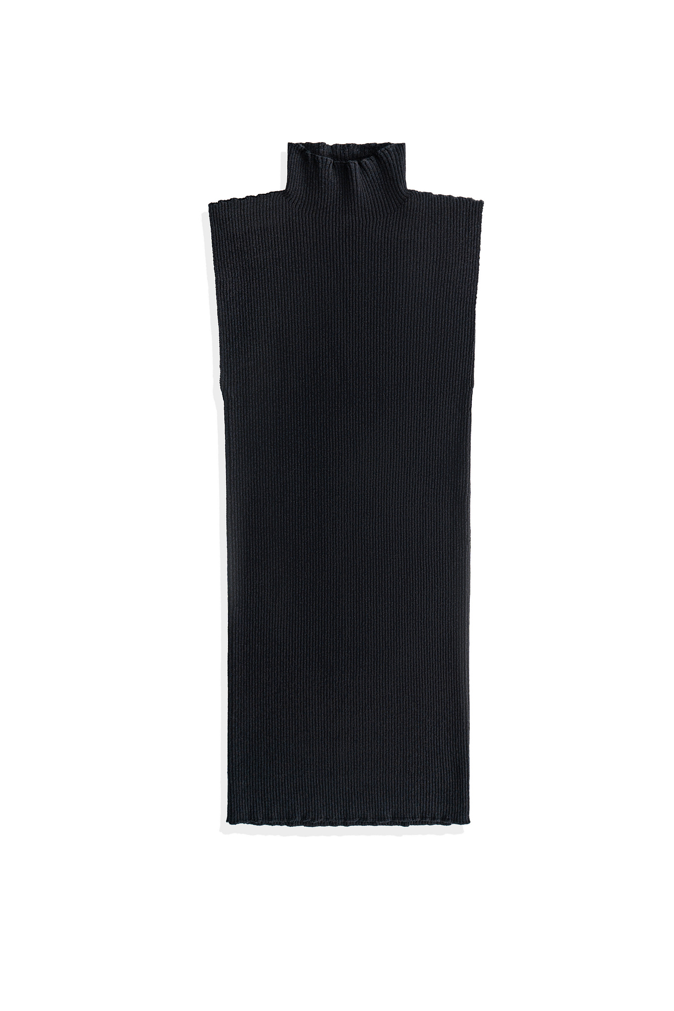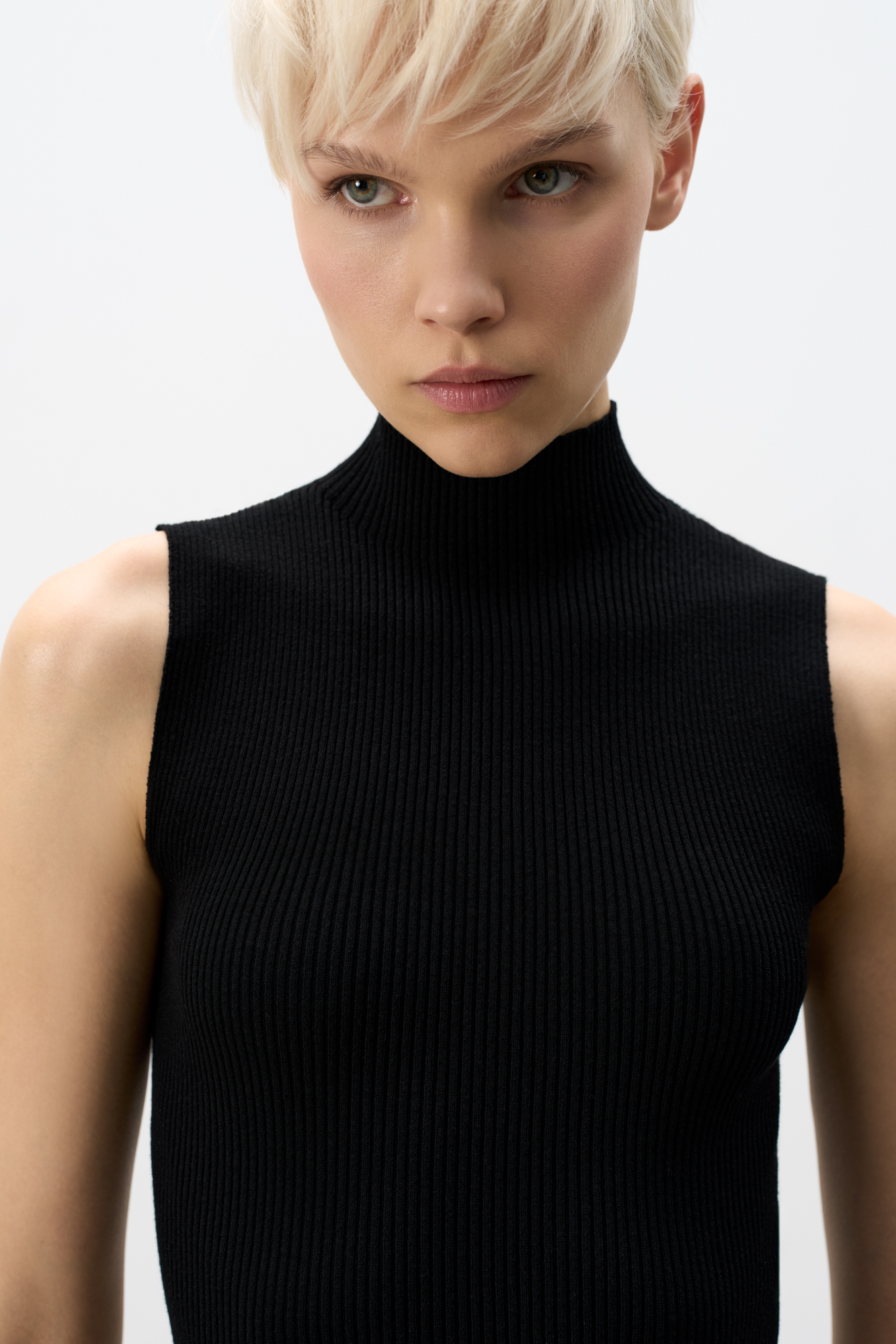 Трикотажный топ из вискозы. Модель приталенного силуэта, без рукавов и невысоким воротником-стойкой.