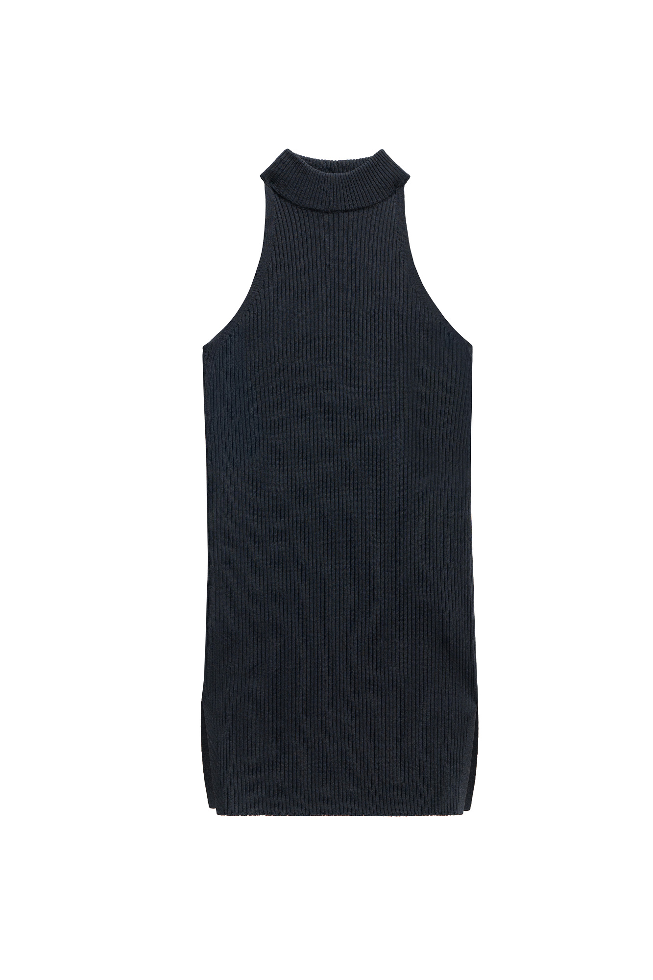 Трикотажный топ из вискозы в рубчик. Модель приталенного силуэта, с американской проймой, высоким воротом, небольшими разрезами по бокам и открытой спиной.