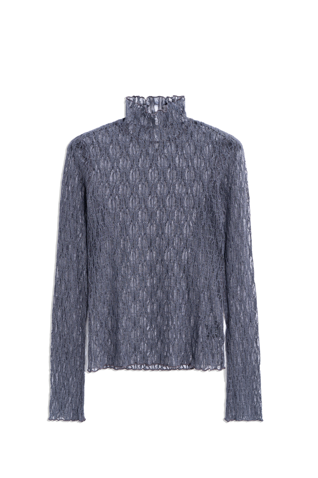 Топ из полупрозрачного кружева. Модель с длинными расклешенными к манжетам рукавами и воротником-стойкой с пуговицами. Изделие без подкладки.