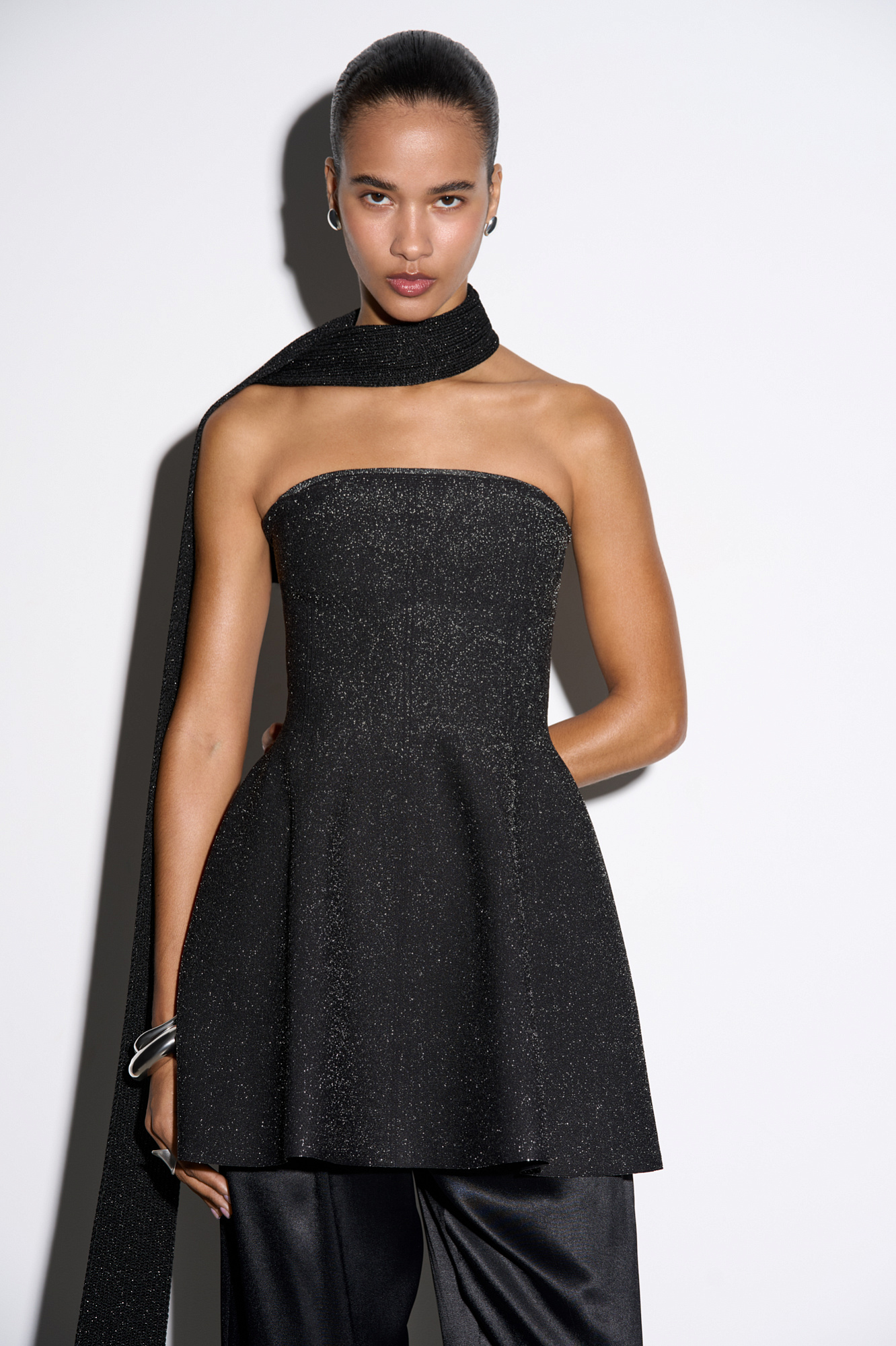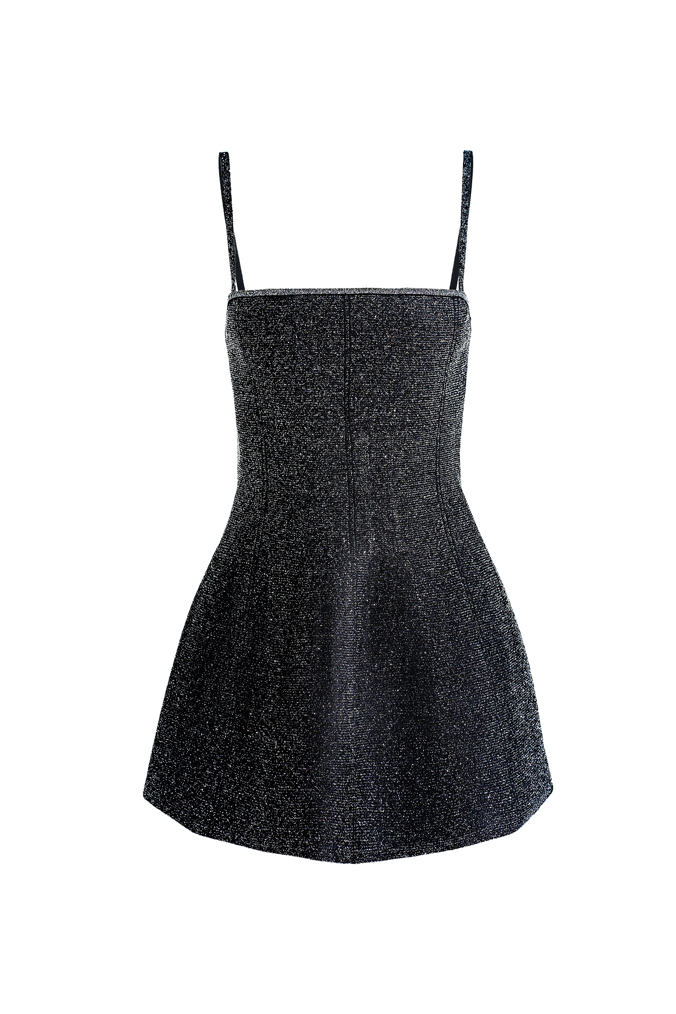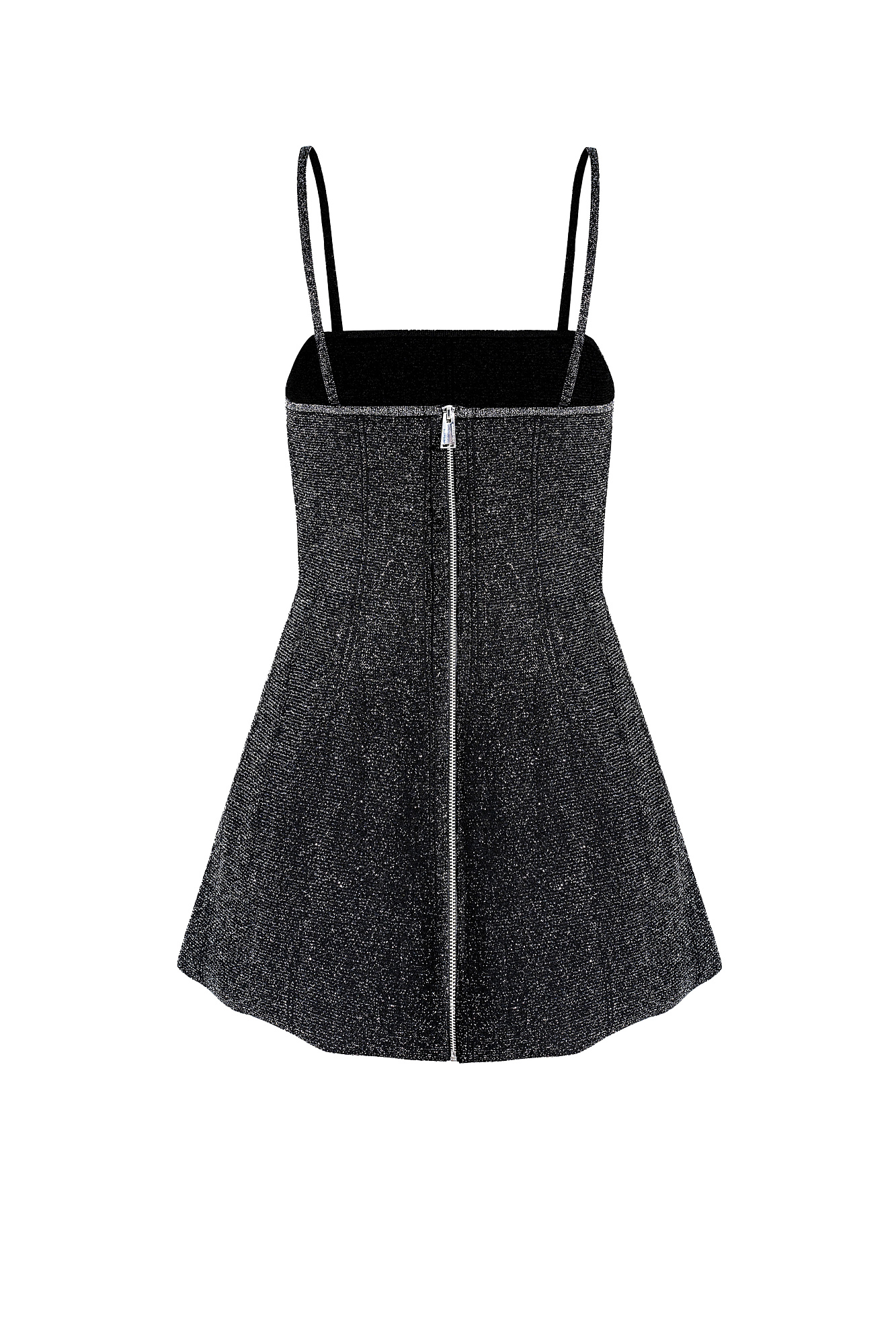 Трикотажный корсет из вискозы с люрексом. Модель удлиненного силуэта, на тонких бретельках. Бретельки отстегиваются. Застежка изделия на молнию на сзади.