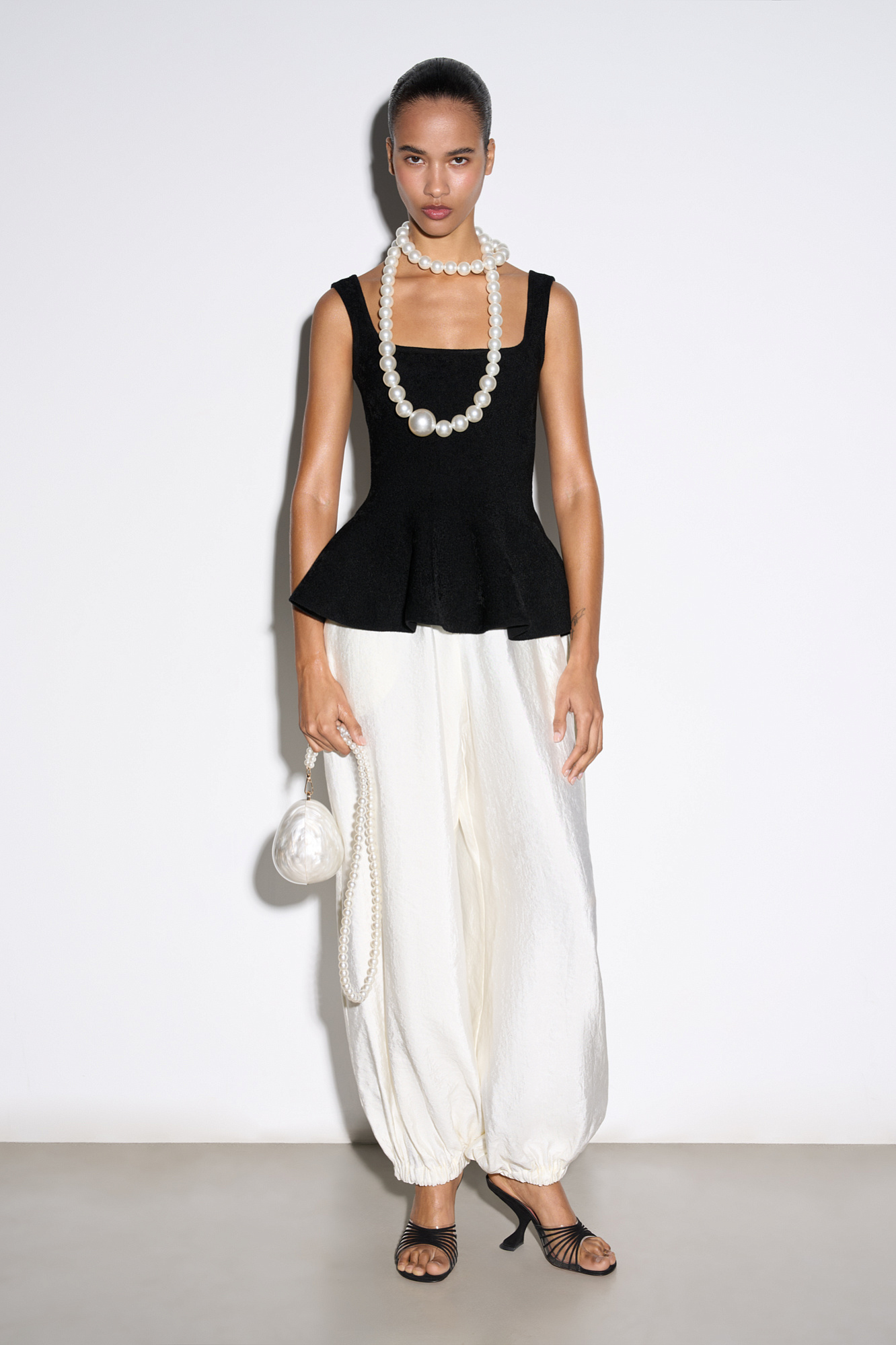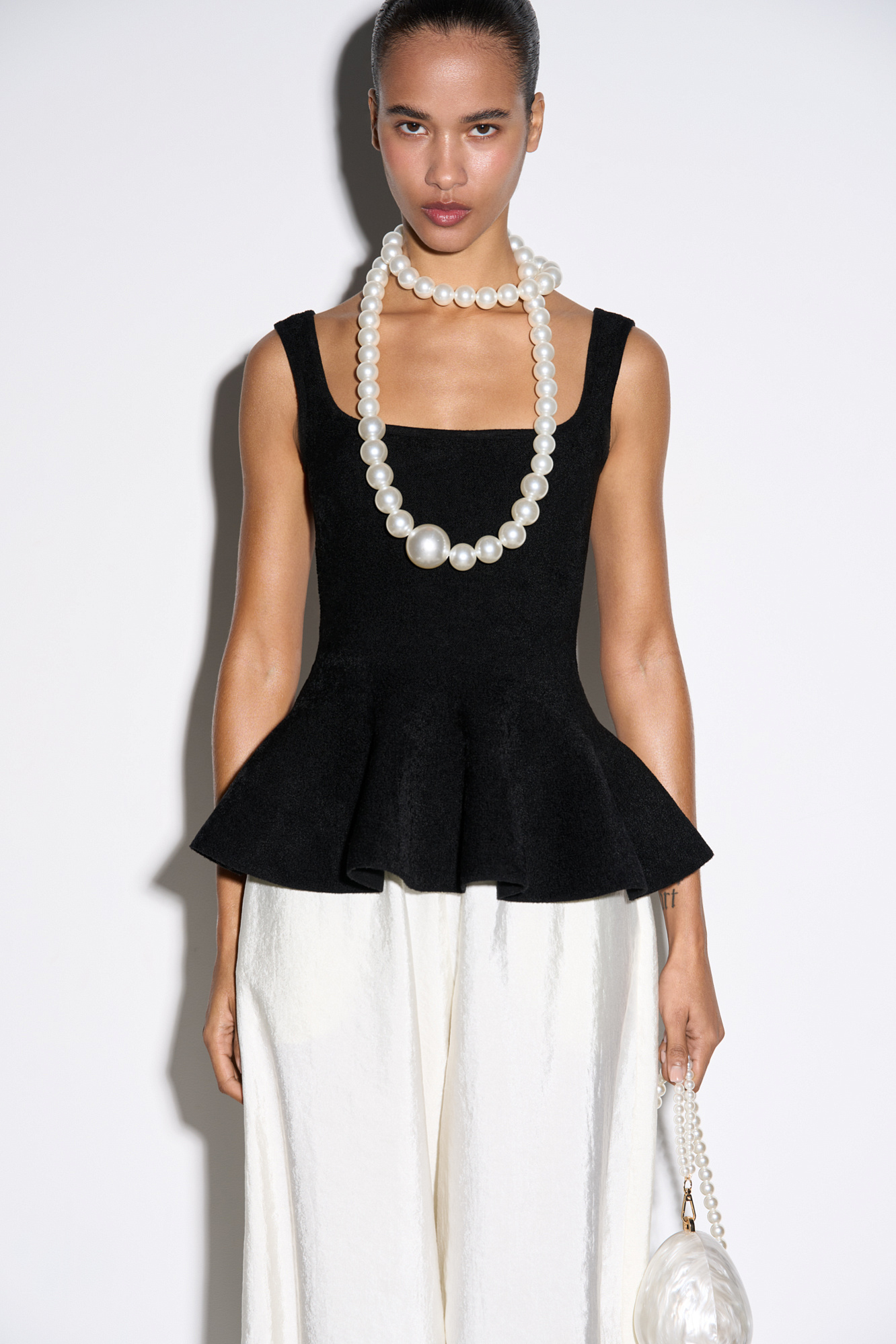 Трикотажный корсет из плотной вискозы. Модель на широких бретельках с баской. Застежка на молнию сзади. Изделие без подкладки.