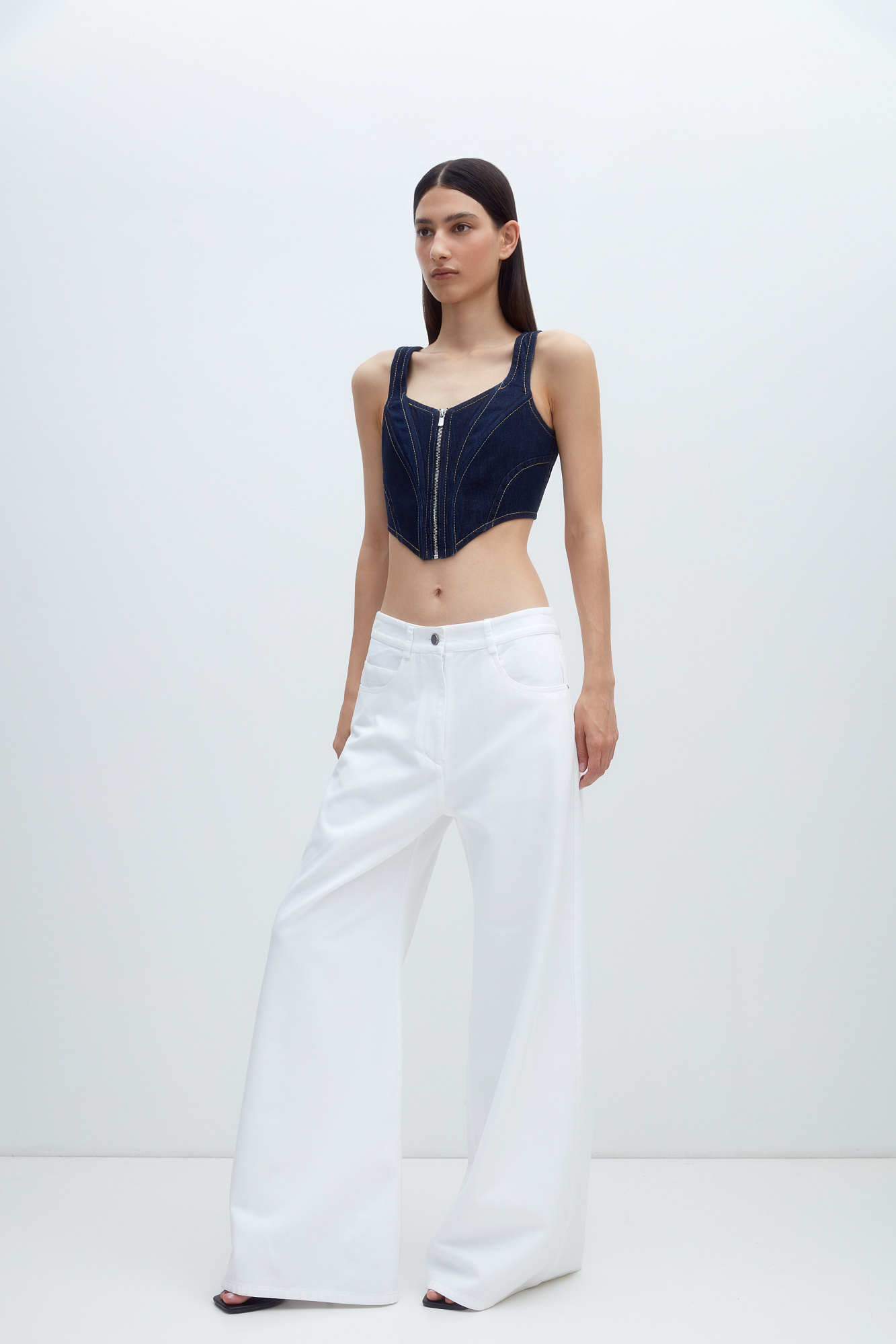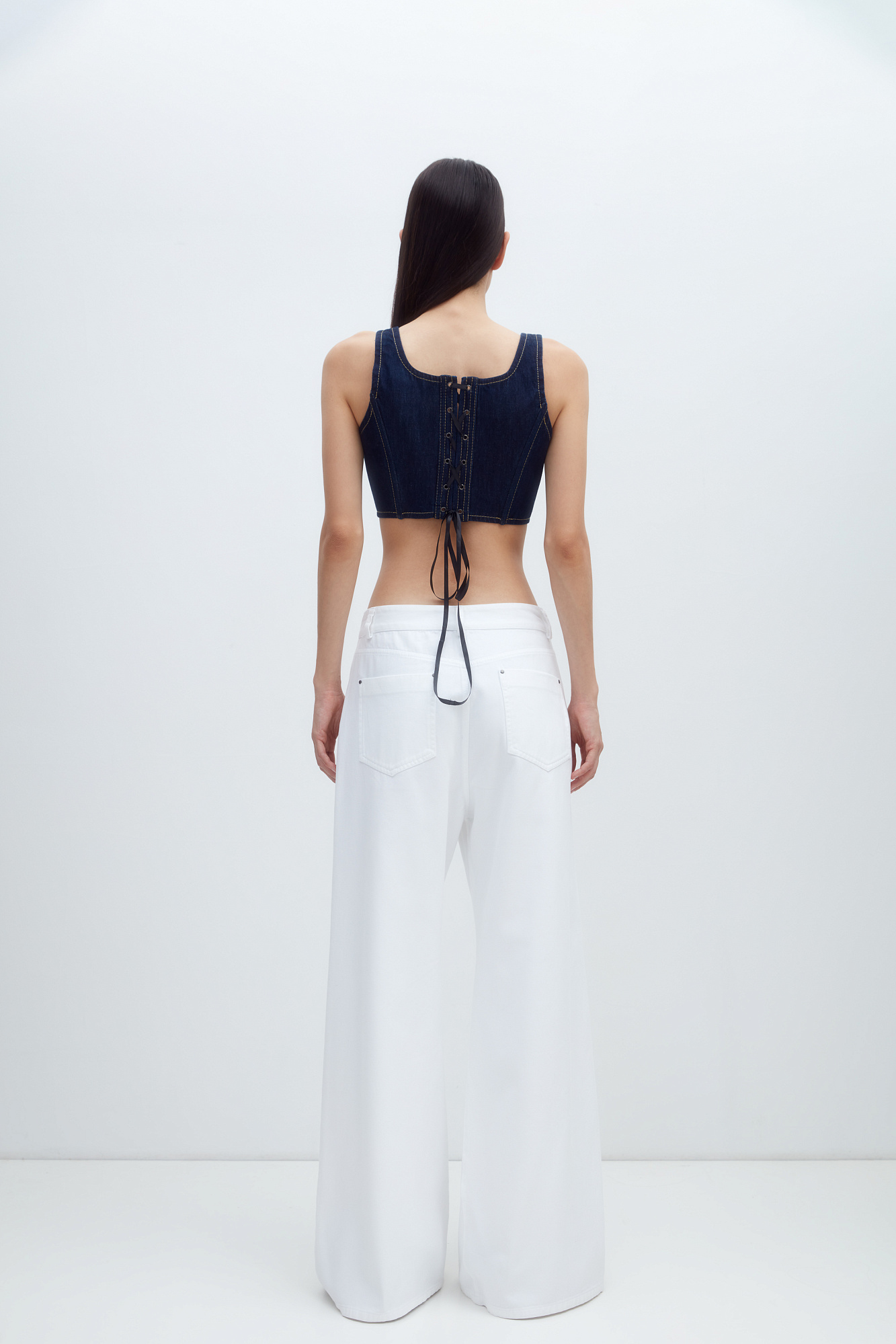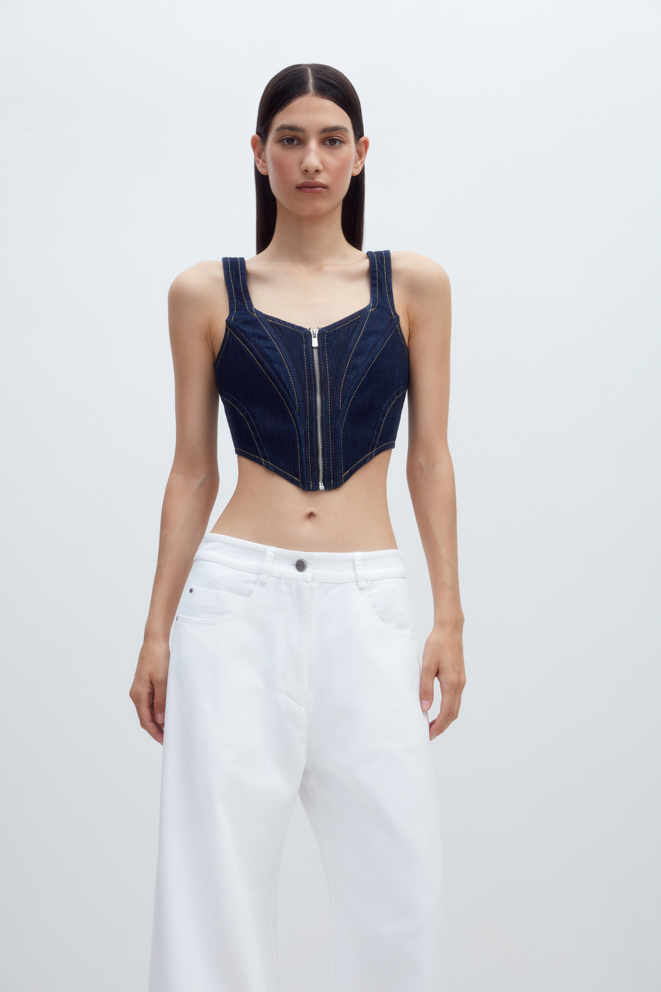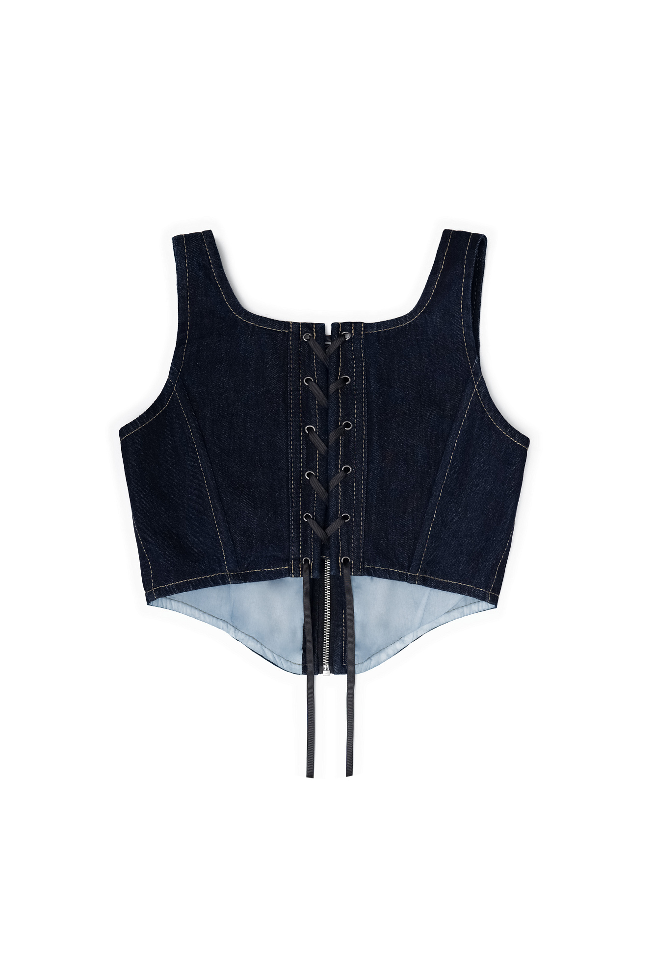 Джинсовый корсет из 100% хлопка с застежкой на молнии и лентой-завязкой на спинке. Дополнить образ можно джинсами и джинсовкой.