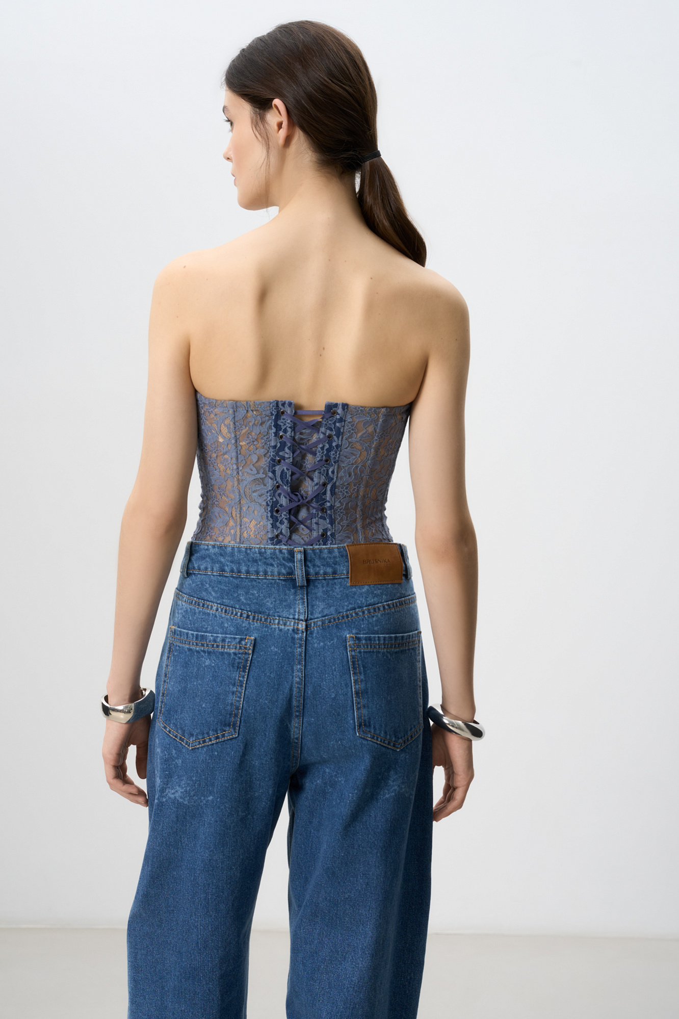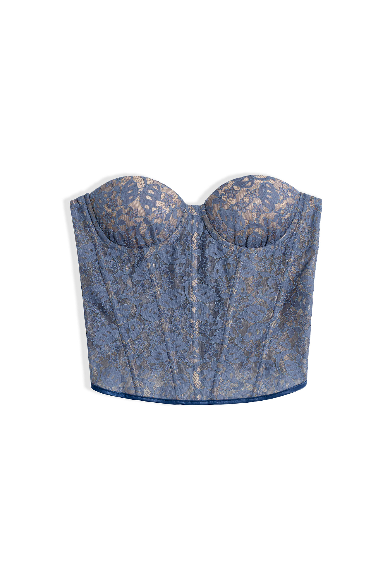 Корсет из тонкого кружева на подкладке телесного цвета. Модель с чашечками и шнуровкой по спинке.