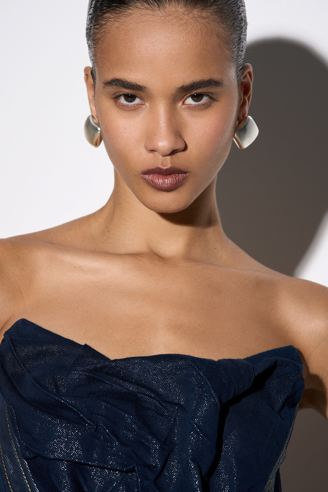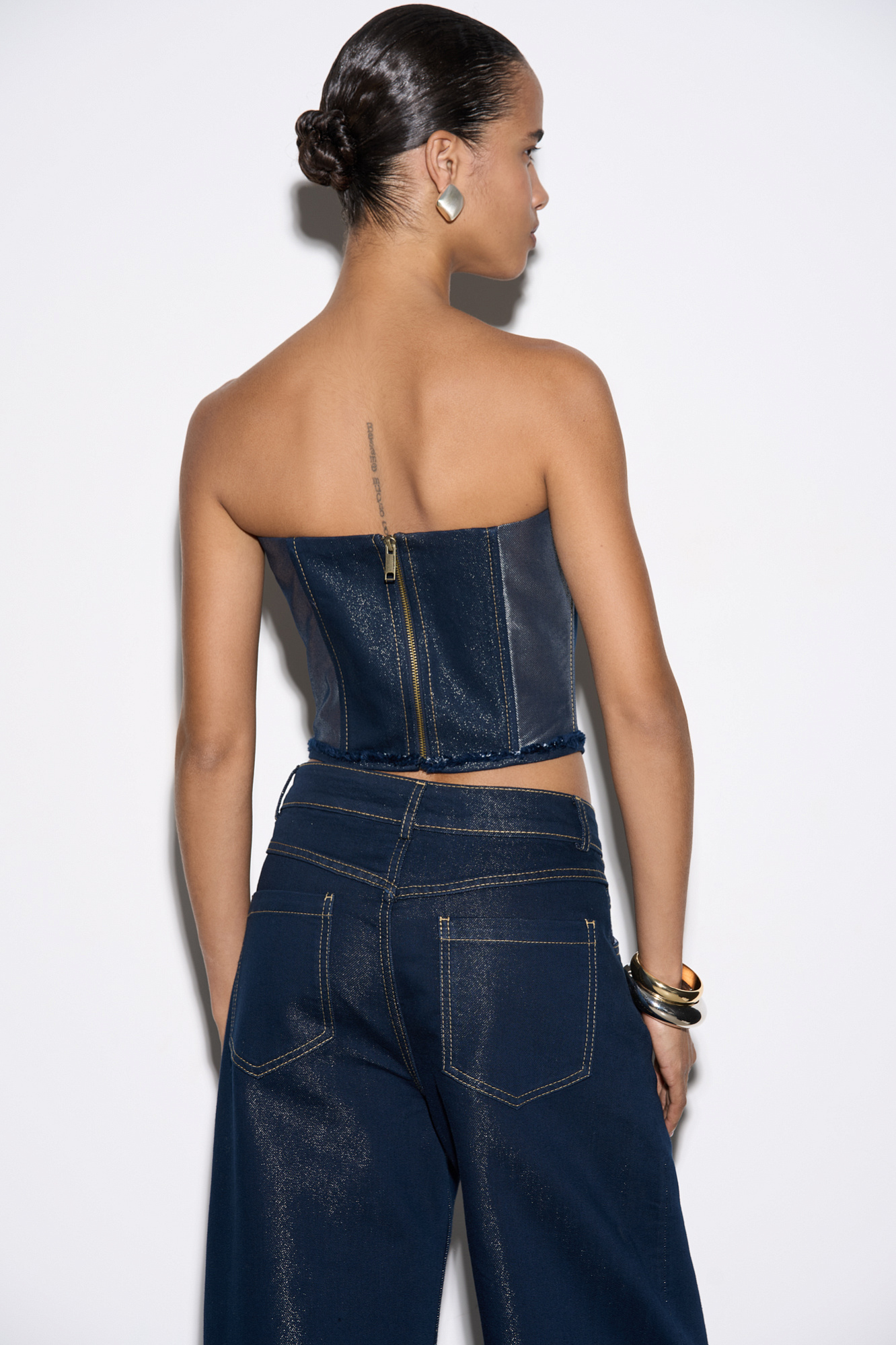 Корсет из денима с металлизированной нитью. Модель без бретелей, с фигурным вырезом декольте и объемным декором. Застежка на молнию.