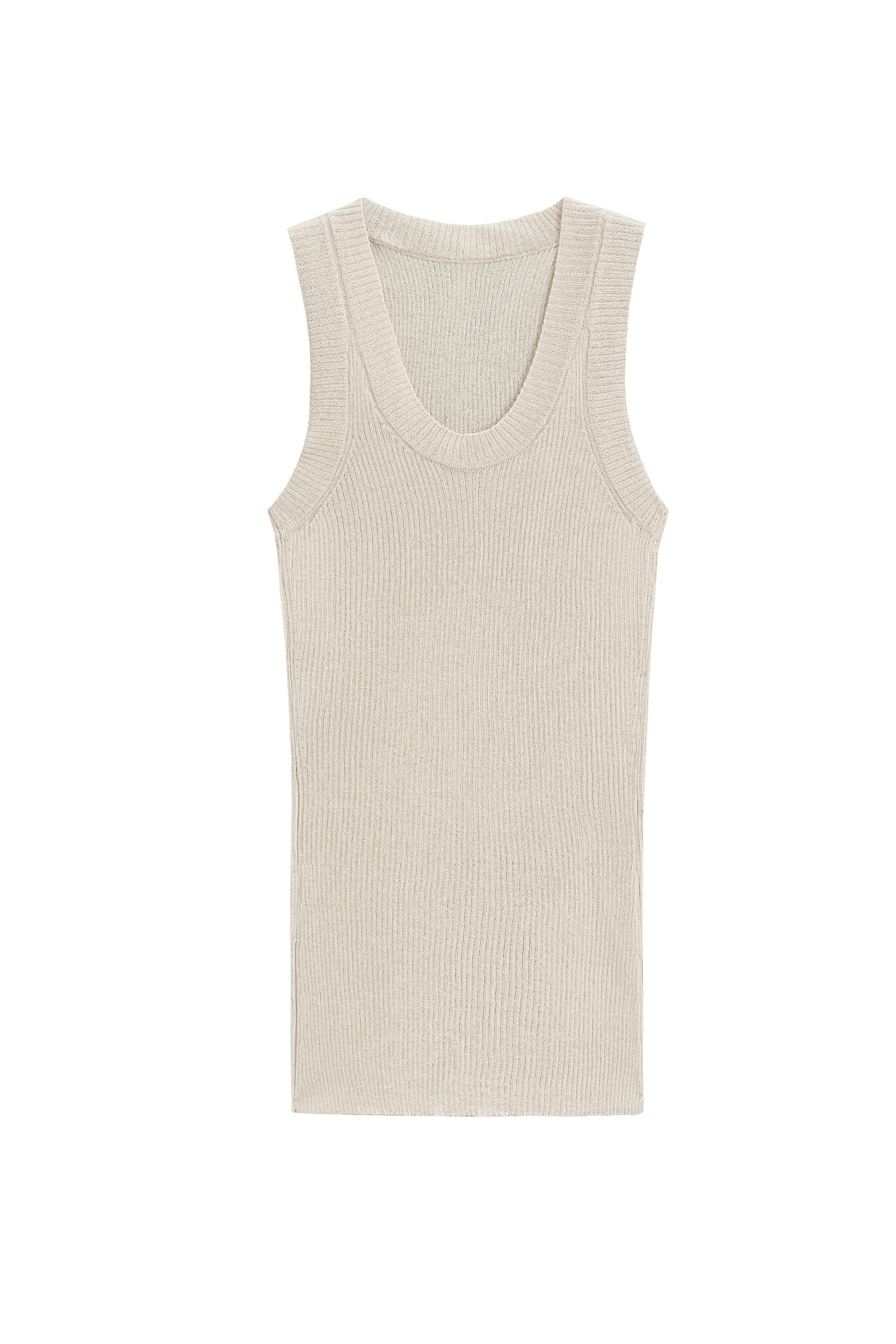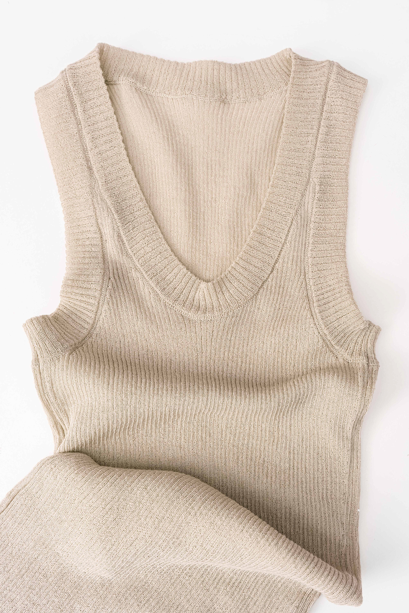 Трикотажный полупрозрачный топ из 100% хлопка. Модель приталенного силуэта, с глубокой проймой и круглым вырезом горловины. Изделие выполнено в рубчик.