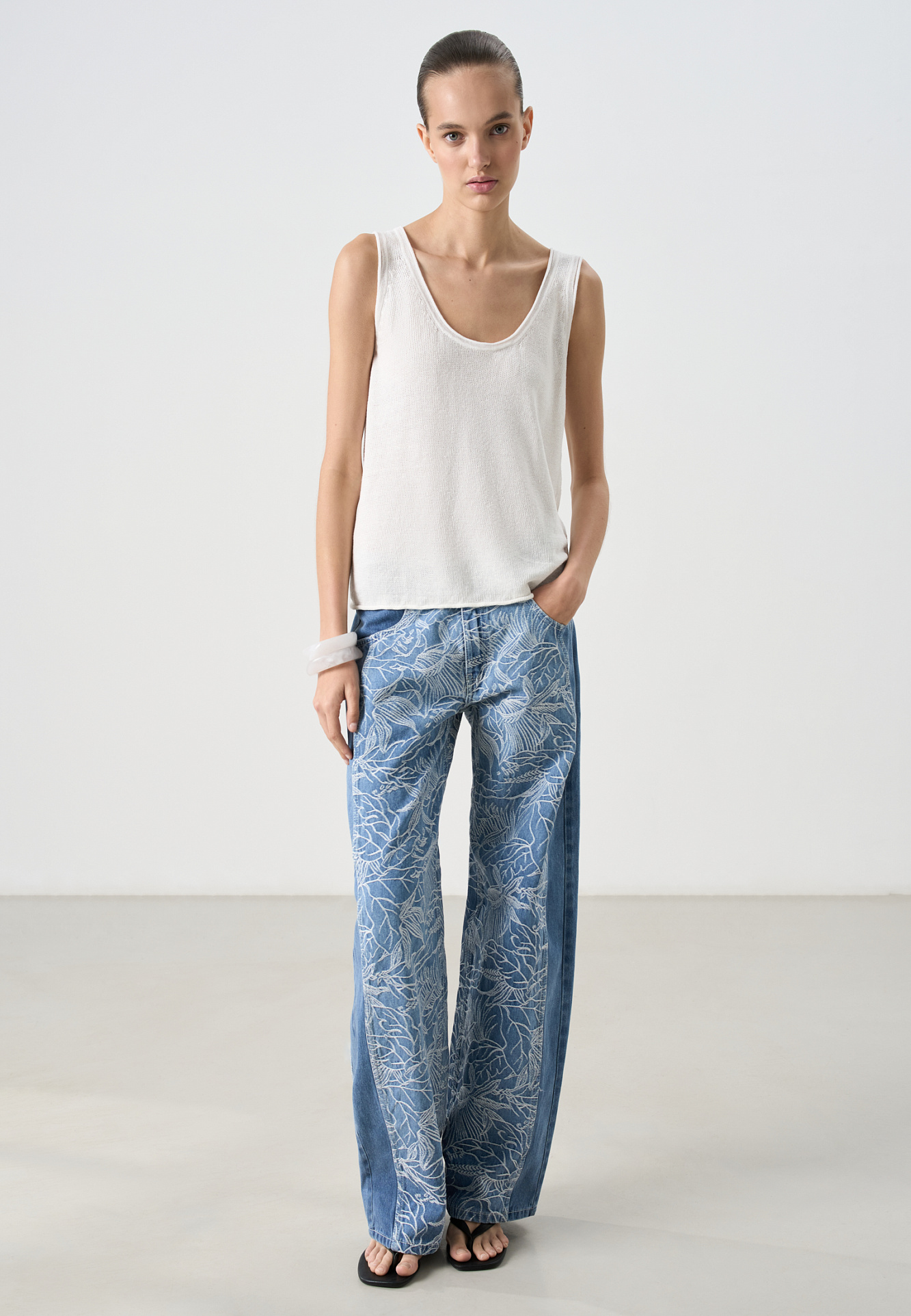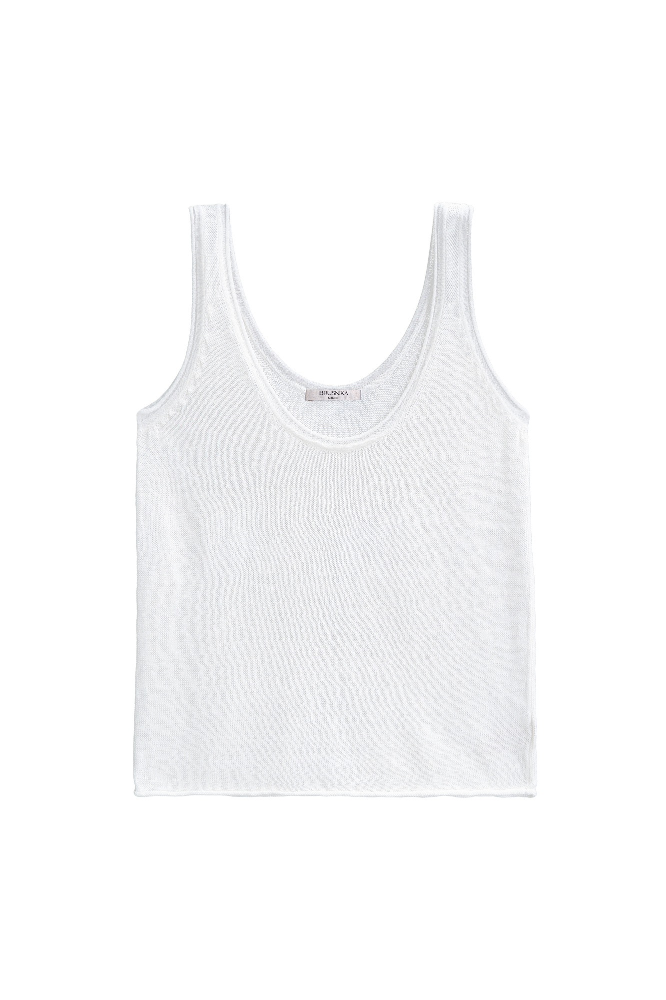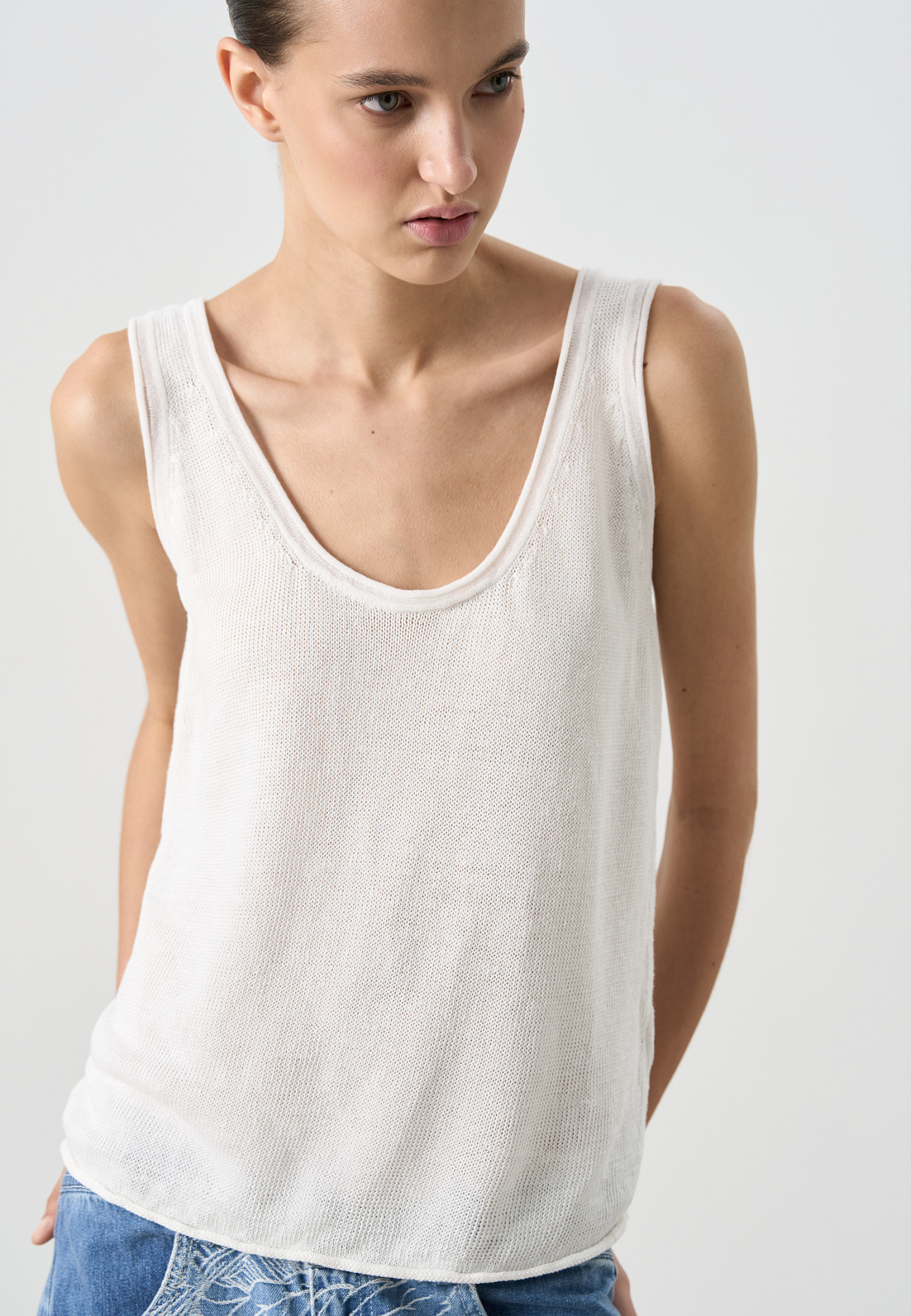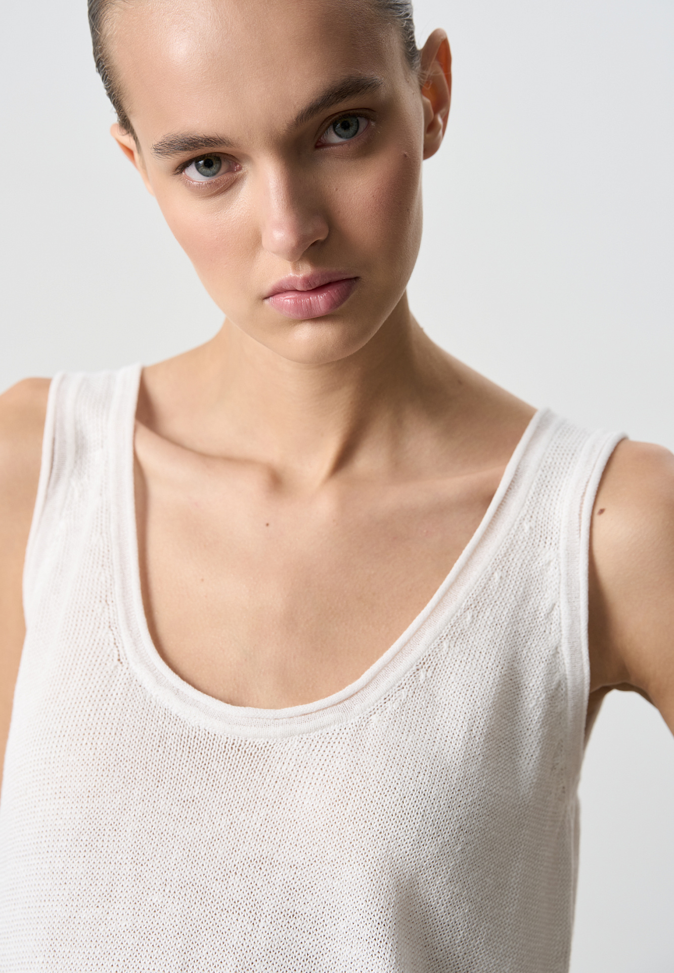 Трикотажный топ из 100% льна. Модель прямого кроя, на широких бретелях, с глубокой проймой и U-образным вырезом горловины. Края изделия выполнены в рубчик.