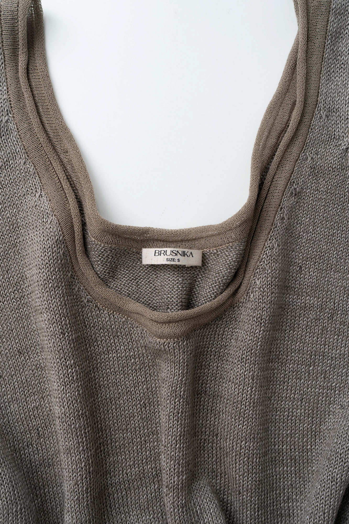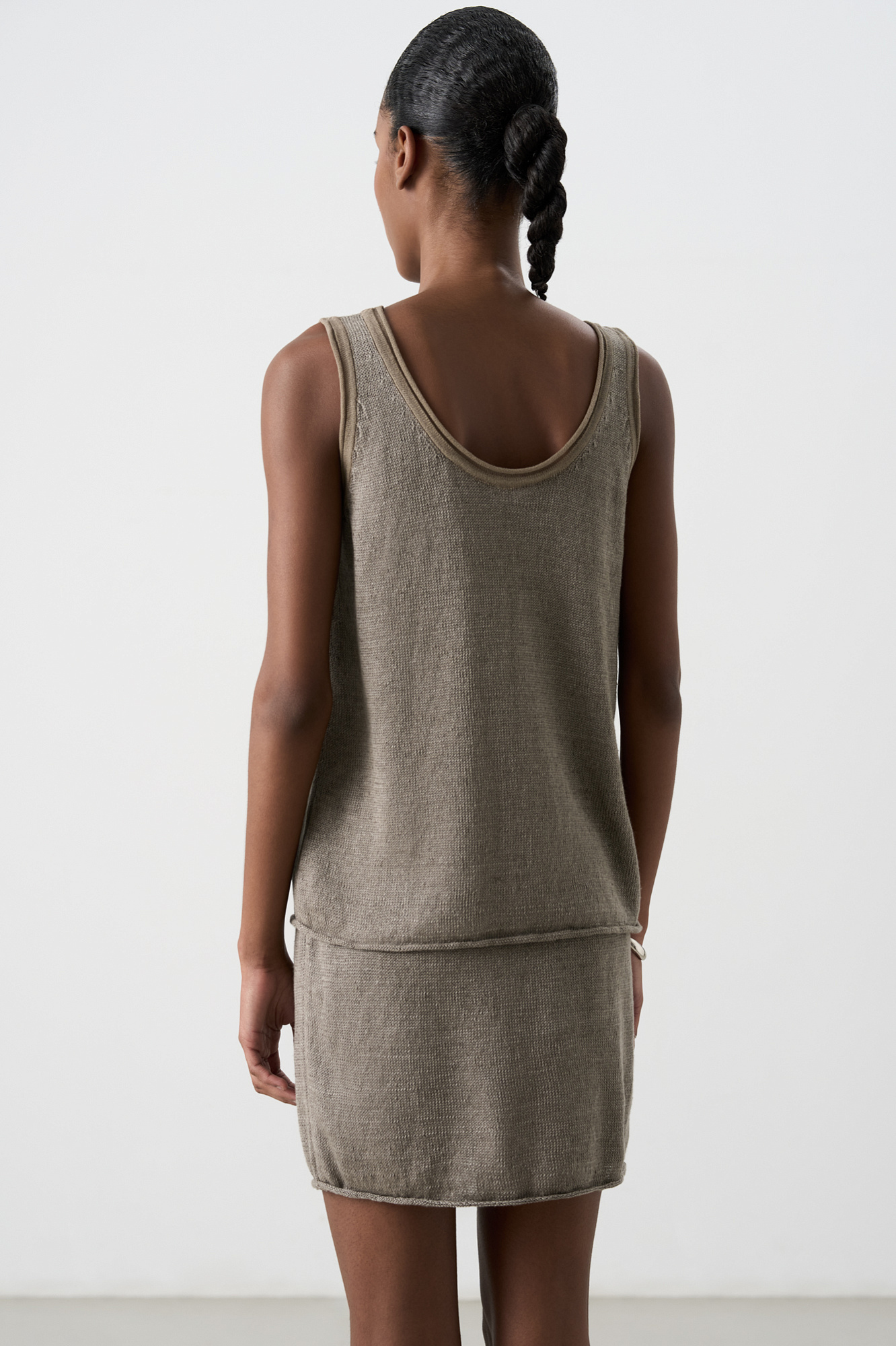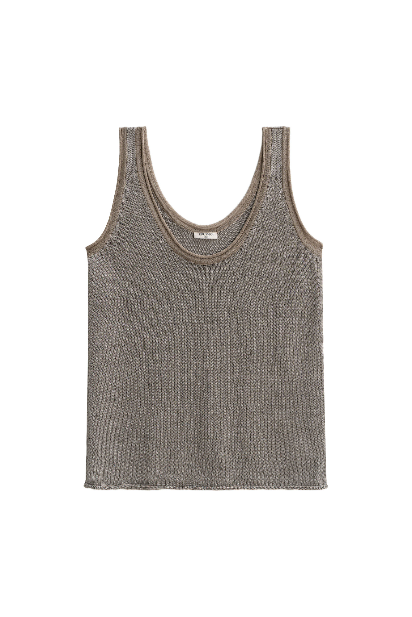 Трикотажный топ из 100% льна. Модель прямого кроя, на широких бретелях, с глубокой проймой и U-образным вырезом горловины. Края изделия выполнены в рубчик.