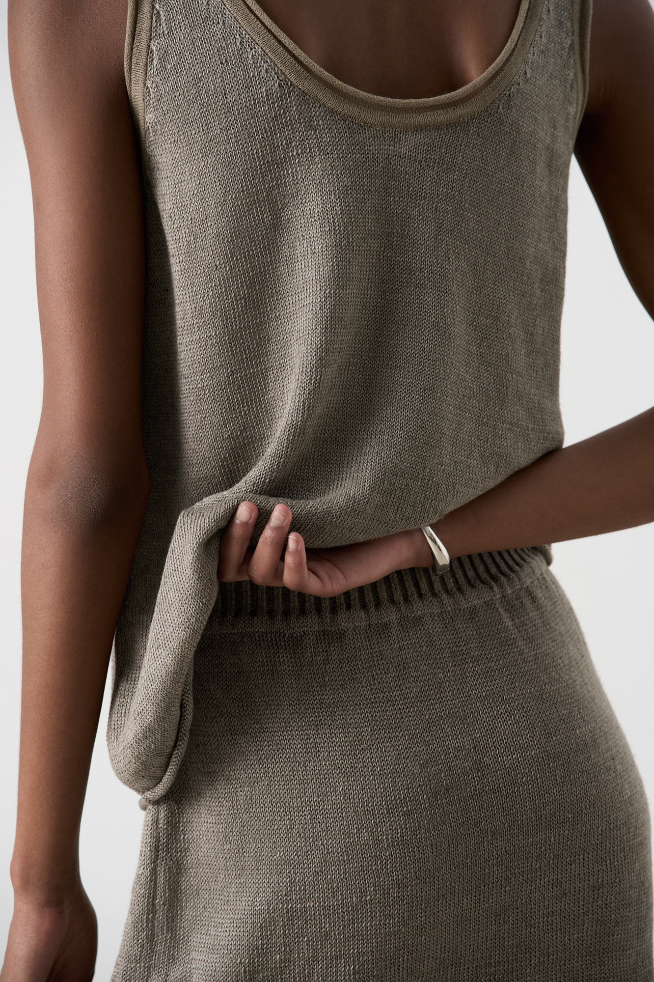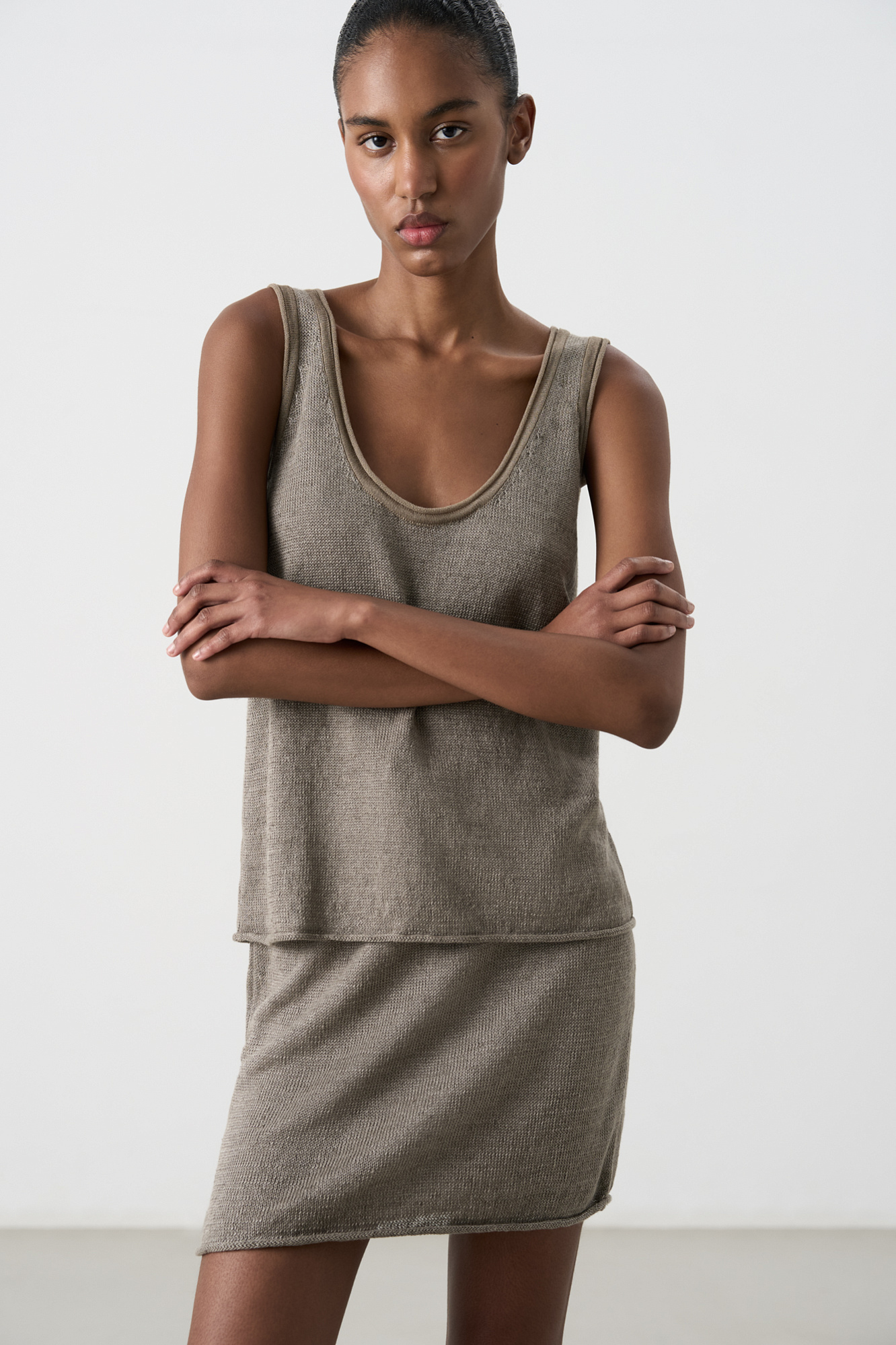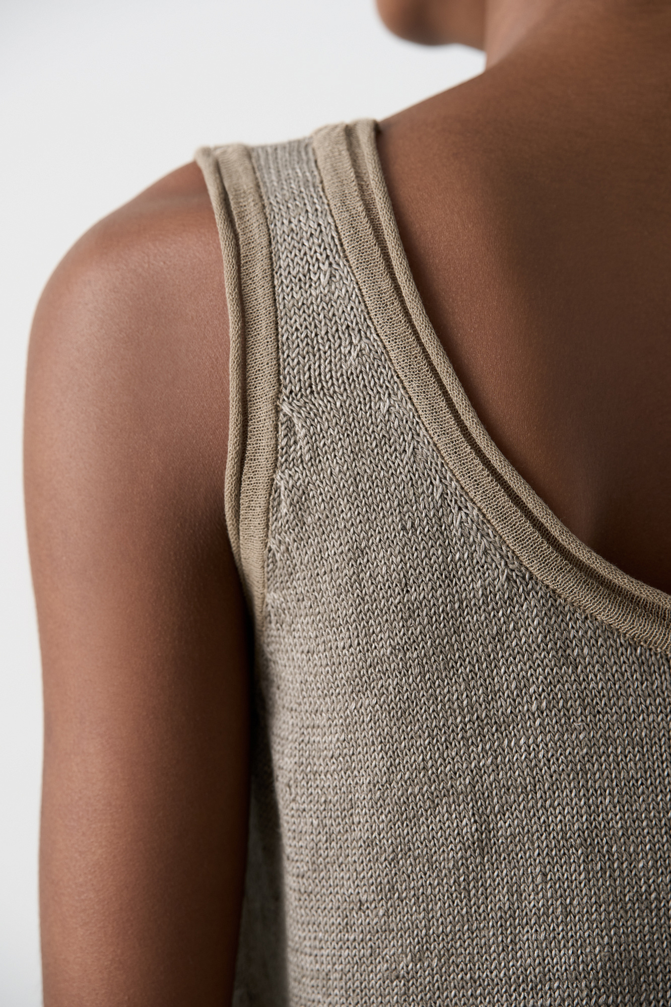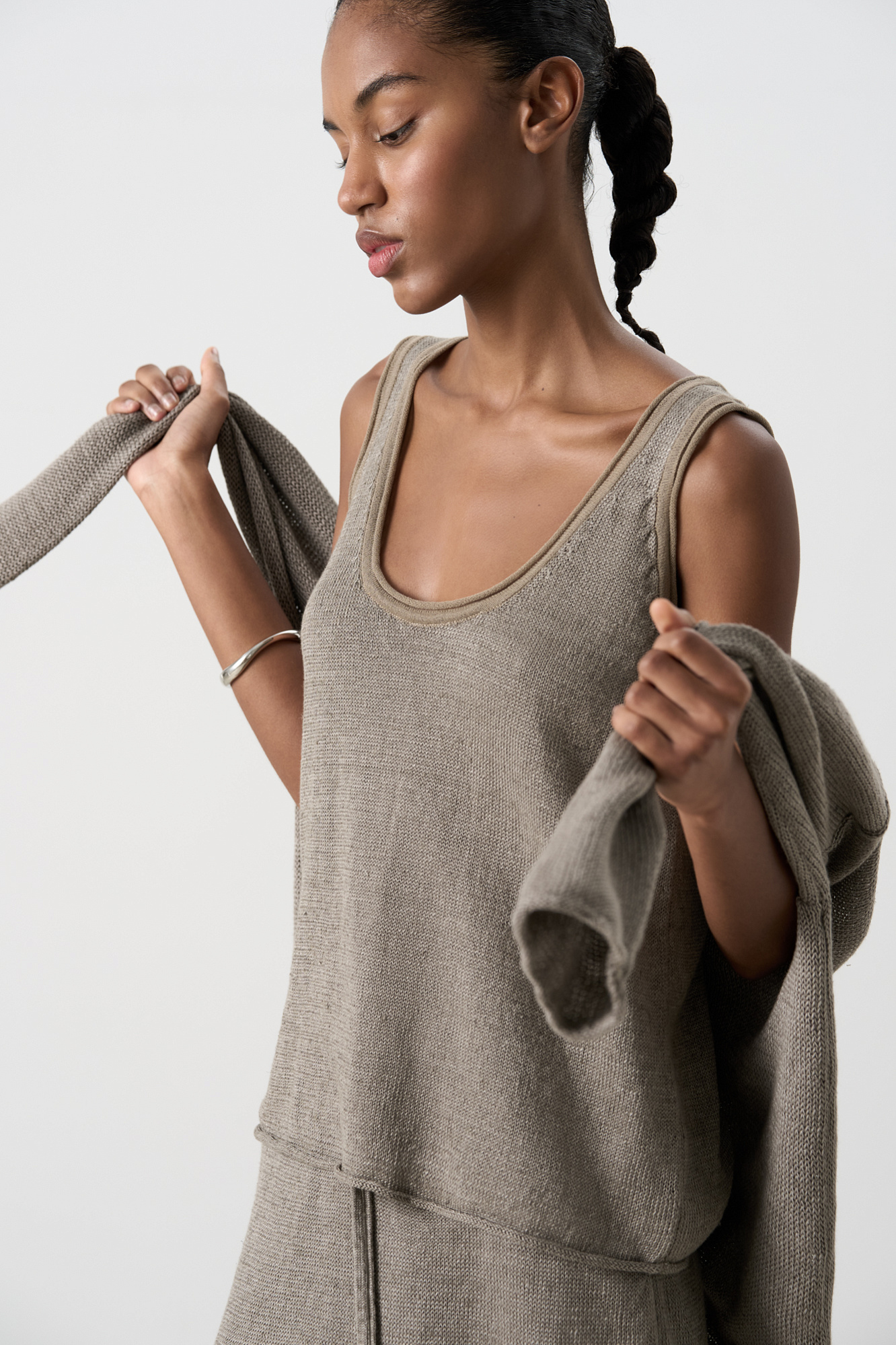 Трикотажный топ из 100% льна. Модель прямого кроя, на широких бретелях, с глубокой проймой и U-образным вырезом горловины. Края изделия выполнены в рубчик.