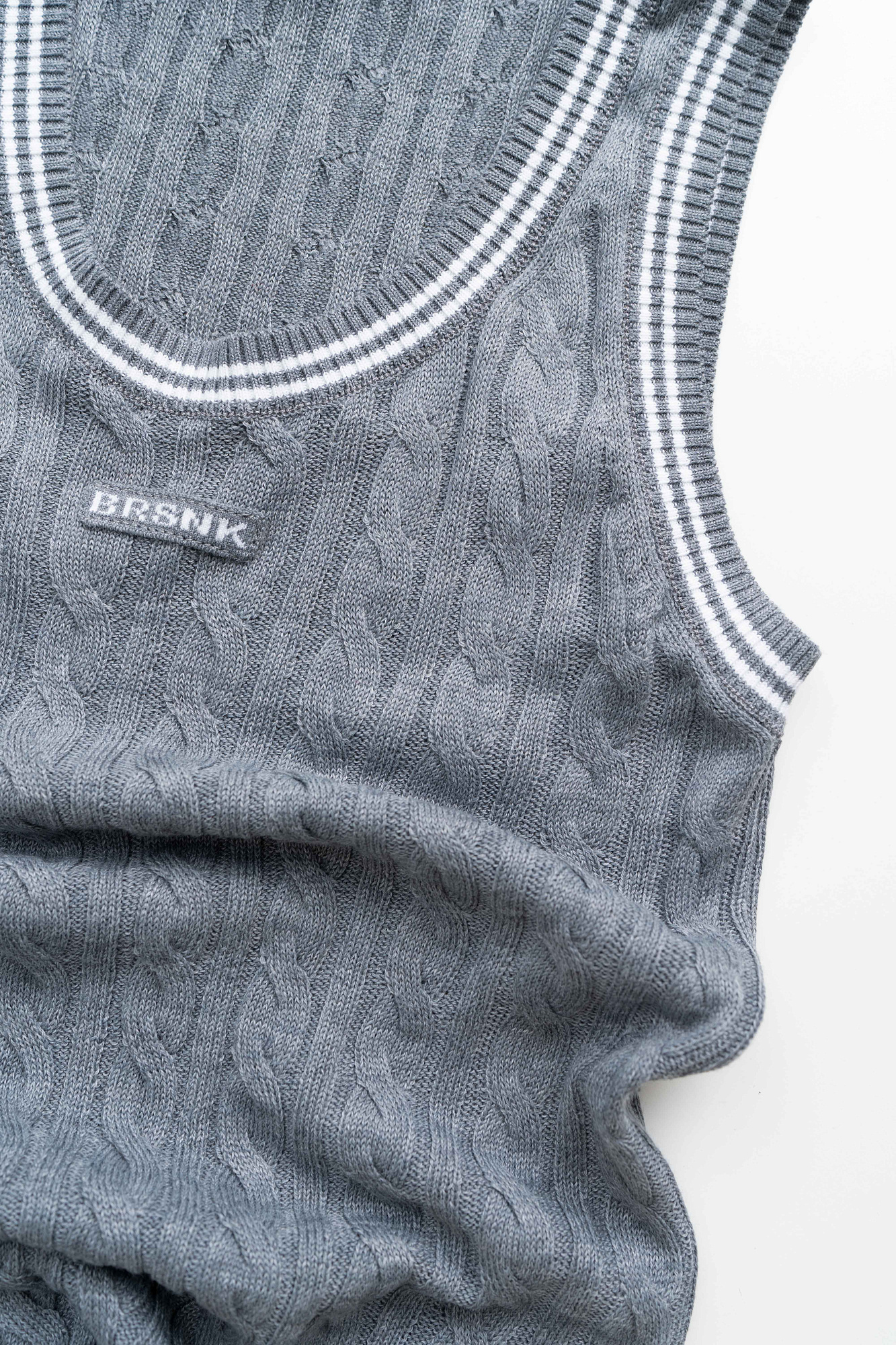 Трикотажная майка из шерсти. Модель свободного силуэта, без рукавов, на широких лямках, с круглым вырезом горловины и глубокой проймой. Изделие выполнено объемной вязкой косами и декорировано контрастным лампасом и логотипом бренда на груди.