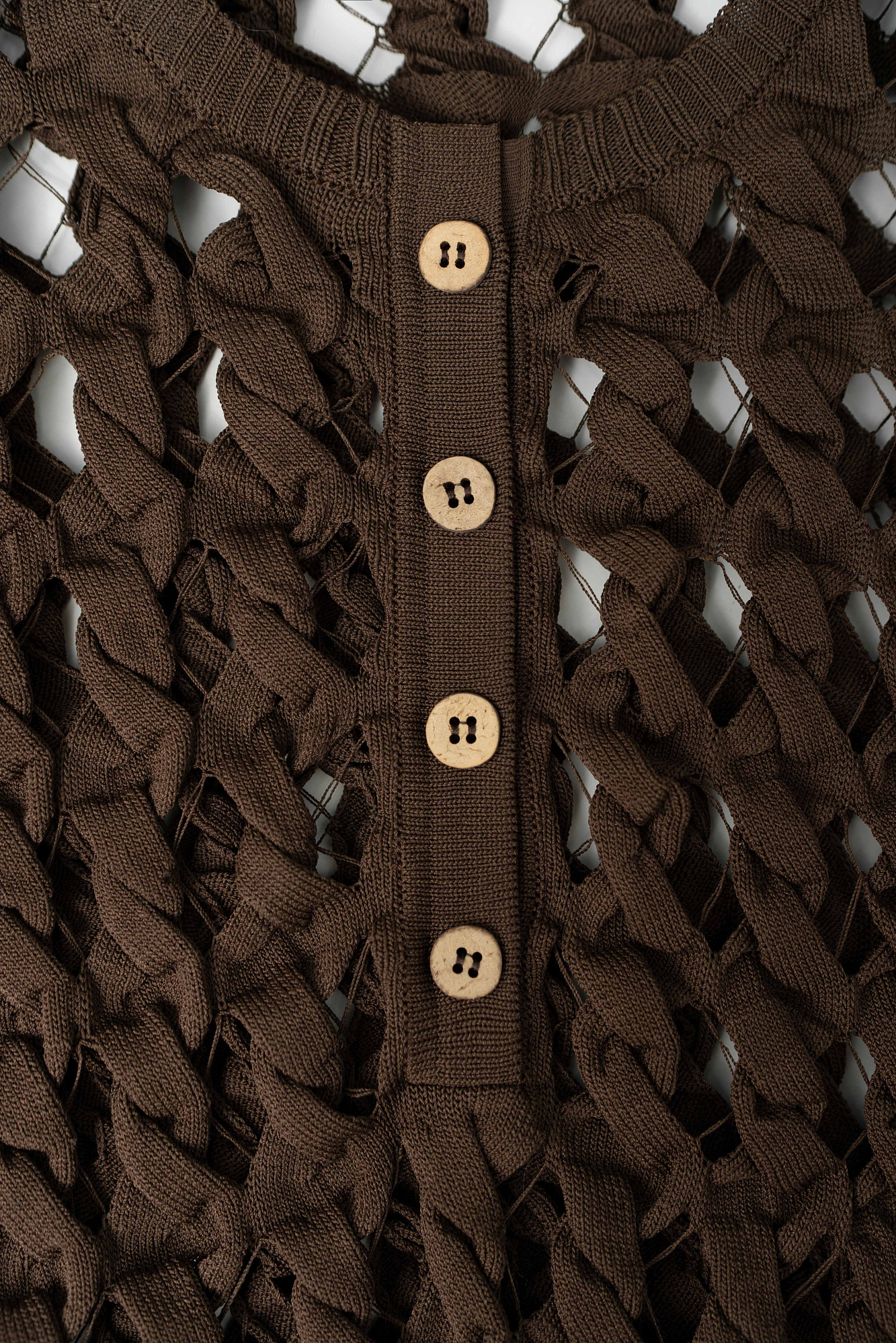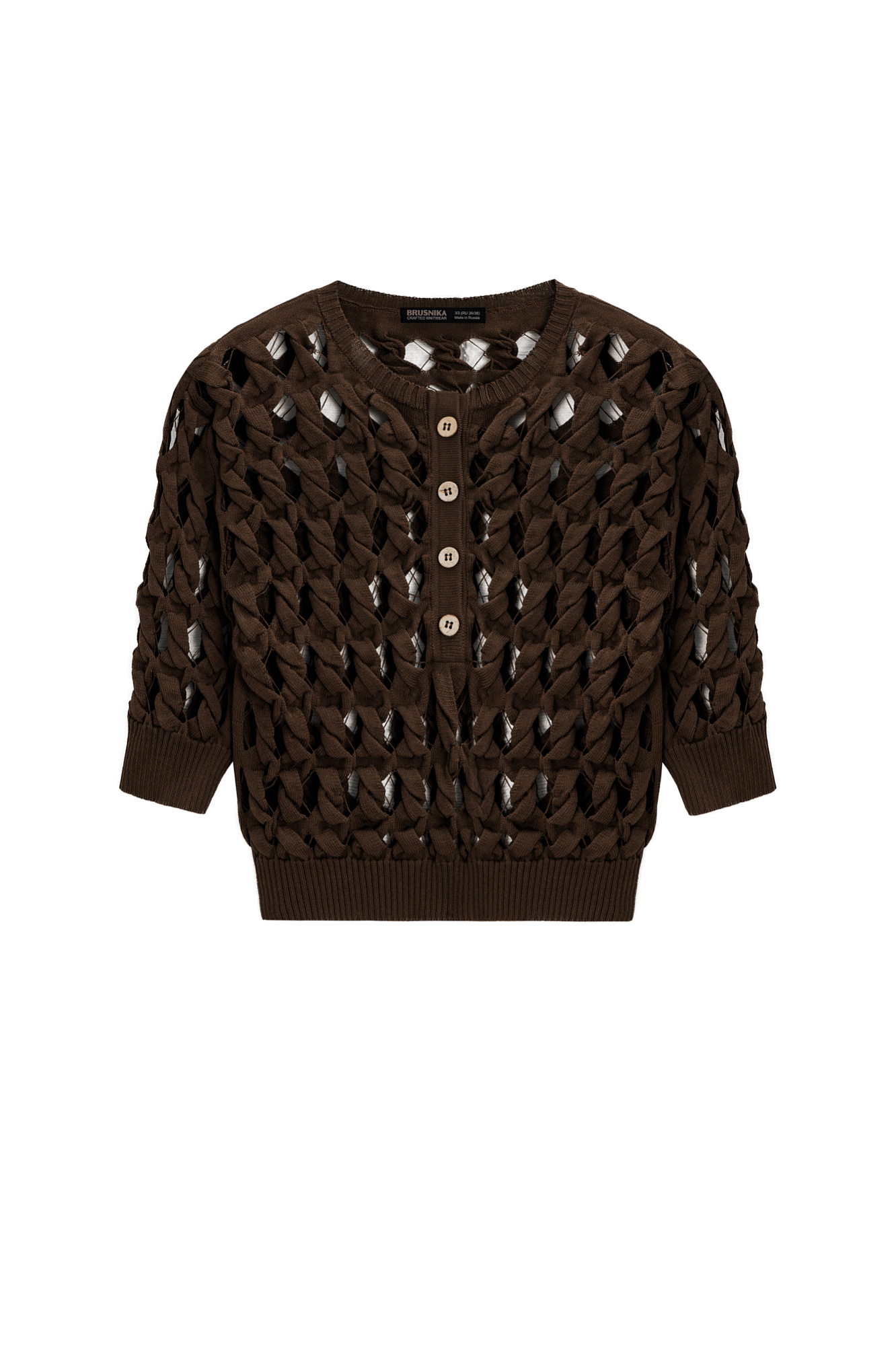 Трикотажный топ с крупным ажурным переплетением. Круглый вырез с планкой на пуговицах. На рукавах и по низу изделия широкая фактурная резинка. В комплекте топ на тонких бретелях.